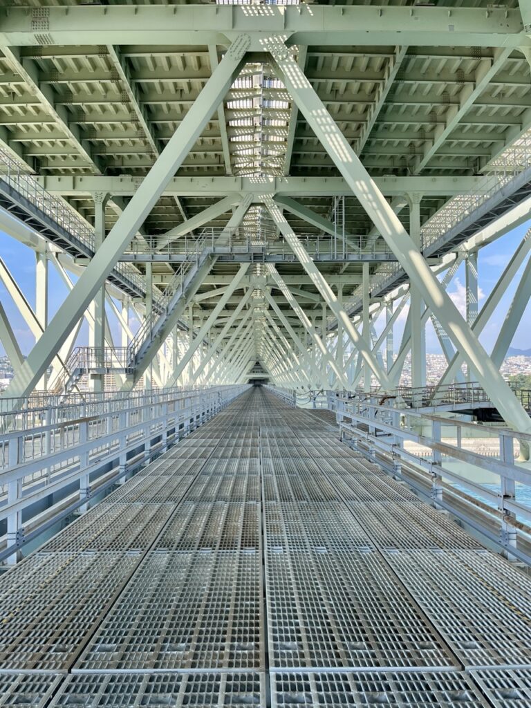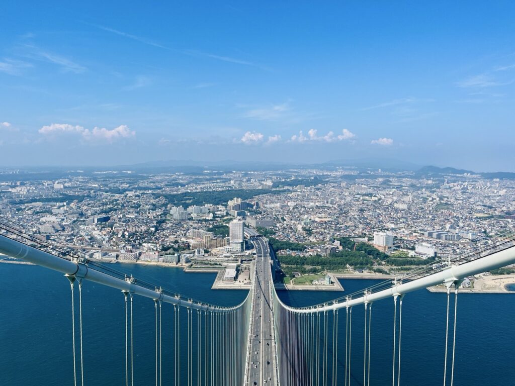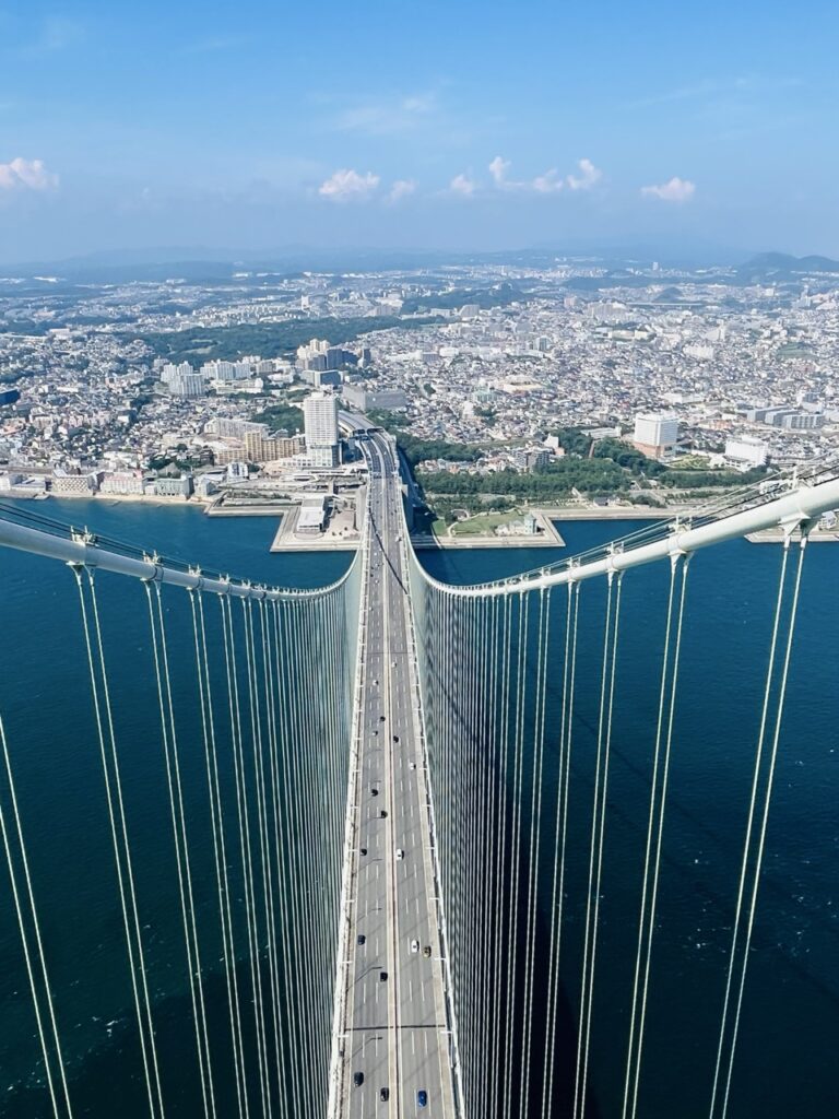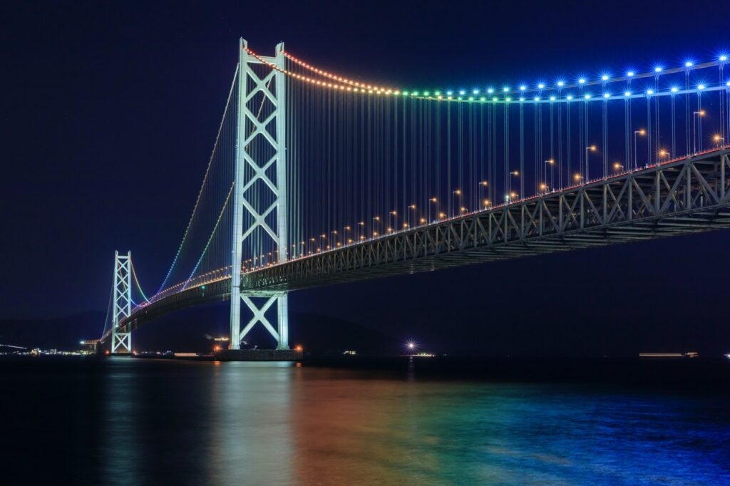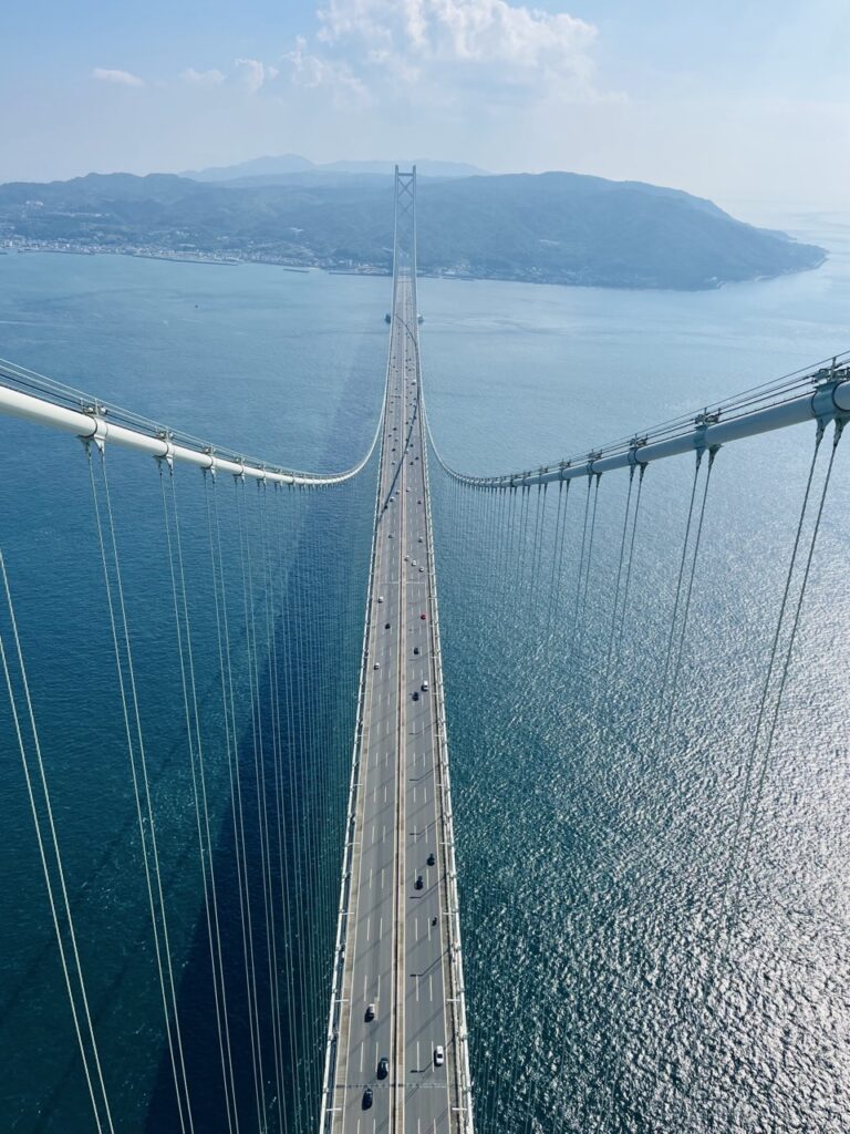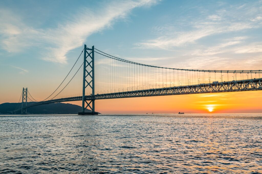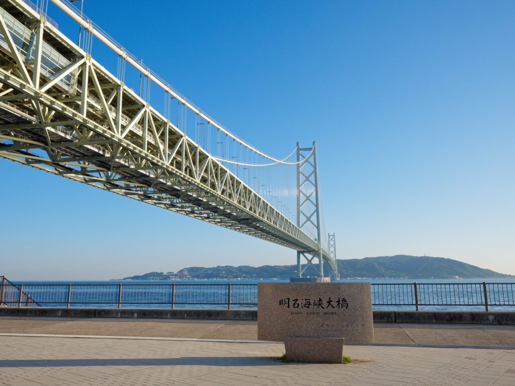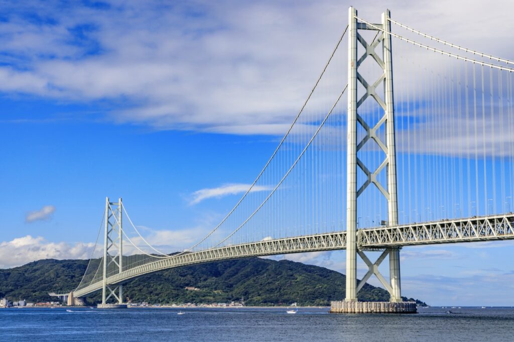 位於兵庫縣的「明石海峽大橋(明石海峡大橋)」,連接著關西本島和淡路島,是現時世界第二長的吊橋。總長 3911 公尺,兩座主塔之間的中央支間長達 1,991 公尺,主塔高約 300 公尺,宛如兩座聳立在海上的巨人,守望著藍色的海峽。