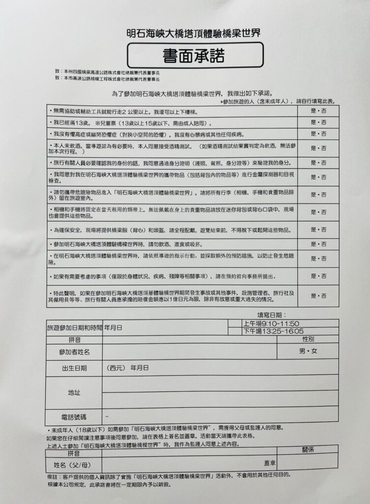 接下來,每位參加者都需要簽署安全誓約書(同樣提供英文、繁體中文、簡體中文或韓文版本)。誓約書上明確列出不適合參加活動的情況,例如有懼高症、幽閉恐懈症,或是飲酒後等狀況,這些都是為了確保每位參加者的安全。
