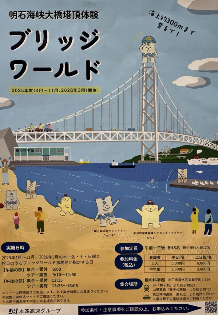 「明石海峽大橋塔頂導覽體驗」是由本四高速舉辦的特別活動,讓參加者有機會登上這座世界級吊橋塔頂。在專業導覽人員的帶領下,旅人能親身體驗這座雄偉建築,並從約 300 公尺的高度,俯瞰明石海峽大橋的壯闊景色。此活動自開辦以來深受國內外遊客歡迎。