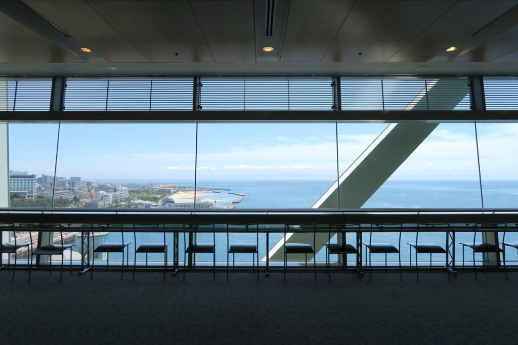 八樓的室內觀景廳提供舒適的座位,可以悠閒地欣賞明石海峽大橋的壯麗景色。