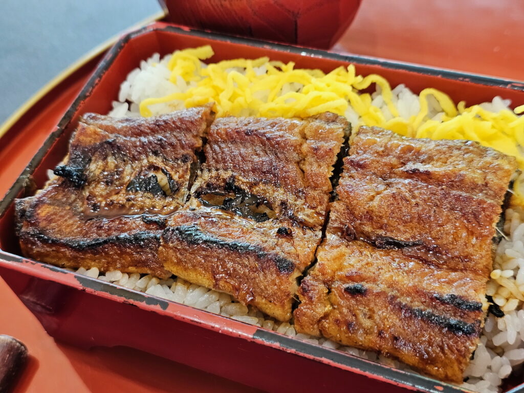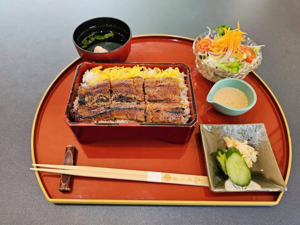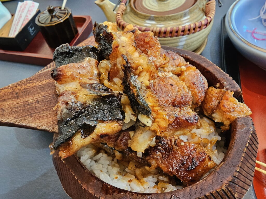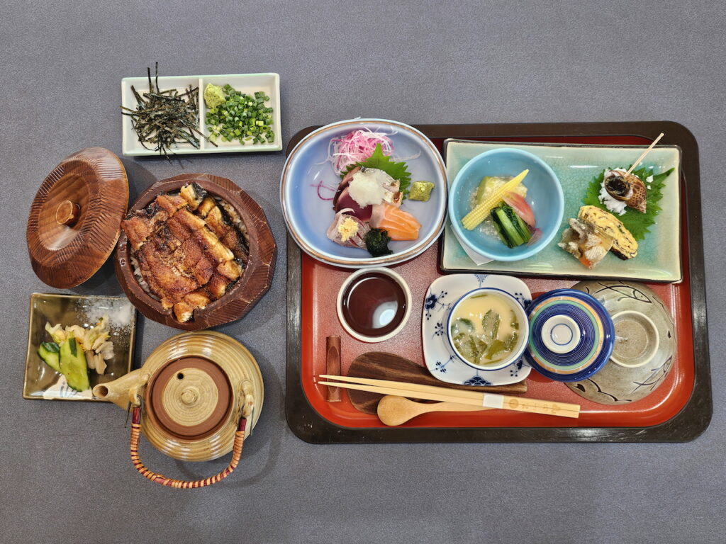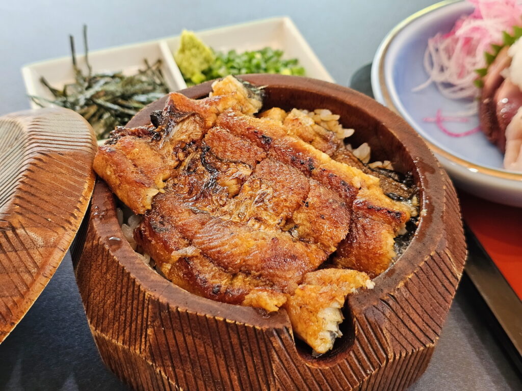 午餐時段最受歡迎的是「鰻魚蓋飯御膳」(ひつまぶし膳),內容包含前菜、刺身、茶碗蒸、醃漬小菜與高湯。主菜「ひつまぶし」可分四種吃法:原味、加藥味、茶泡飯,以及自由搭配。價格約4,000日圓,份量與味道都相當有誠意。