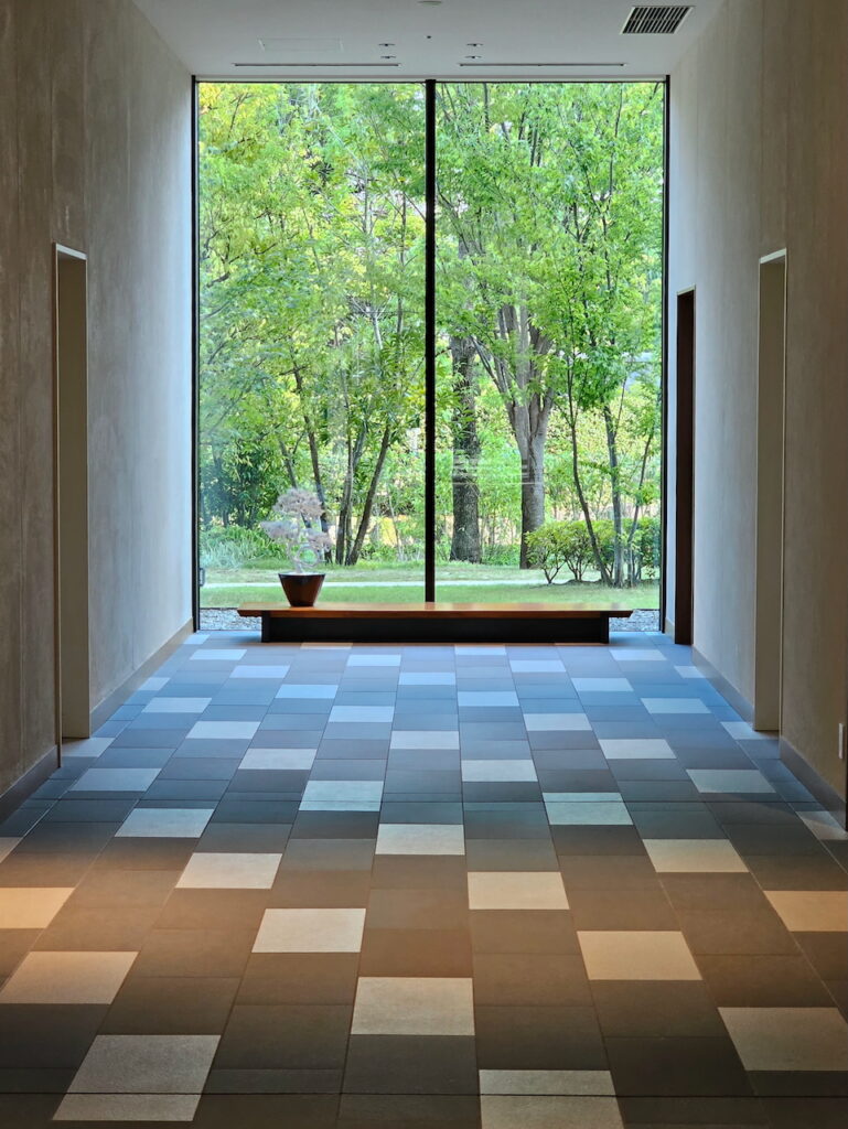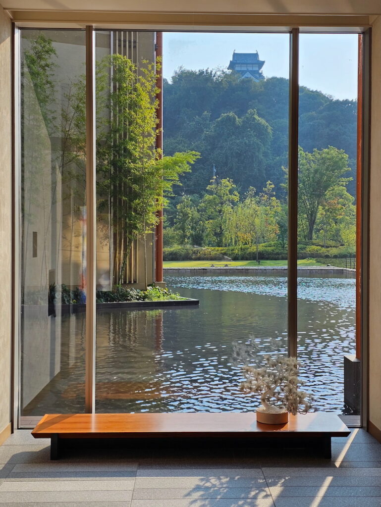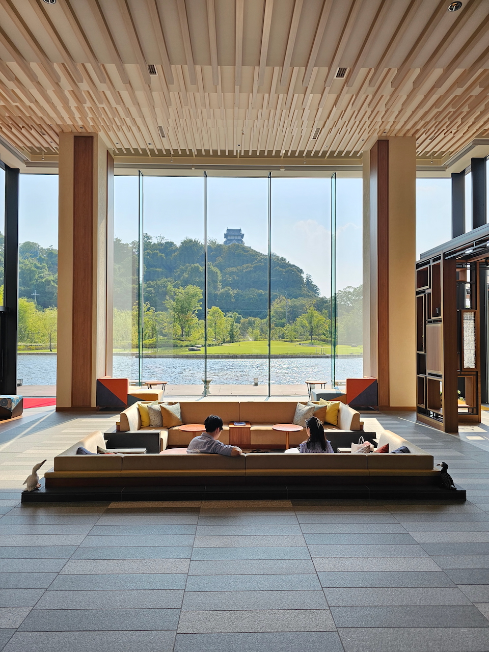 大廳以開闊玻璃帷幕接納自然光,回望便是犬山城與木曾川岸的寧靜景致。