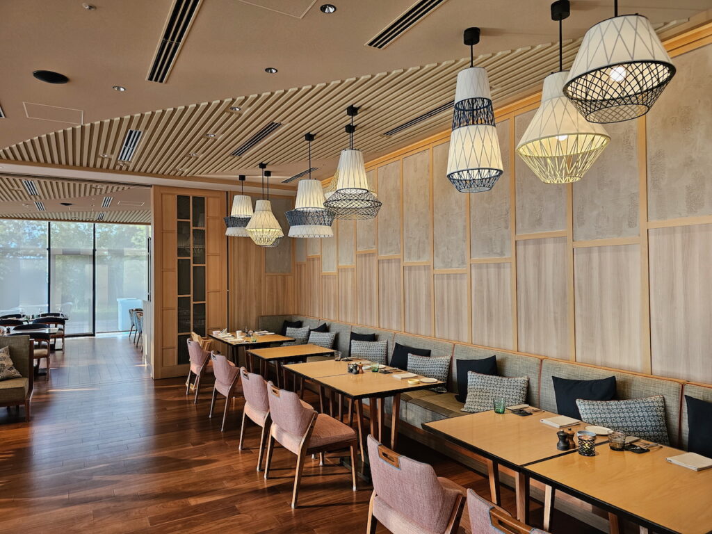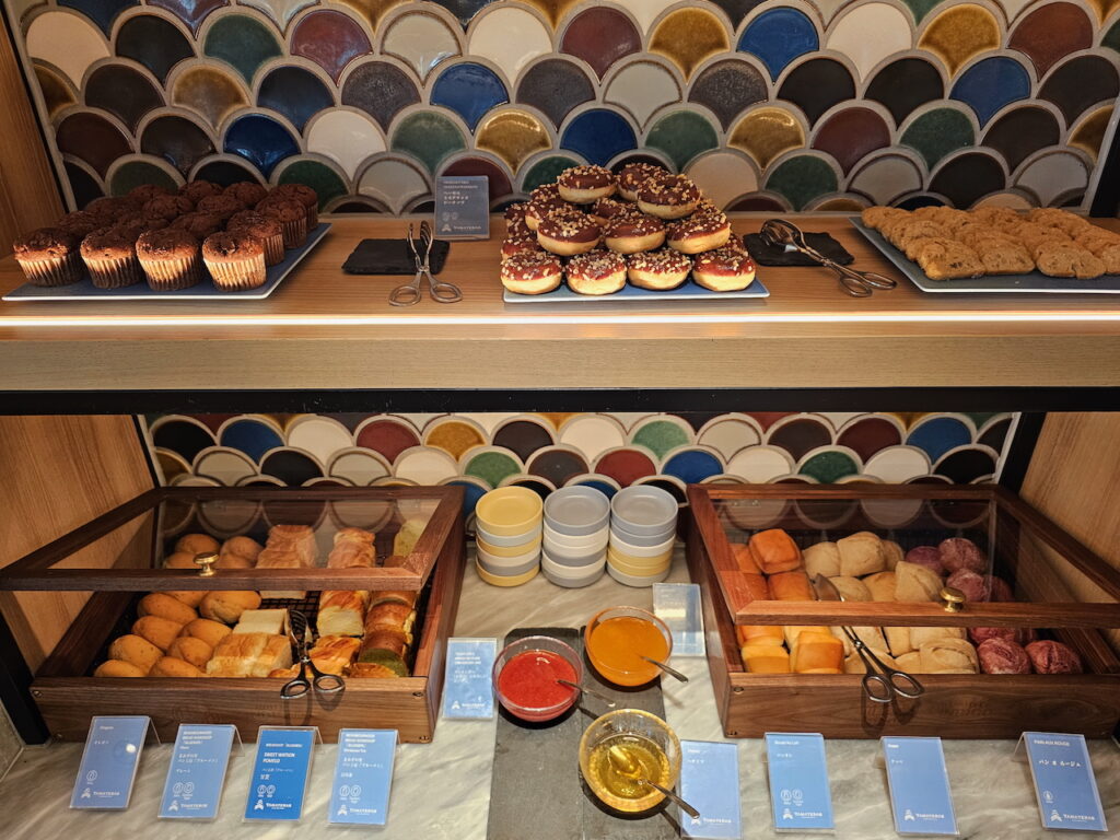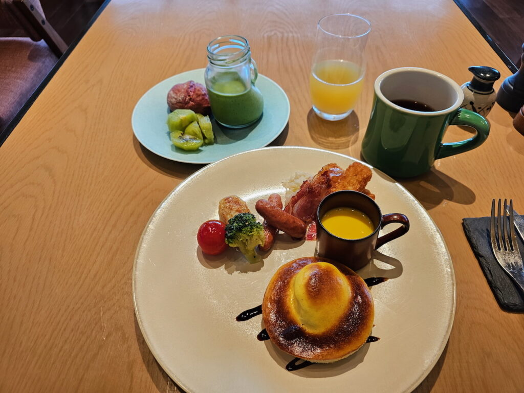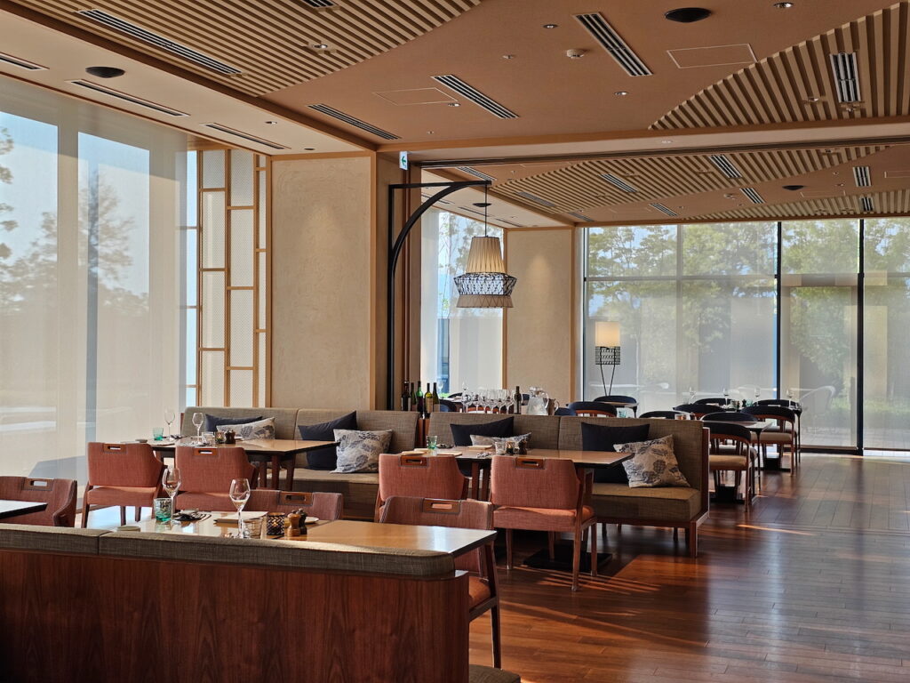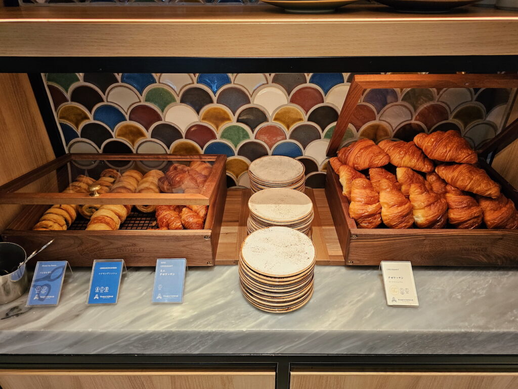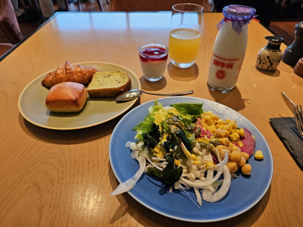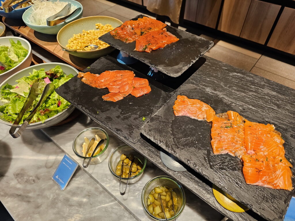 飯店早餐相當精采。主餐可挑選西式或和食,另設有菜色豐富的沙拉吧、麵包、甜點和飲料,不僅美味、讓人充滿補足感,食材的烹飪方式和擺盤也極具美觀的視覺感。