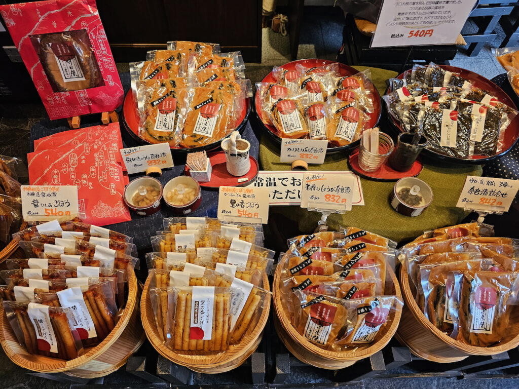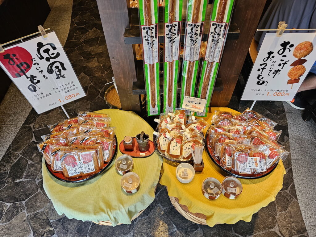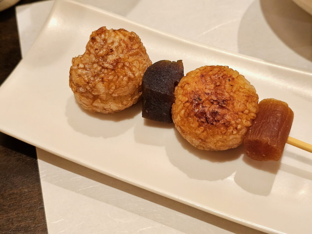 若想來點輕食,餐廳門前販售的「醬油飯糰串(醤油おこげ串)」是散步街頭時的熱門選擇。飯糰外層刷上特製醬油炙烤,香氣十足,中間夾入漬物作為配料,是犬山城下町邊走邊吃的最佳良伴。