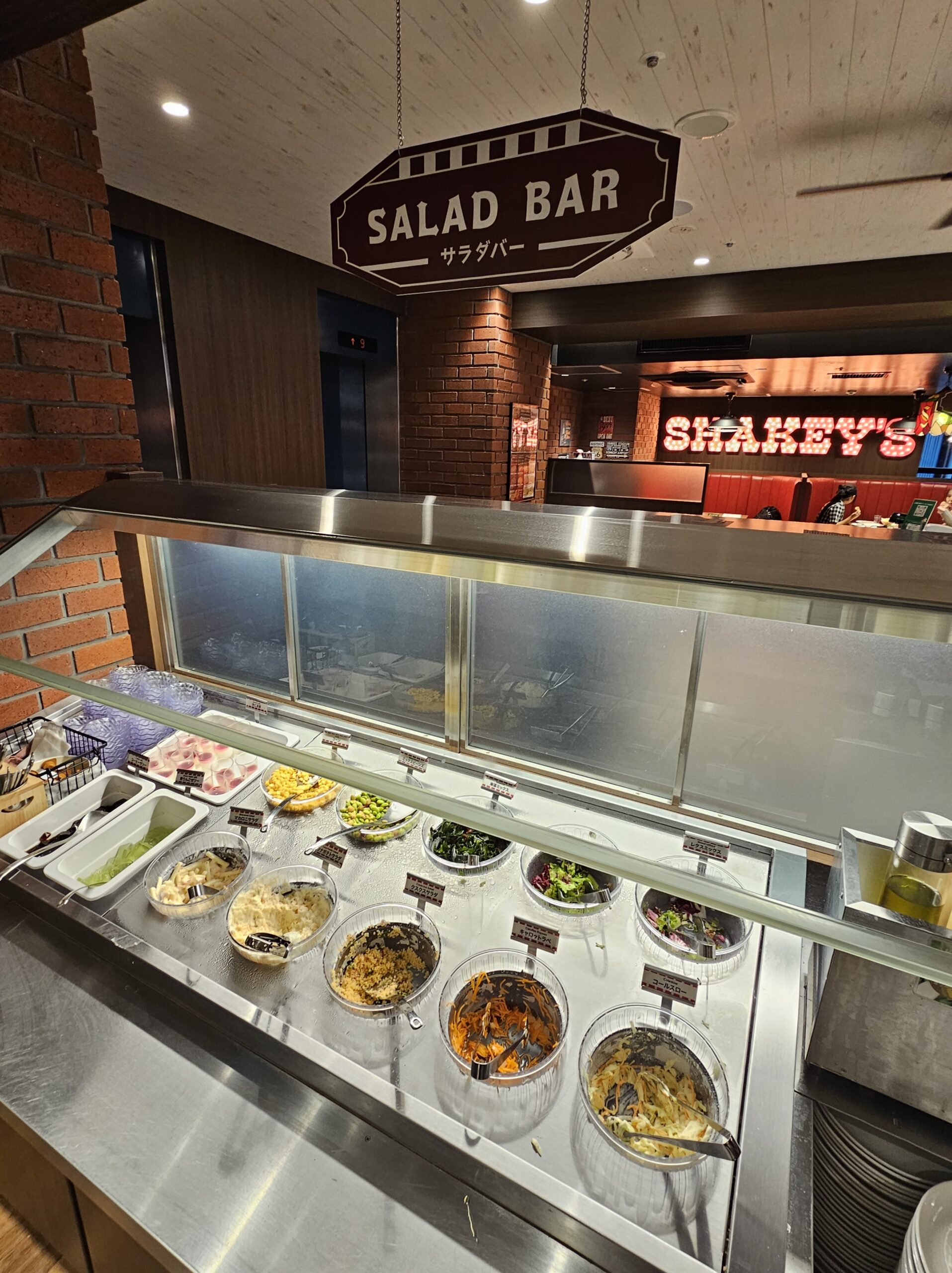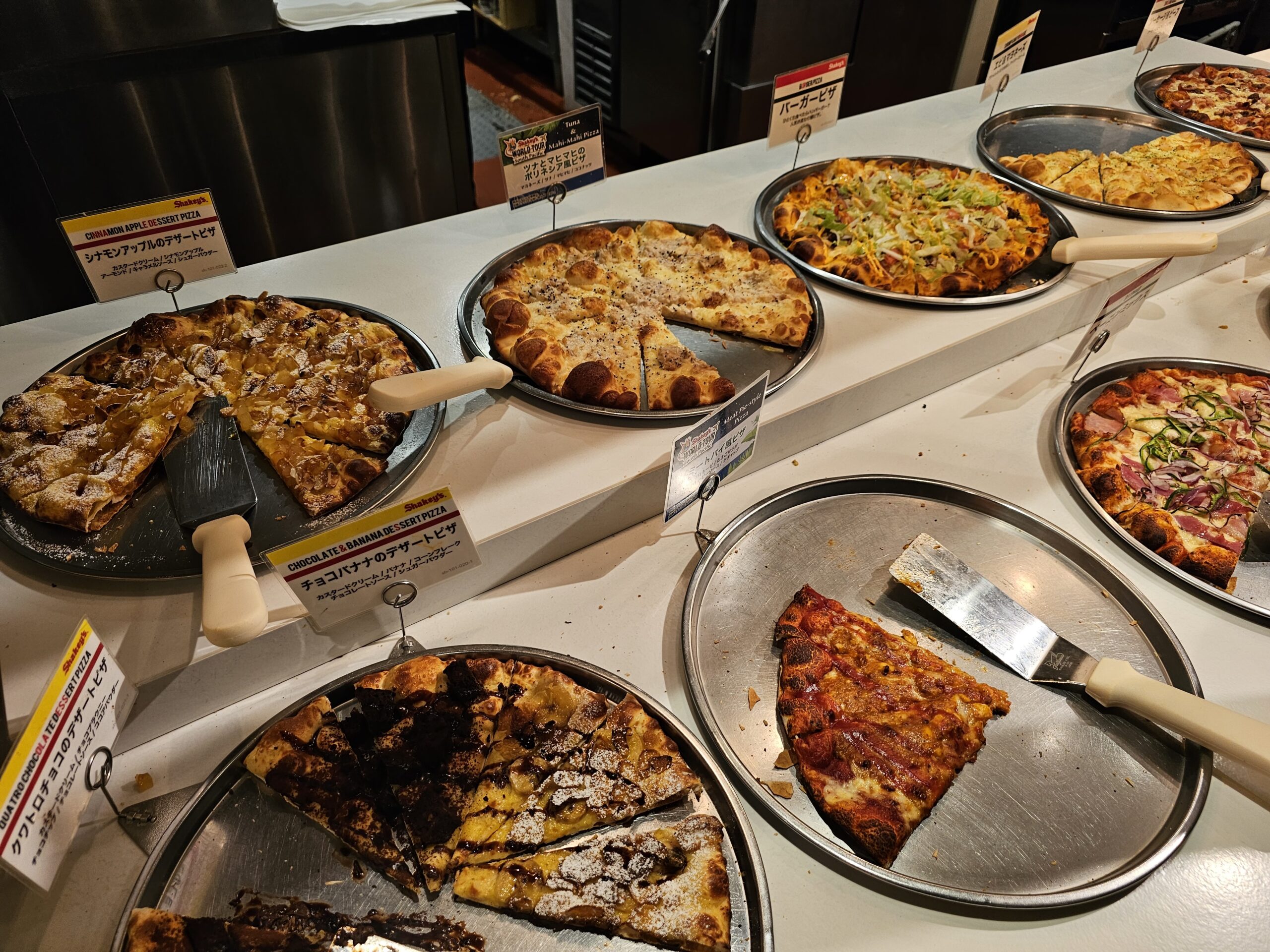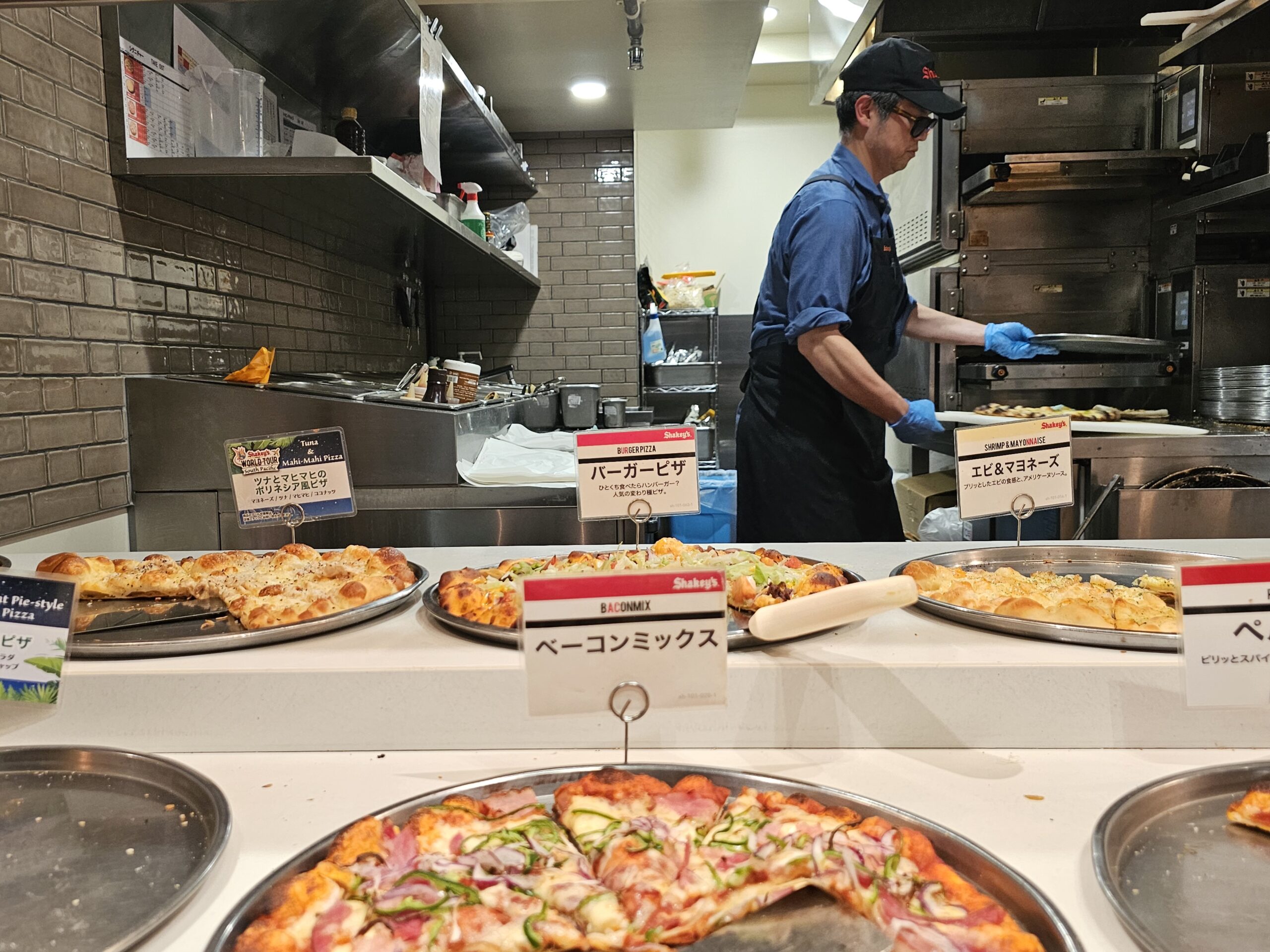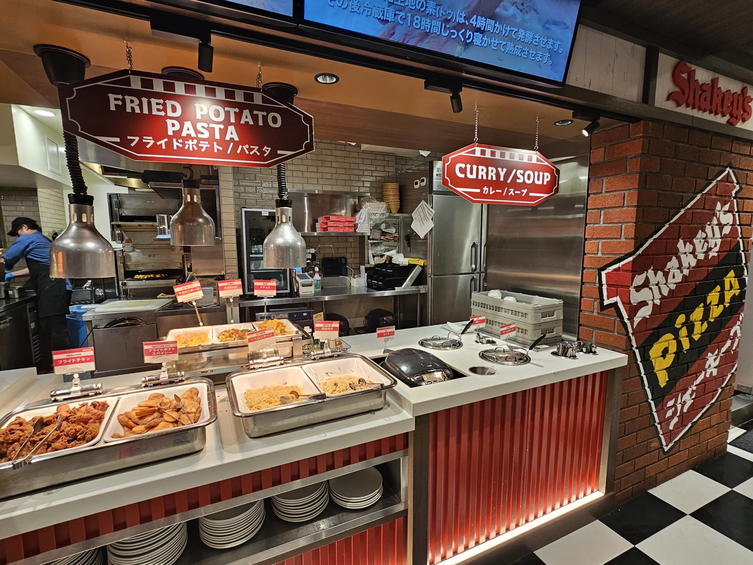 在日本的Shakeyʼs,每日使用特製小麥粉現做披薩麵團,口感香脆。自助餐檯上常備約20種口味的披薩,搭配義大利麵、現炸薯塊以及沙拉吧,讓客人以平實價格享受多樣選擇。