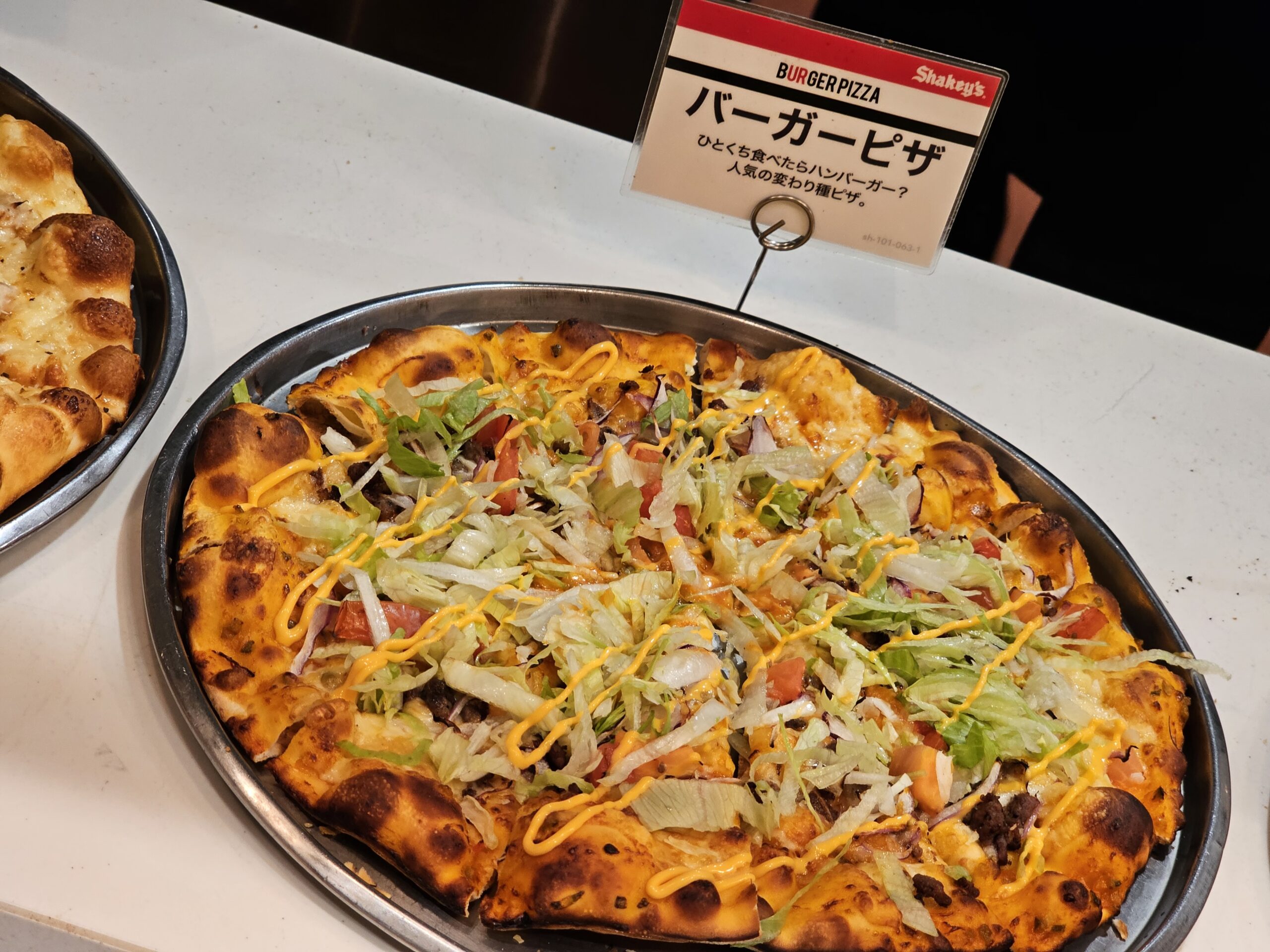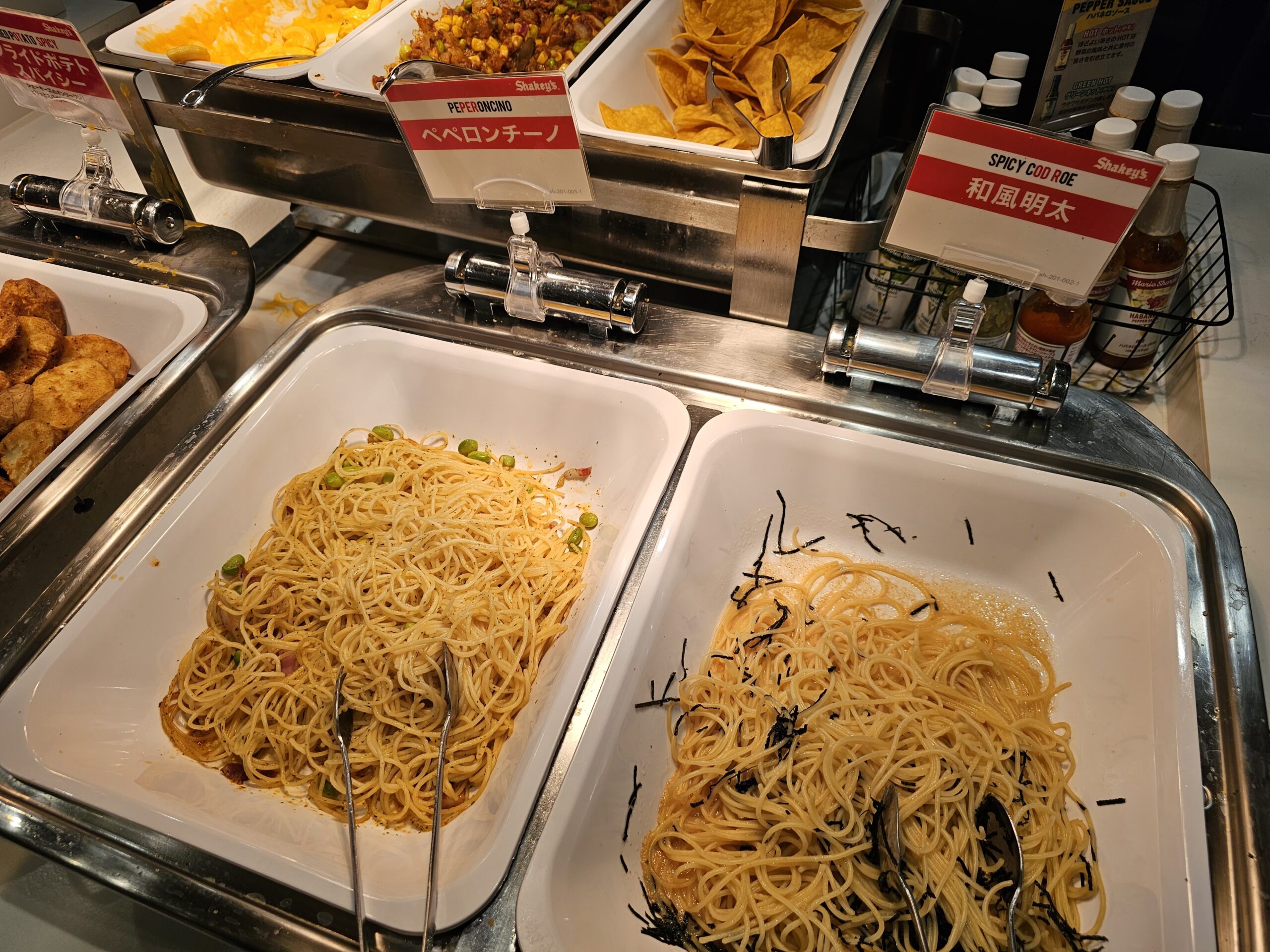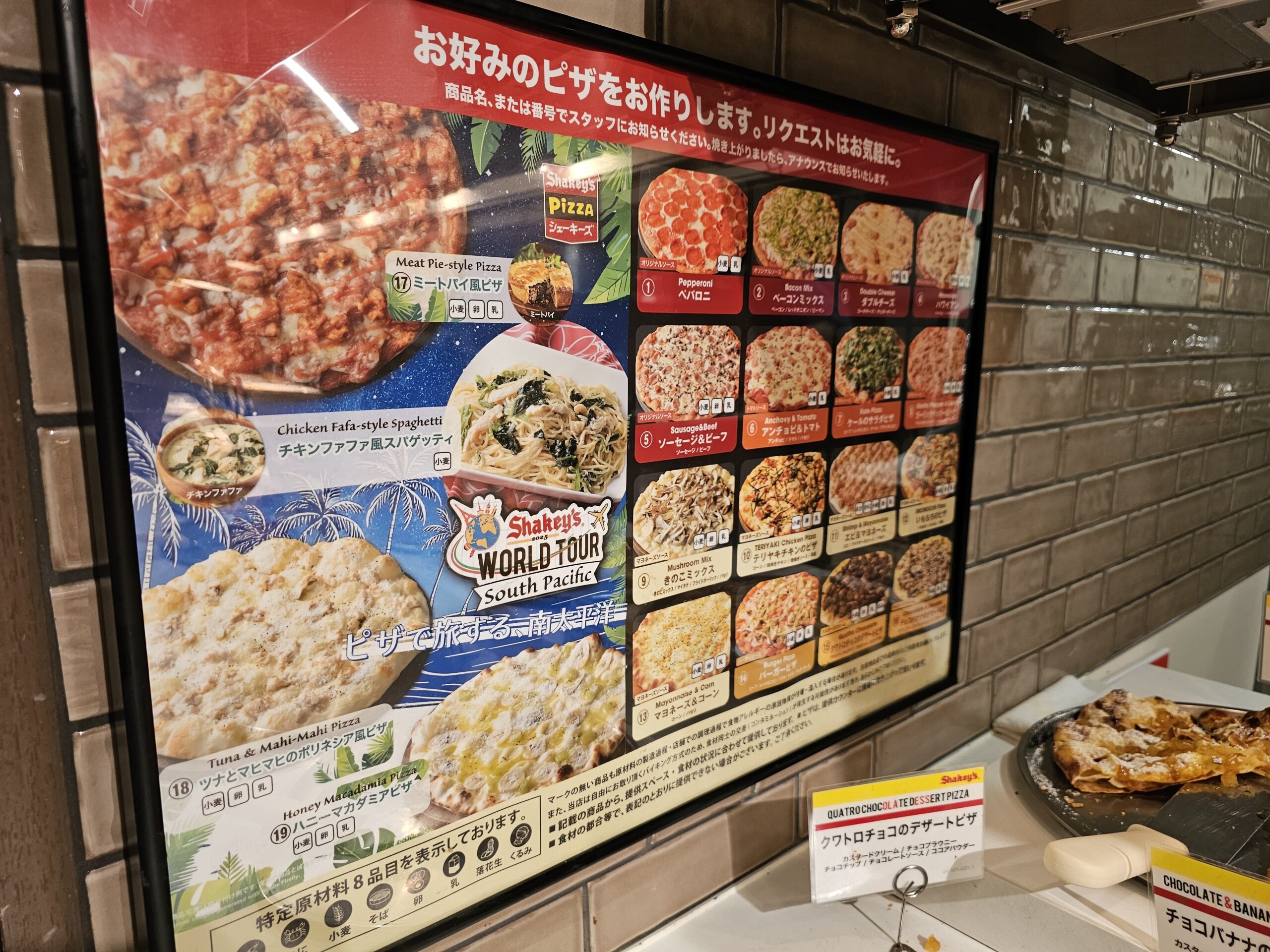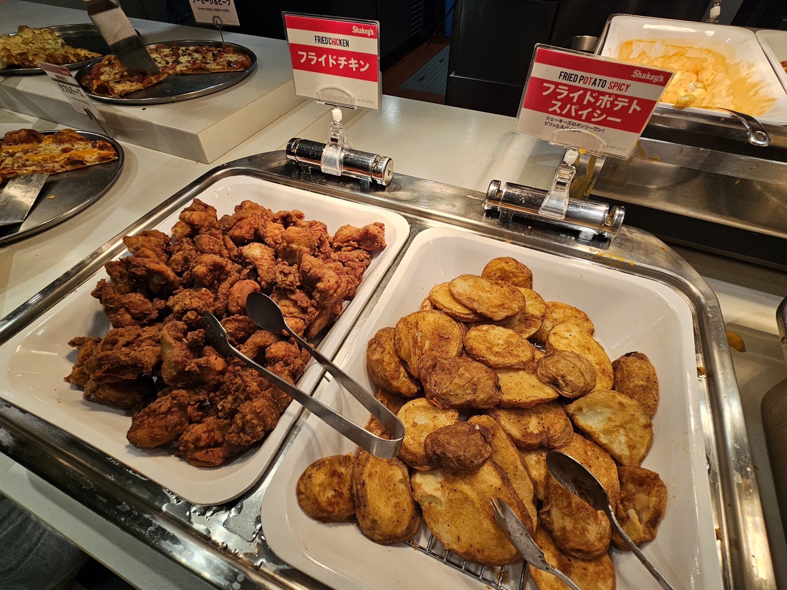 在日本的Shakeyʼs,每日使用特製小麥粉現做披薩麵團,口感香脆。自助餐檯上常備約20種口味的披薩,搭配義大利麵、現炸薯塊以及沙拉吧,讓客人以平實價格享受多樣選擇。