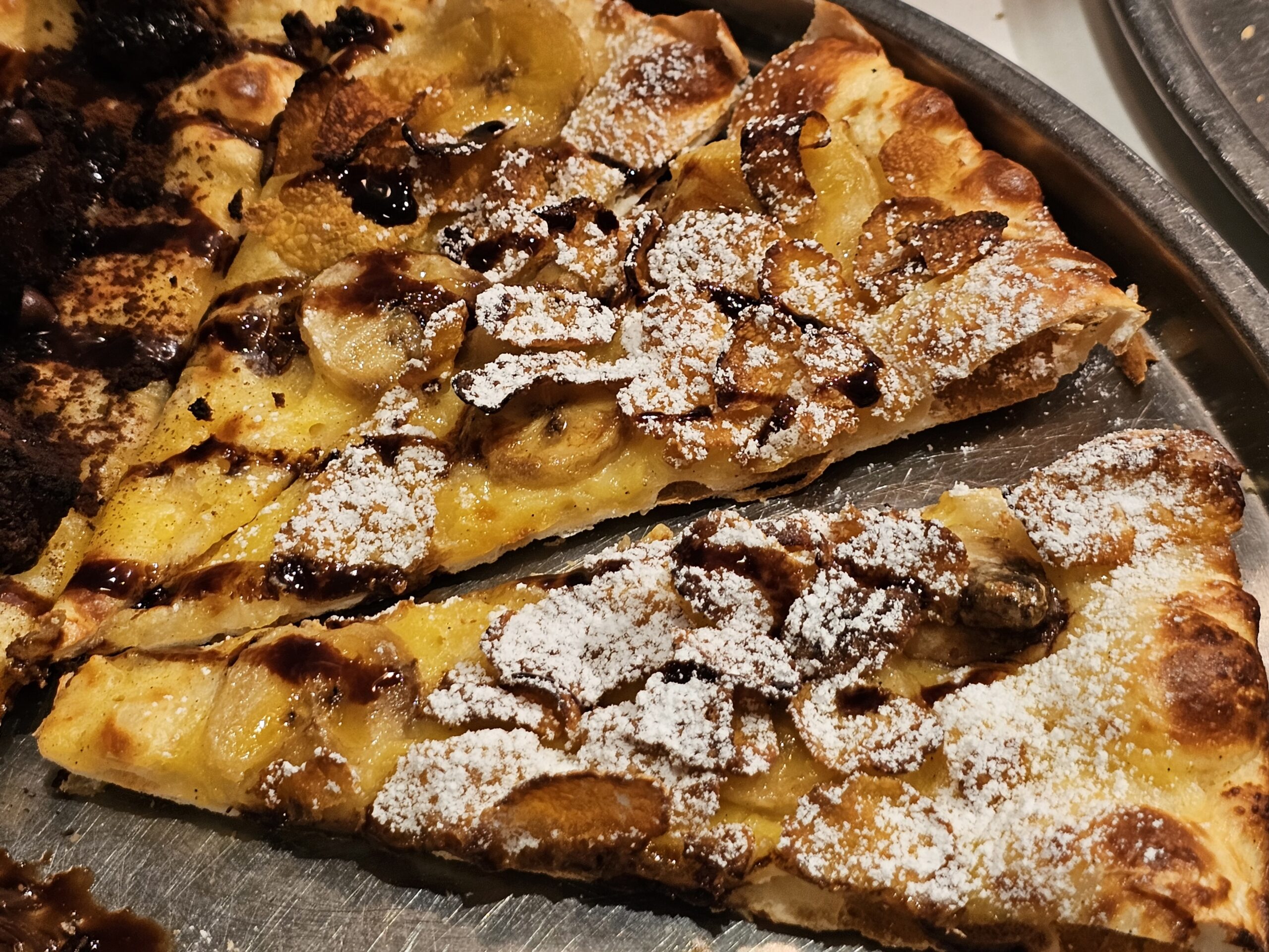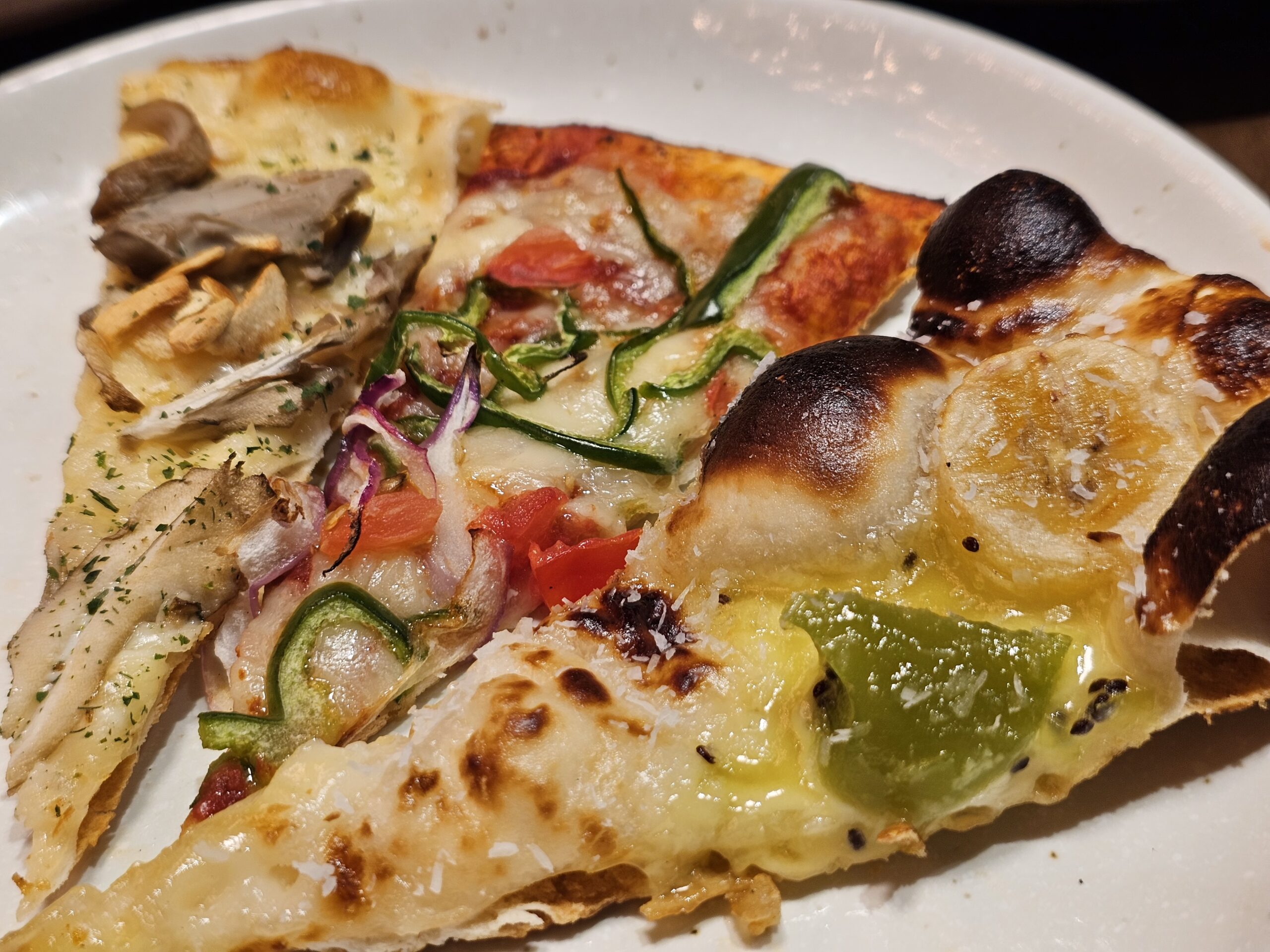 最大的特色就是吃到飽,披薩一旦現烤出爐,店內會廣播提醒,螢幕上也會顯示新品項,客人立刻就能上前取用。口味約20種,如果菜單上有但當下架上沒有,還能直接跟服務人員點,現做現烤熱騰騰送上桌。披薩的魅力不只在鹹口味,竟然還有甜披薩!聽起來很奇怪,但意外地好吃,甜披薩就像餐後甜點,讓人忍不住一份接一份地嘗。