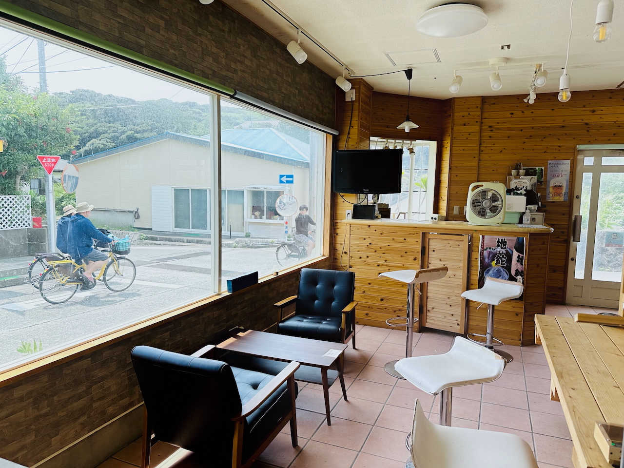 騎著自行車開始環遊式根島,途中,停留休息的地方是一間叫做「式根島食堂arumonya」的餐廳。這裡本來是一間賣海鮮為主的日本料理店,如今原有的餐廳已經暫停營業,正尋覓有意開店的店長接手。食堂正在等待有緣人出現的這段期間,變成了出租空間,提供餐館出差,在此開設臨時店。我們去的時候,恰好是島外的人來開設為期僅有三天的快閃店,也算是一期一會。期待下回再訪時,食堂有嶄新的一面。