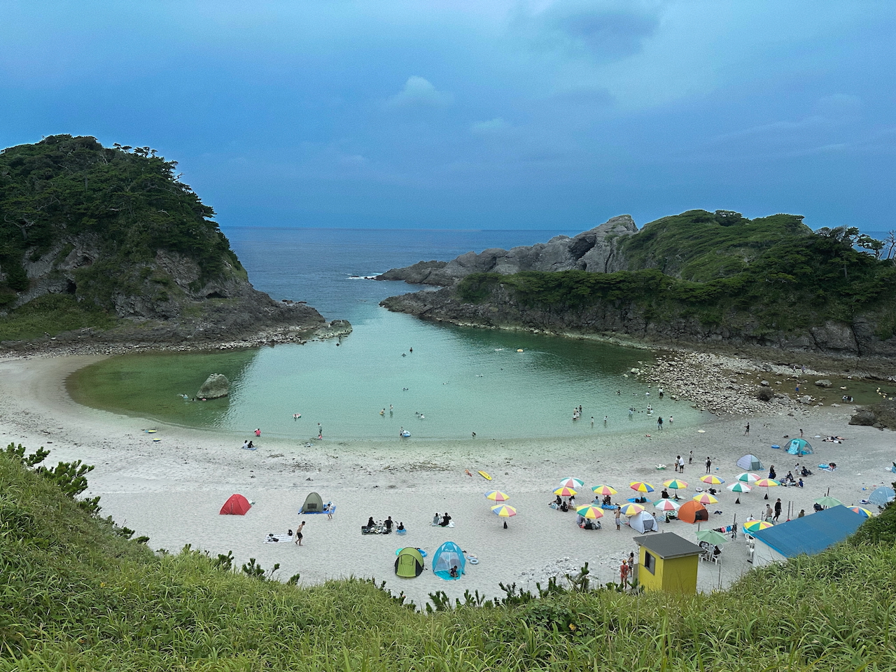 沙灘呈優雅的扇形,懷抱著碧綠的海洋,延伸至天際,海天一色,構成令人屏息的絕景。難怪如今只要媒體提到式根島,畫面總會出現這裡。