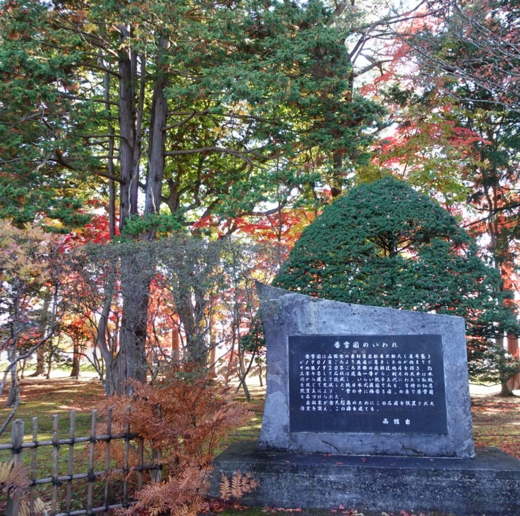 「香雪園(見晴公園)」是北海道著名賞楓景點,也是北海道唯一國家指定文化財產庭園(国指定文化財庭園),由函館市的富商岩船峯次郎先生於 1898 年左右開始建造的正統「風景式庭園」。