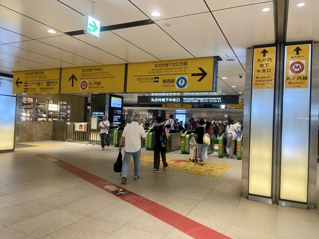 丸之內線的月台在地下一樓,從 JR 車站轉車時要先出站,再進入東京 Metro 的剪票口。電車抵達東京後,下車第一件事,先找找「丸之內地下中央口(丸の内地下中央口)」;如果人在一樓的話,找「丸之內北口」或「丸之內中央口」的指標,下到地下一樓也會比較快一點。