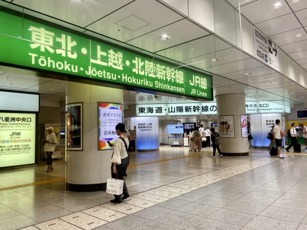 車站內會有大大的白底燈箱寫著「東海道・山陽新幹線」的黑字,改札口分佈在「八重洲北口」、「八重洲中央北口」、「八重洲南口」、「八重洲中央南口」、「日本橋口」。