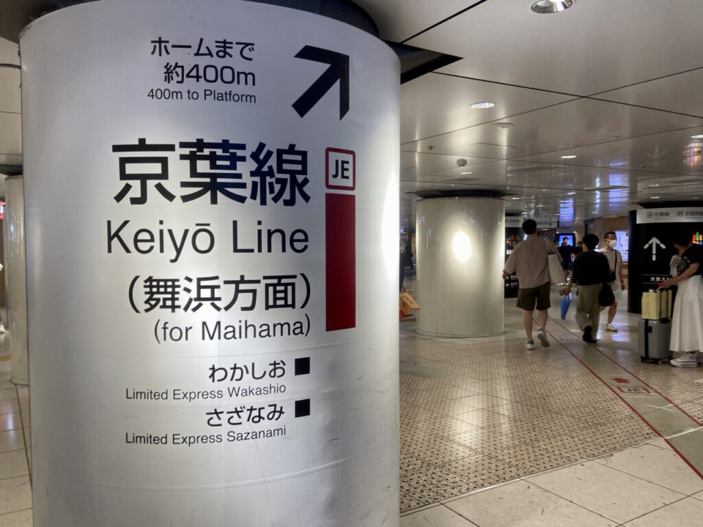 從東京車站搭到迪士尼,要坐「JR 京葉線(JR京葉線)」、「JR 武藏野線(JR武蔵野線)」,在「舞濱站(舞浜駅)」下車!從 JR 各線下車後,先找到「八重洲南口」標示,再依照「京葉線」指標走,需要注意的是,電車班次雖然很多,但走到JR京葉線的月台大約要花 10 分鐘左右。