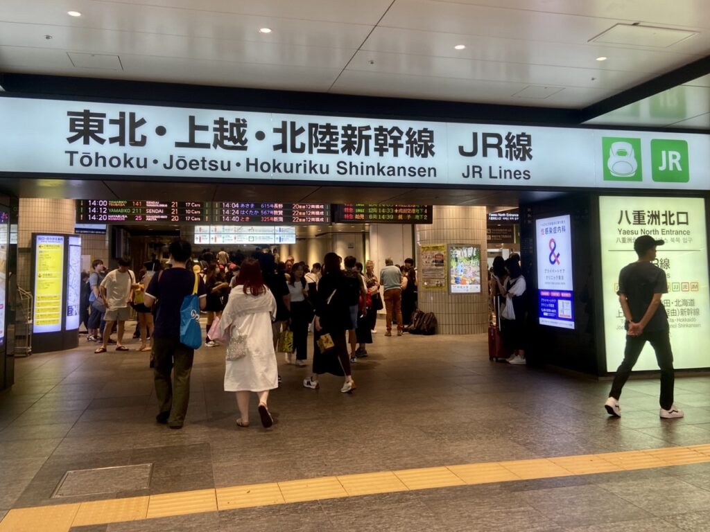 「東北、上越‧北陸新幹線」與一般JR線的改札口是共用的,看到大燈箱,上面寫著「東北、上越‧北陸新幹線 JR線」就是了。先進入改札口後,再前往「東北、上越‧北陸新幹線」的乘換口。