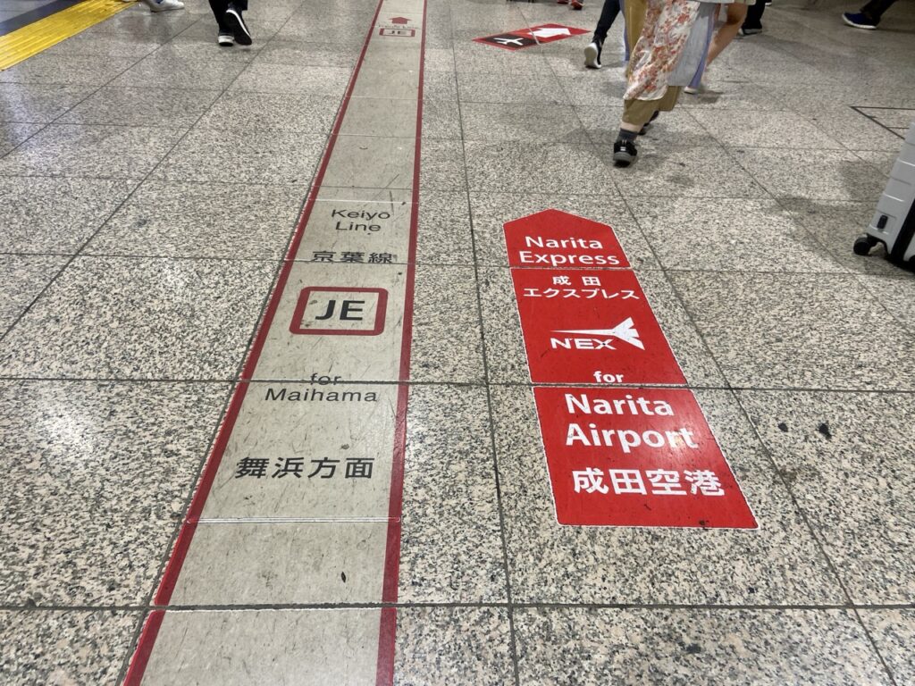 如果是要搭 N’EX 成田特快前往「成田機場(成田空港)」,要找「橫須賀線・總武線」,車站地面都有指標貼心指引;想去迪士尼樂園,就搭前往「舞濱(舞浜)」方面的「京葉線(京葉線)」,這兩條路線會比較遠一點,可能需要預留10分鐘以上找路,換乘時記得要多留意時間!