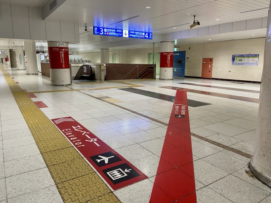 從 JR 東京車站的地下5樓的「橫須賀線/總武線」月台發車,為了讓旅客能更順暢的抵達月台,地板上都有清楚的標示,只要跟著「成田空港」、「成田エクスプレス」的標示走,就沒問題,也有電梯直達地下樓層。