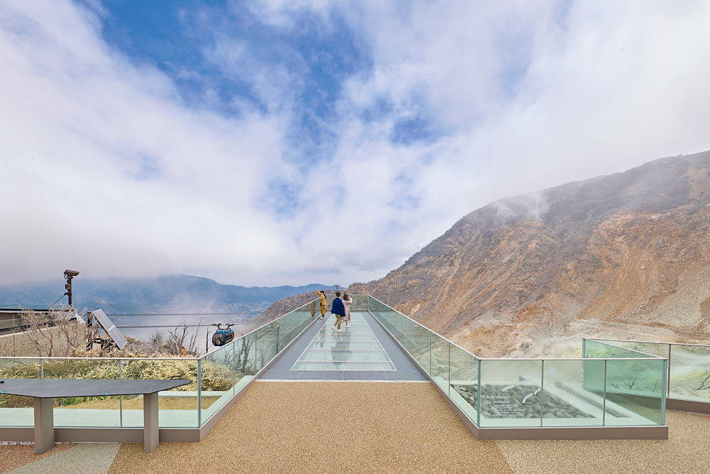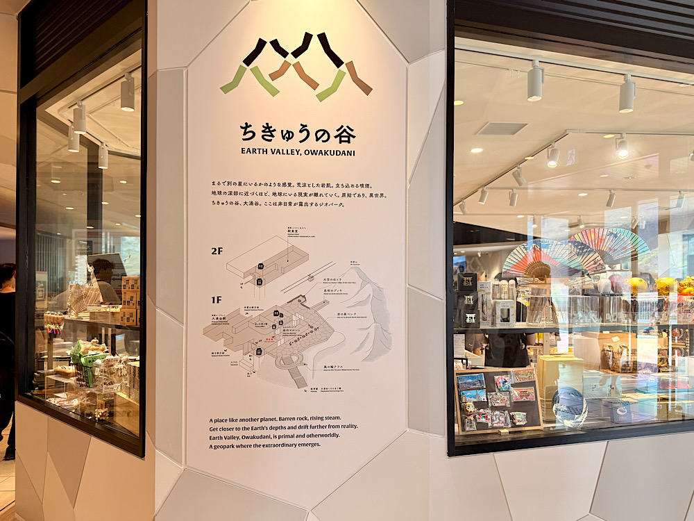 這是大涌谷2025年全新開放的複合式設施「地球之谷(ちきゅうの谷)」,主要是整合了購物、餐飲、與休憩的多功能空間。設施內部包括站內食堂、伴手禮商店與觀景休憩區等,讓旅客能在火山地形的震撼景致下,悠閒吃飯、採購與休息。