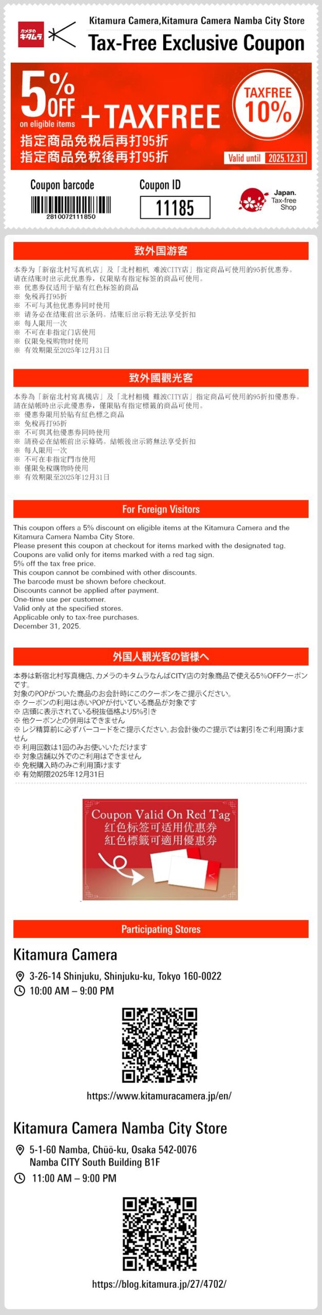 | 優惠券使用條件 | 本優惠券限新宿北村寫真機店、北村相機店 難波CITY店中的指定商品,享95折。 購買貼有活動海報的對象商品時,請向結帳櫃台出示本優惠券。※只限購買貼有紅色活動海報之商品。 ※享有以店舖張貼指定商品稅前價格的95折。 ※本優惠券不得與其他優惠活動於同一訂單合併使用。 ※請務必在結帳前向櫃檯出示本優惠券條碼,如在結帳後才出示將不予以折扣。 ※出示手機畫面或印刷紙本的優惠券皆可使用。 ※本優惠券限使用一次。 ※不適用於上述指定店鋪以外的分店。 ※只限於免税消費時使用。 |