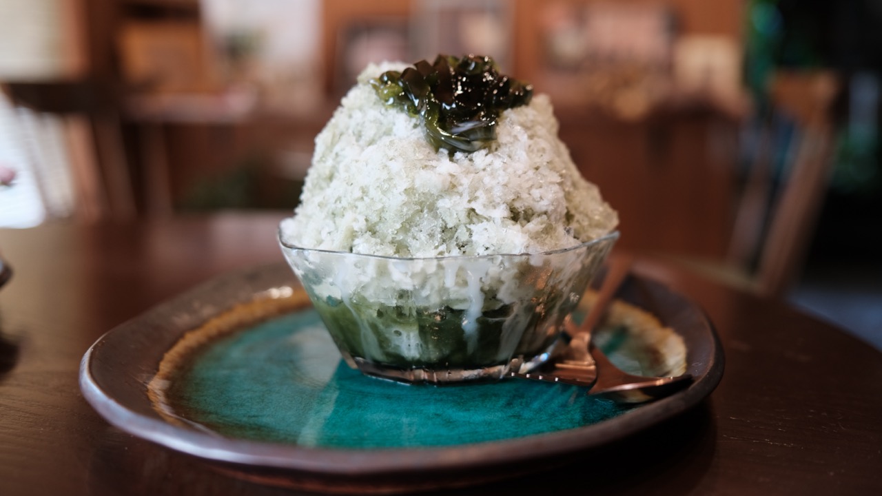 我很喜歡這裡的用餐環境,暖色調的古民家空間,看著樹影緩緩晃動,感覺特別悠閒。刨冰是粗粒的(ゴリゴリ)、口感脆脆,店家還貼心提醒吃完後身體會有點冷,可以向他們要熱茶暖胃。