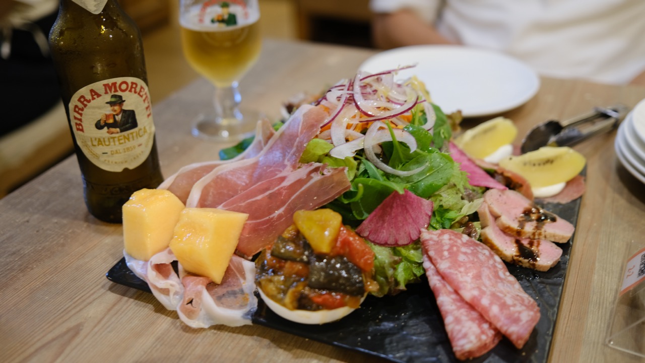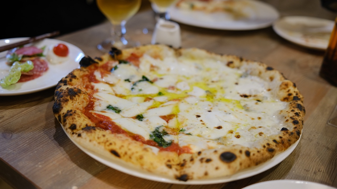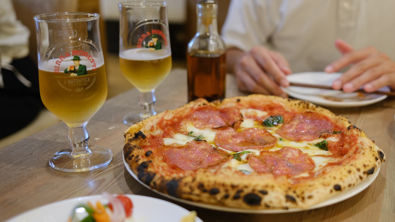 用餐時,若稍微留意身邊的服務人員,會發現他們定時向廚房回報各桌用餐進度,並在最合適的時刻,將剛出爐的披薩遞上。推薦口味是「惡魔披薩(ディアボラ)」,餅皮酥脆,吸附滿滿番茄醬汁與起司,橄欖油香氣中帶點辣味,讓莫札瑞拉起司不膩口。搭配義大利 Birra Moretti 啤酒,邊品嚐披薩邊回味旅行時的美好,真的是超級棒!