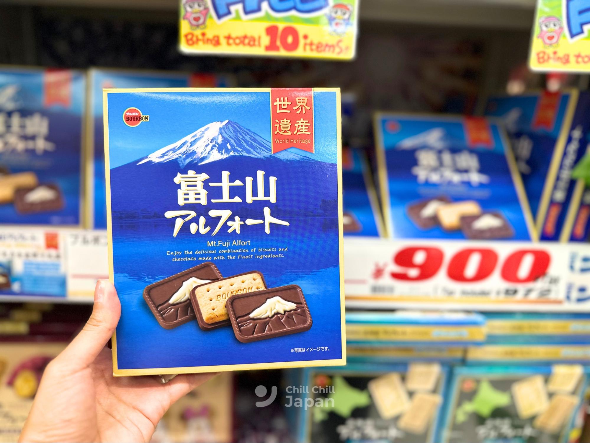 藍色包裝的 Alfort 帆船巧克力餅乾(富士山アルフォート) 是日本經典零食之一,酥脆餅乾與香濃牛奶巧克力的組合深受歡迎。而在唐吉訶德,能買到特別設計的 「富士山限定版」,包裝上印有日本象徵的富士山圖案,不僅美味,更兼具紀念價值。這款限定版因造型獨特,加上分裝小袋設計,方便分享,非常適合當伴手禮,是兼具日本風味與特色紀念性的必買零食之一。
