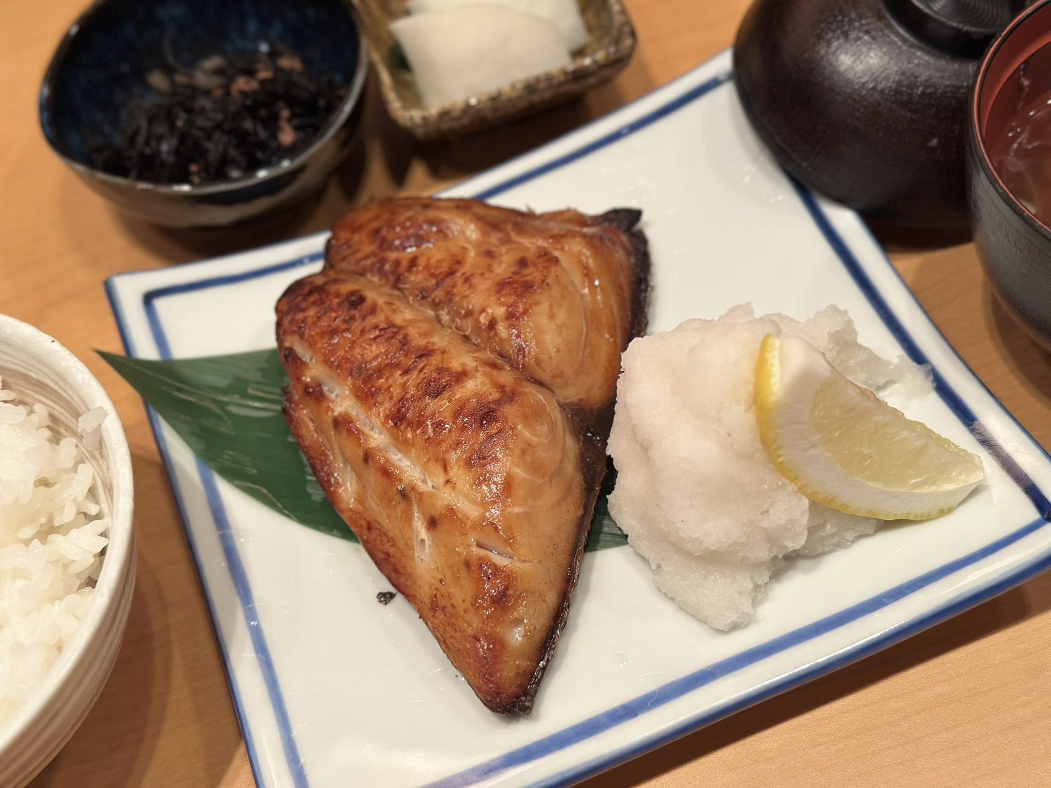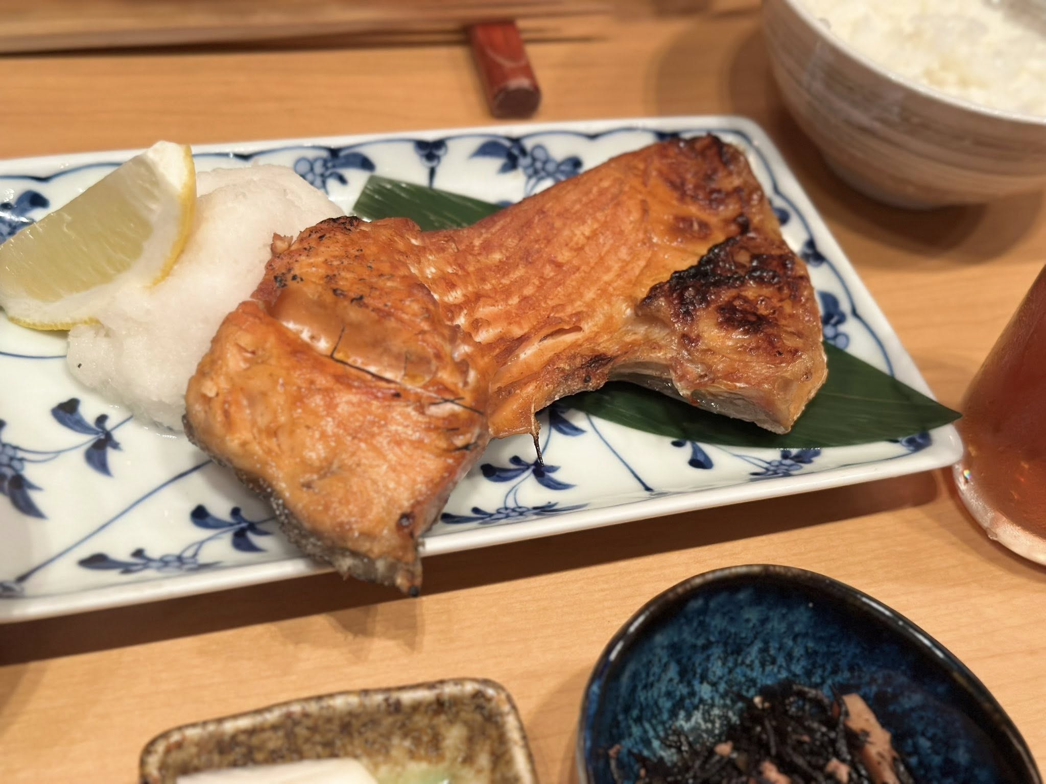 午餐時段最受歡迎的是燒魚定食系列,其中以 鹽烤鮭魚(しゃけ塩焼) 與 柚香烤銀鱈(銀ひらす柚香焼)評價最高。鹽烤鮭魚使用粗鹽調味,外皮酥香、肉質柔嫩,保留鮭魚豐富油脂與自然甜味;而柚香烤銀鱈則以柚子香氣輕醃白身魚後炭火慢烤,魚肉細緻、香氣清新,展現出職人對火候的精準掌握。