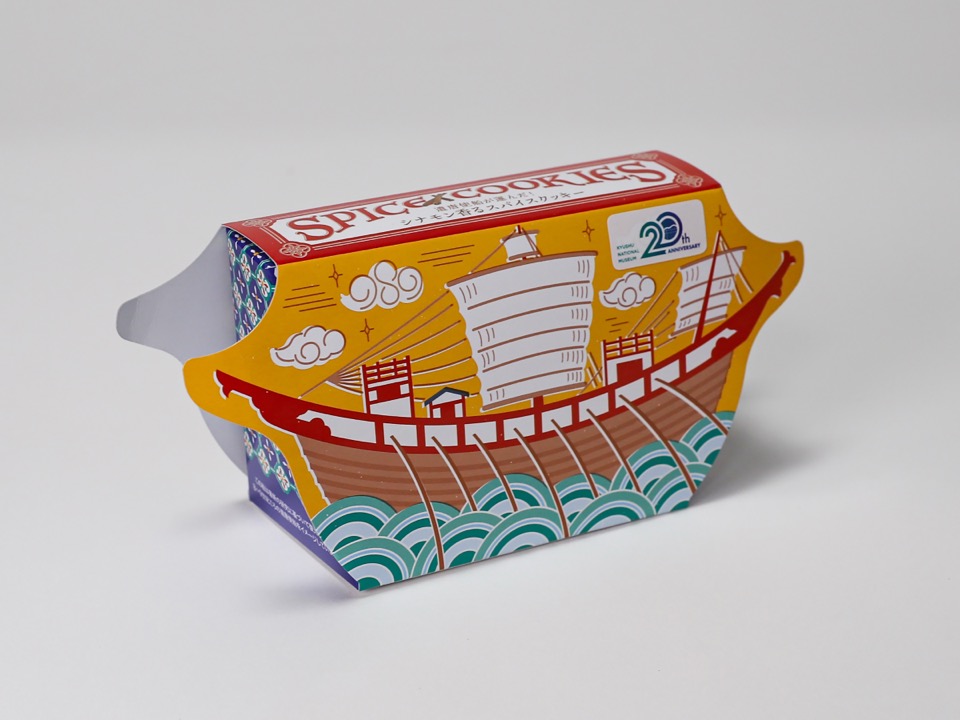 以博物館展示的遣唐使船模型為靈感,餅乾盒設計仿古船造型,內含淡淡肉桂香氣的酥脆餅乾,寓教於樂的「吃得到歷史」小點。
