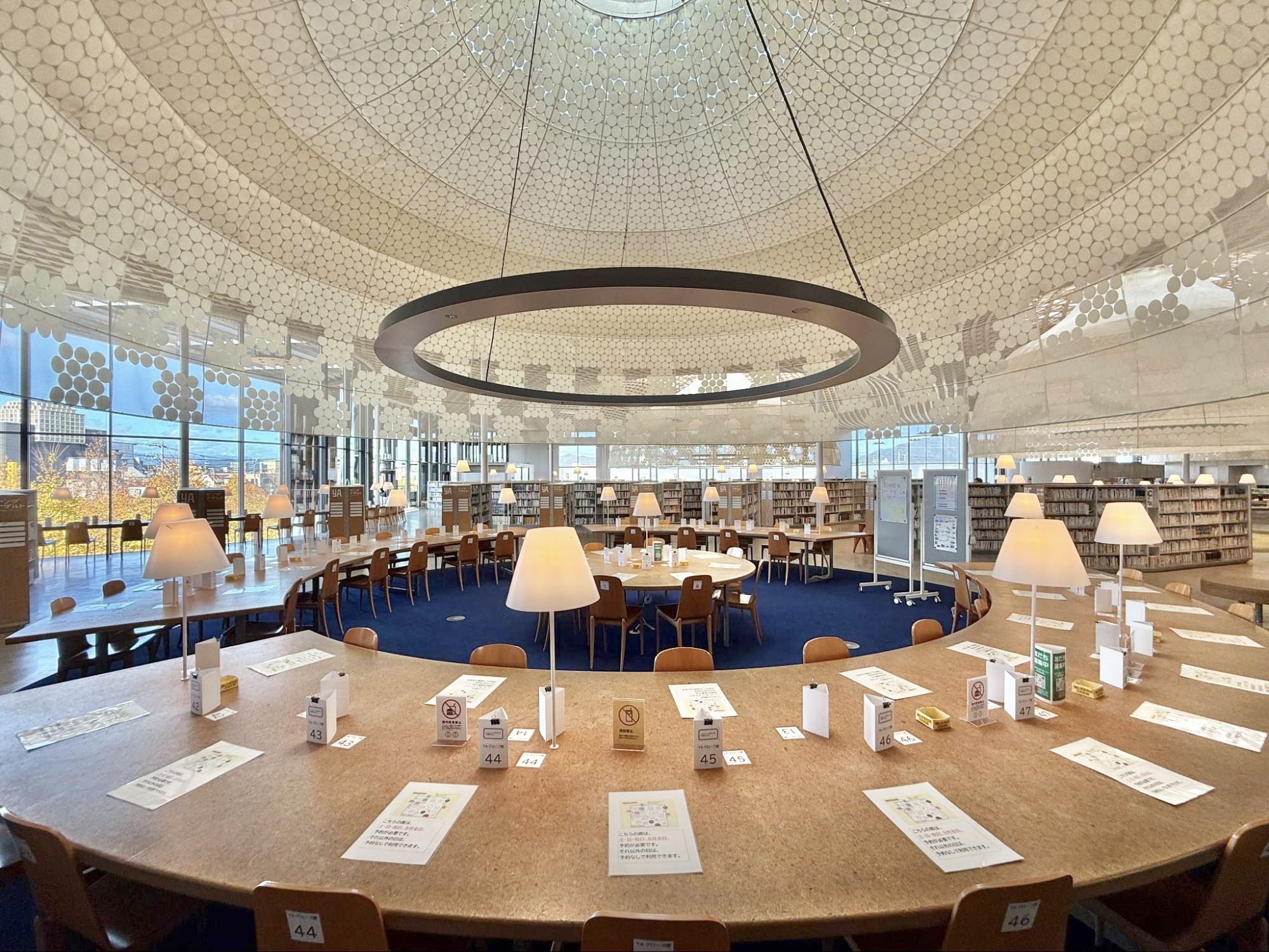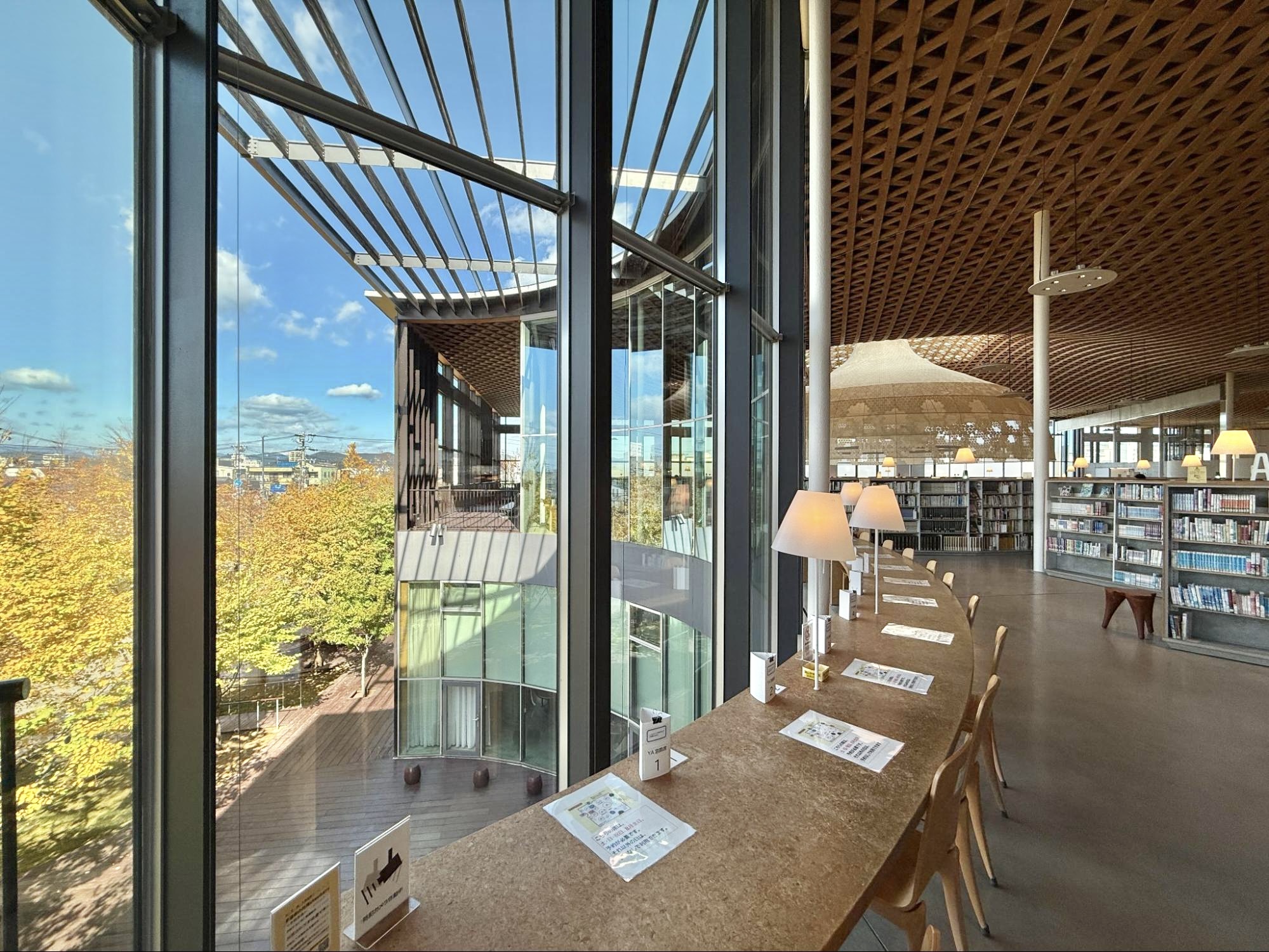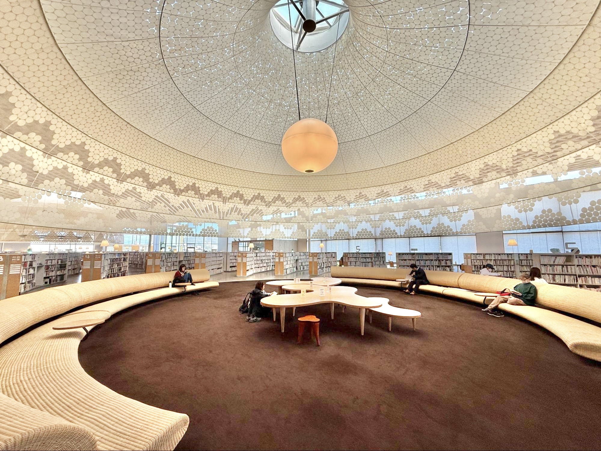 這座由世界知名建築師伊東豊雄設計的圖書館,就是個大型藝術品。以木材與自然光為主角。走進大廳,陽光從大片落地窗灑進來。