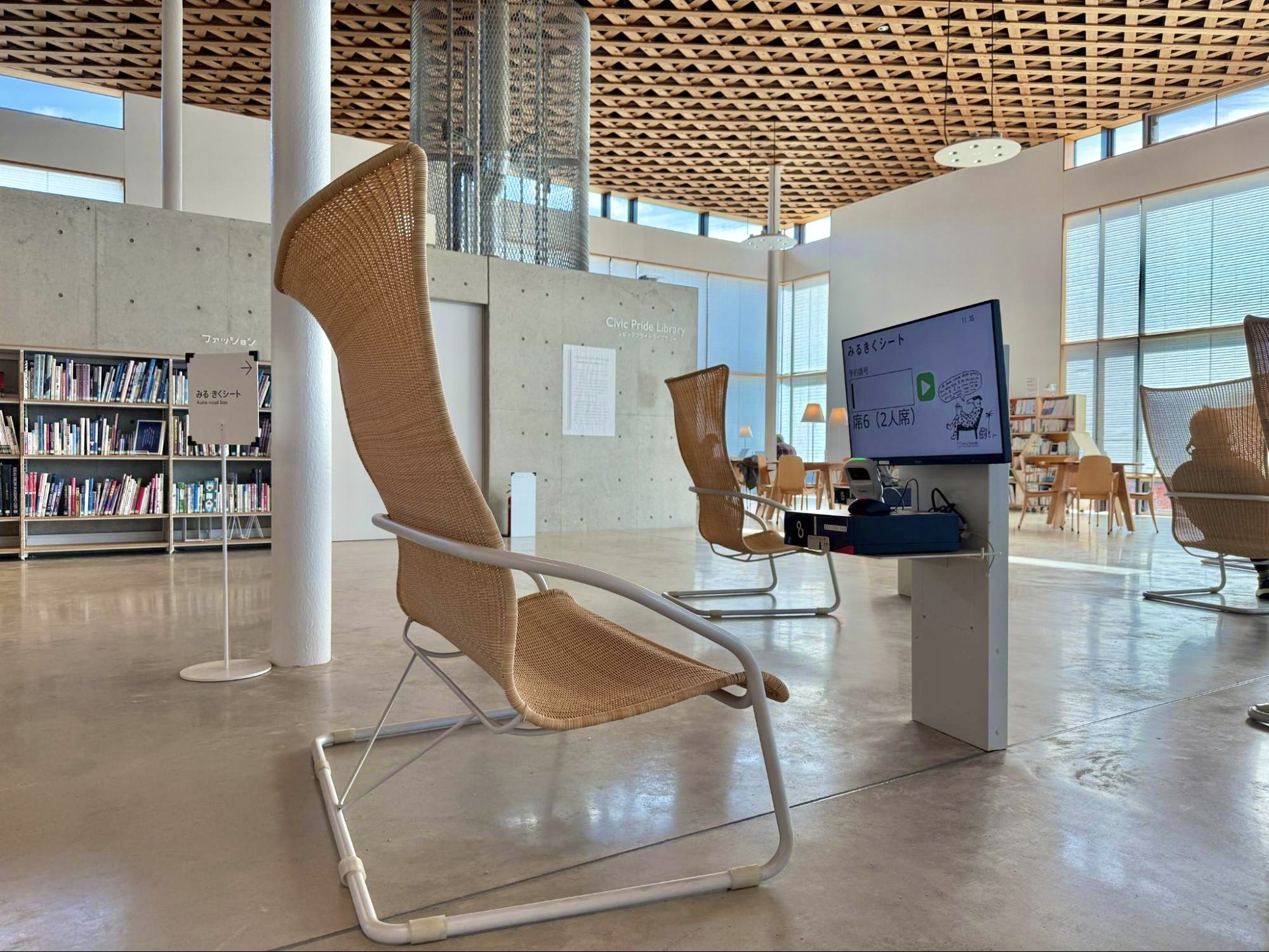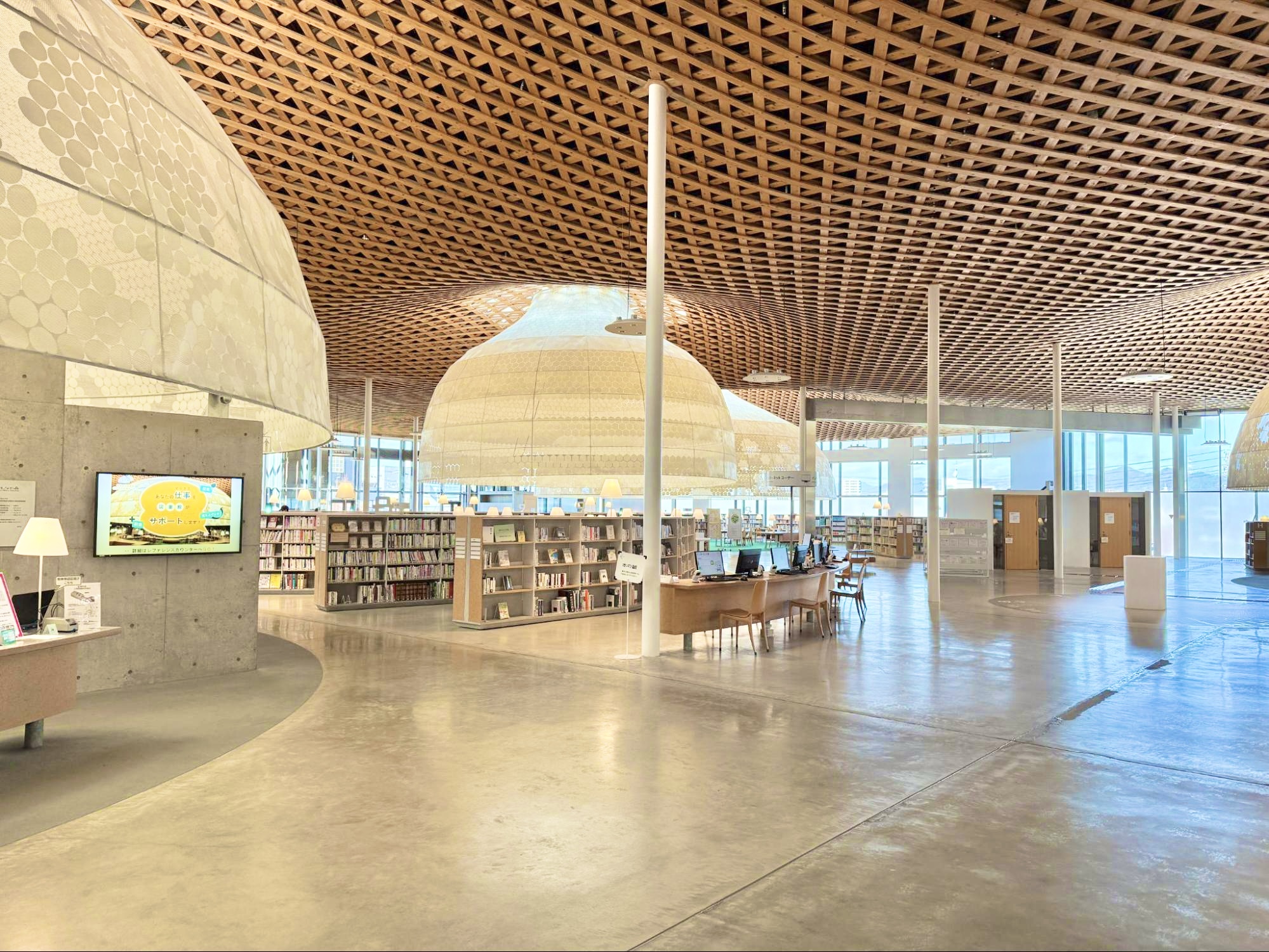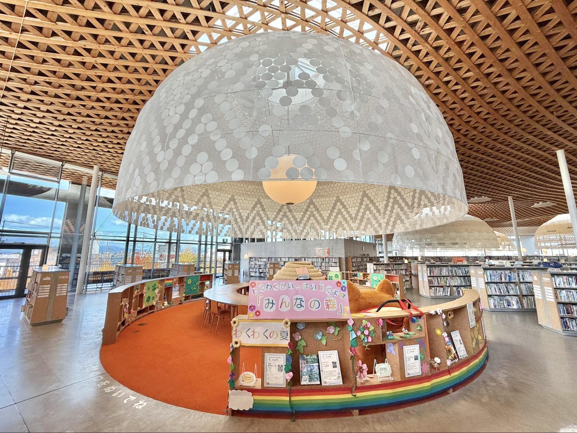 這座由世界知名建築師伊東豊雄設計的圖書館,就是個大型藝術品。以木材與自然光為主角。走進大廳,陽光從大片落地窗灑進來。
