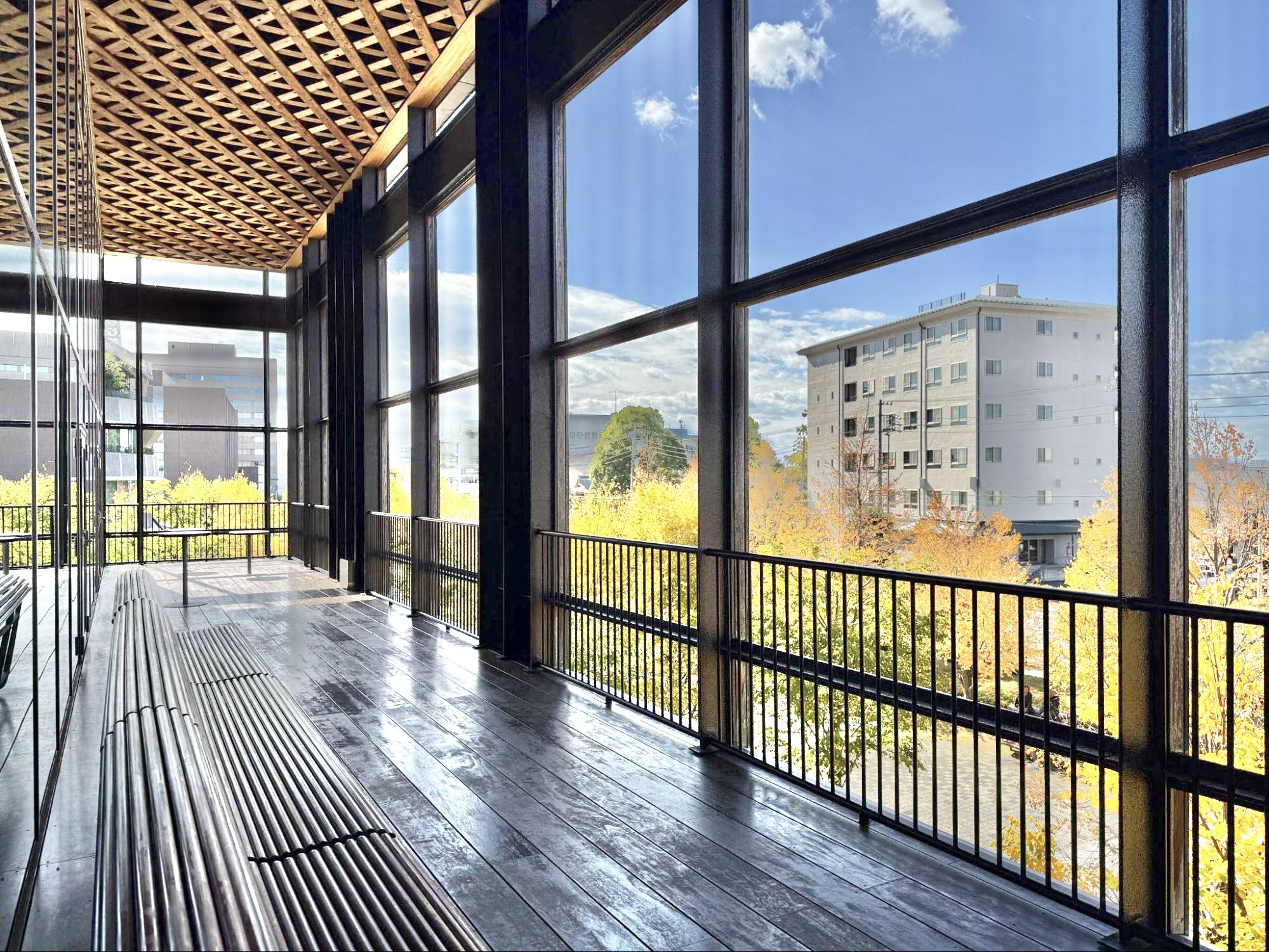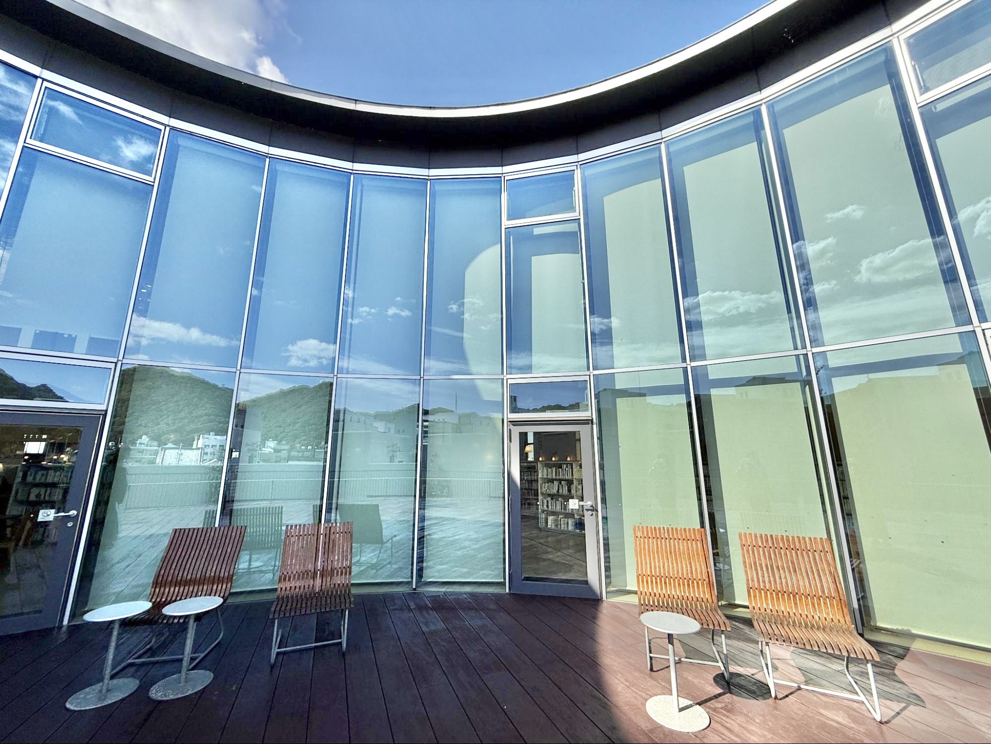 走到室外,圖書館的外圍有開放座位,可近距離欣賞外頭的風景,也能眺望遠方金華山頂上的岐阜城。陽光灑落,書香與風聲交織。