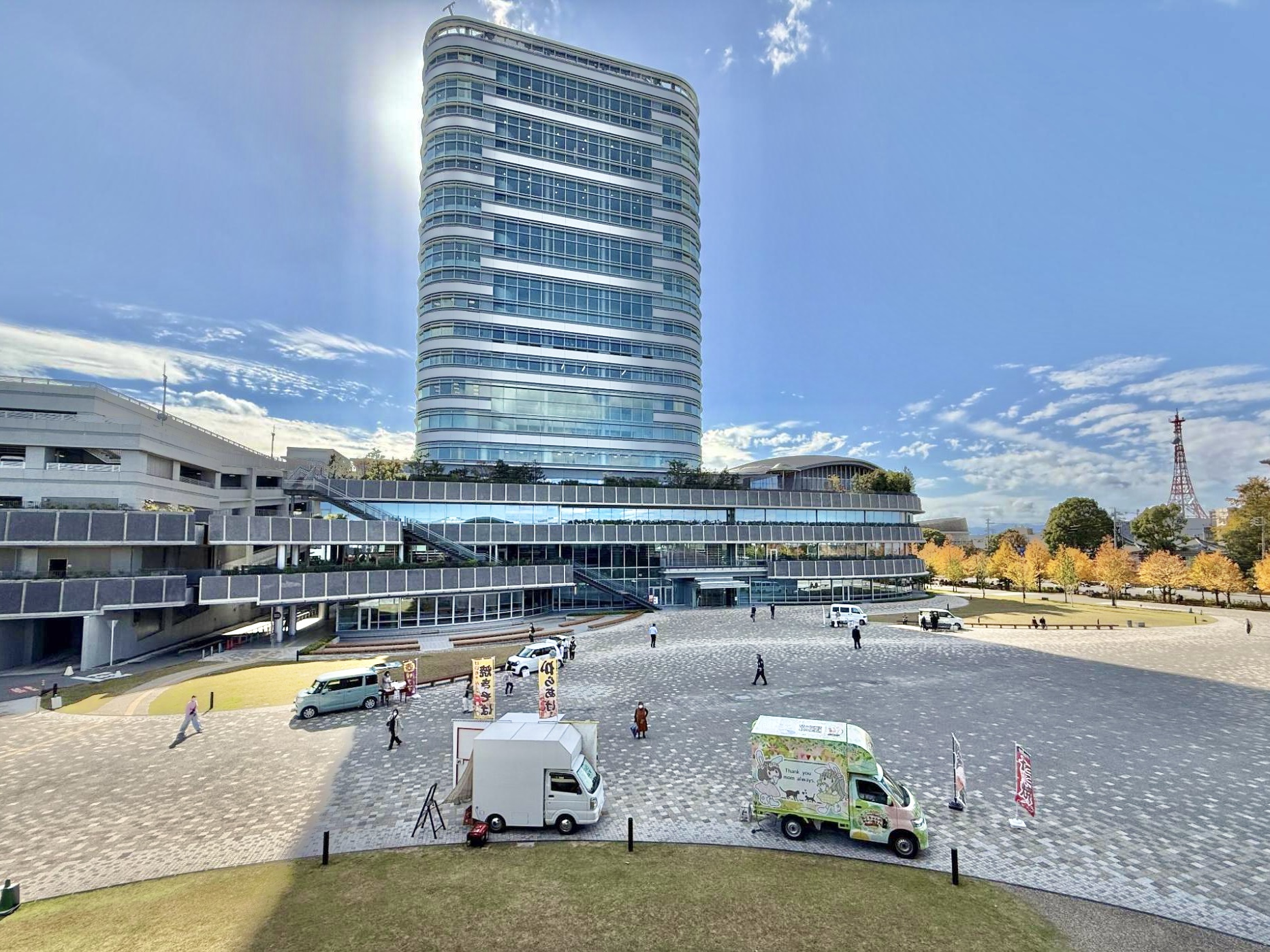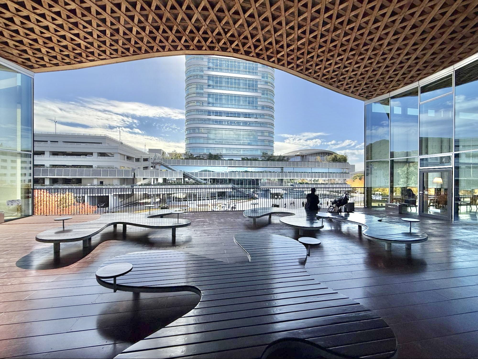 圖書館對面就是新穎的「岐阜市役所」,外觀簡潔俐落,與 Media Cosmos 的木質柔光形成漂亮的構成。兩棟建築之間是一片開放廣場,是市民活動的中樞,不定期舉辦市集、活動、表演,也是市民散步交流的重要場域。