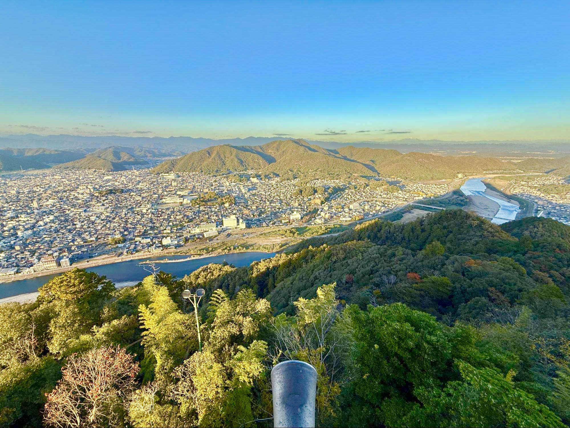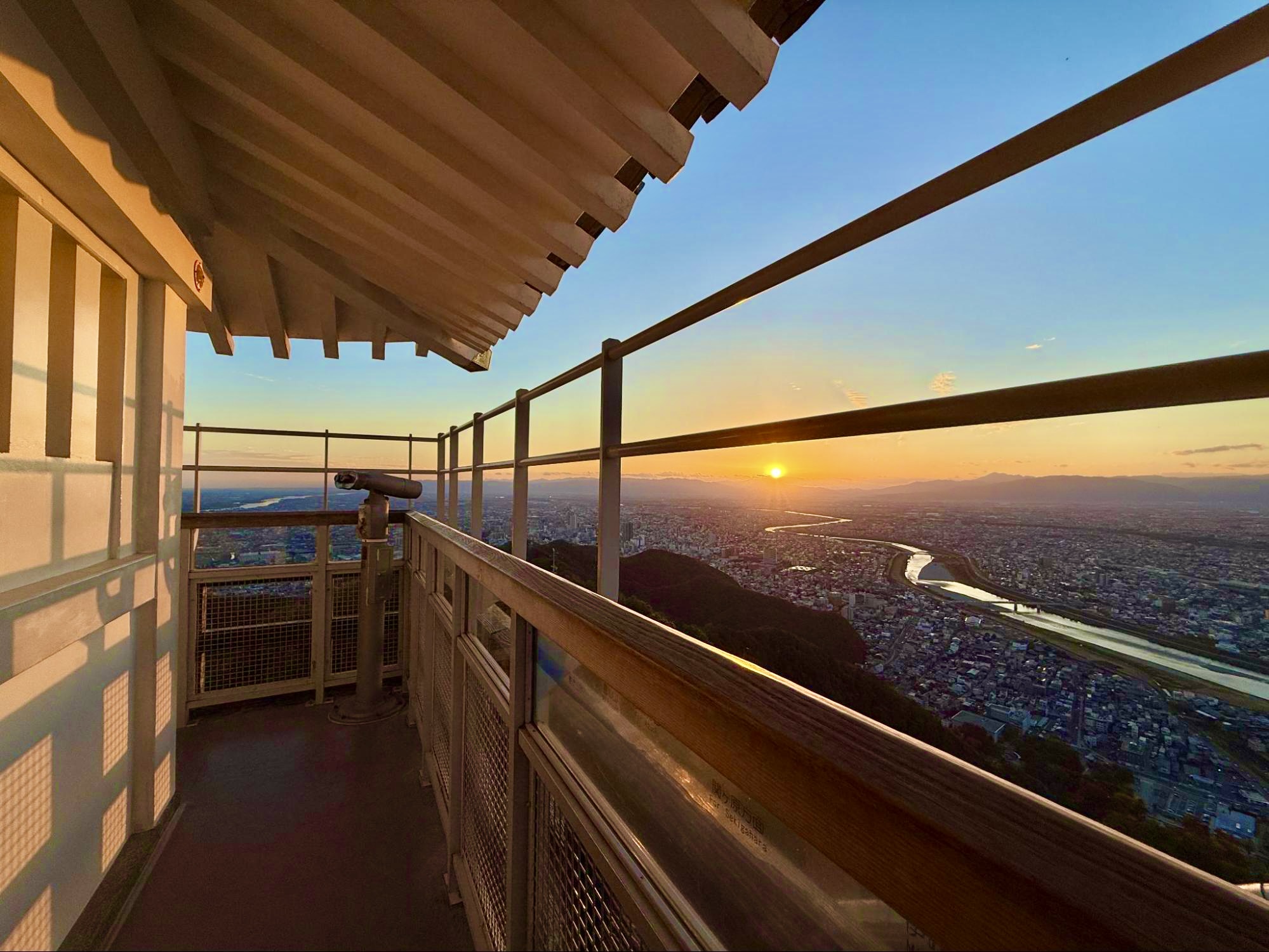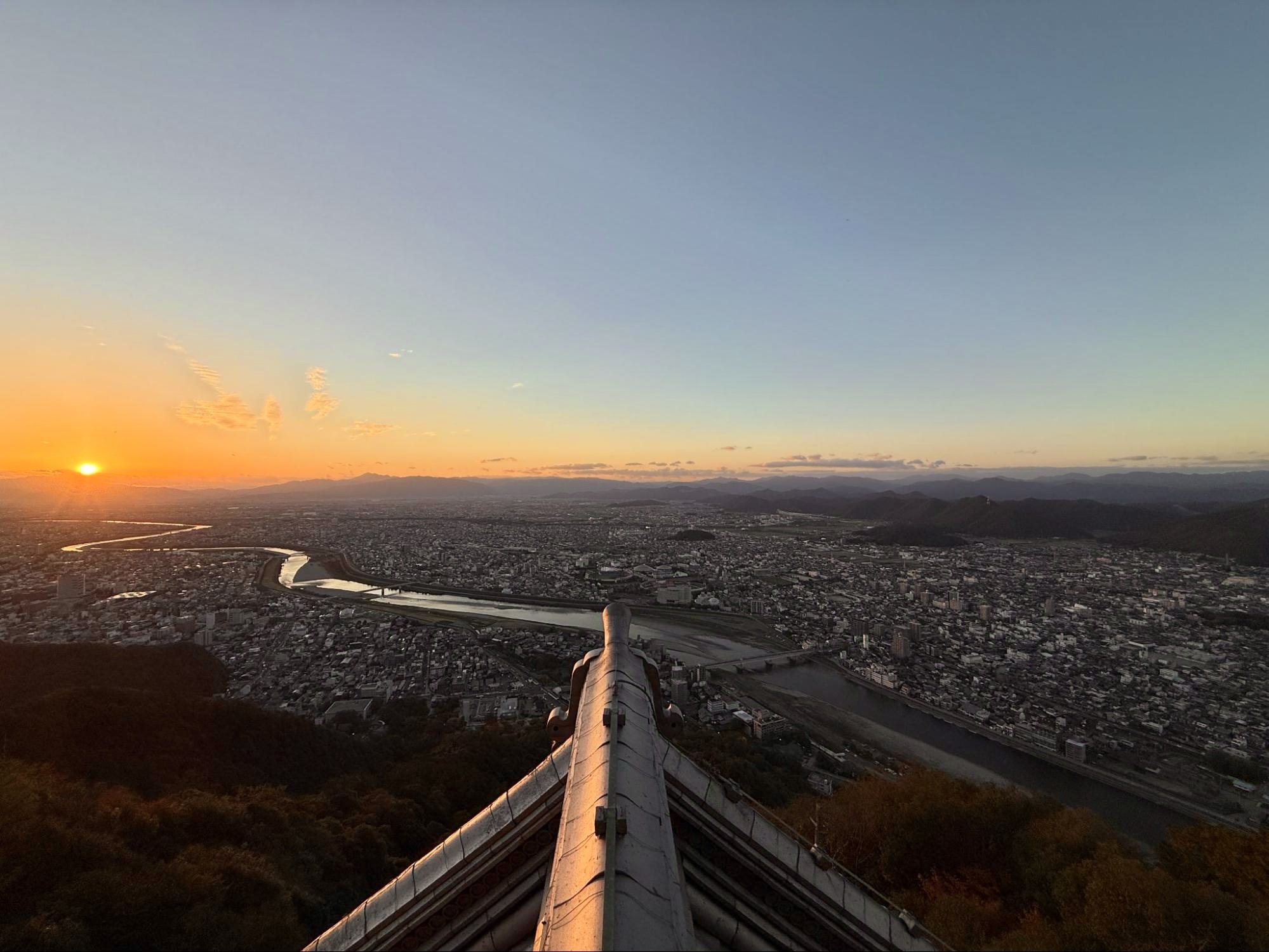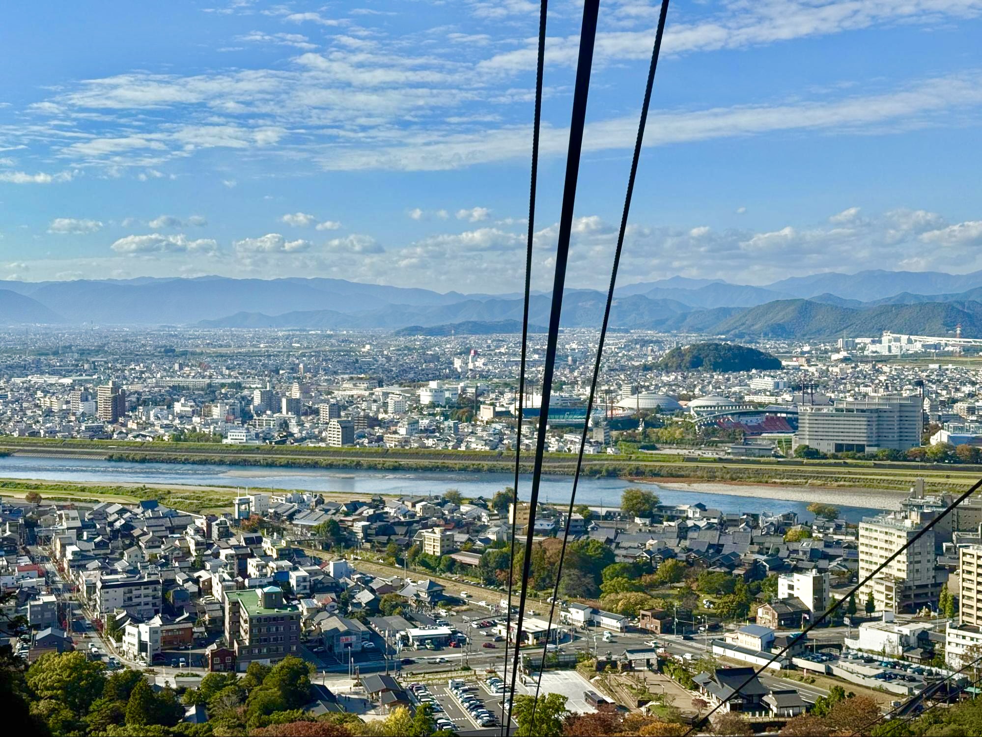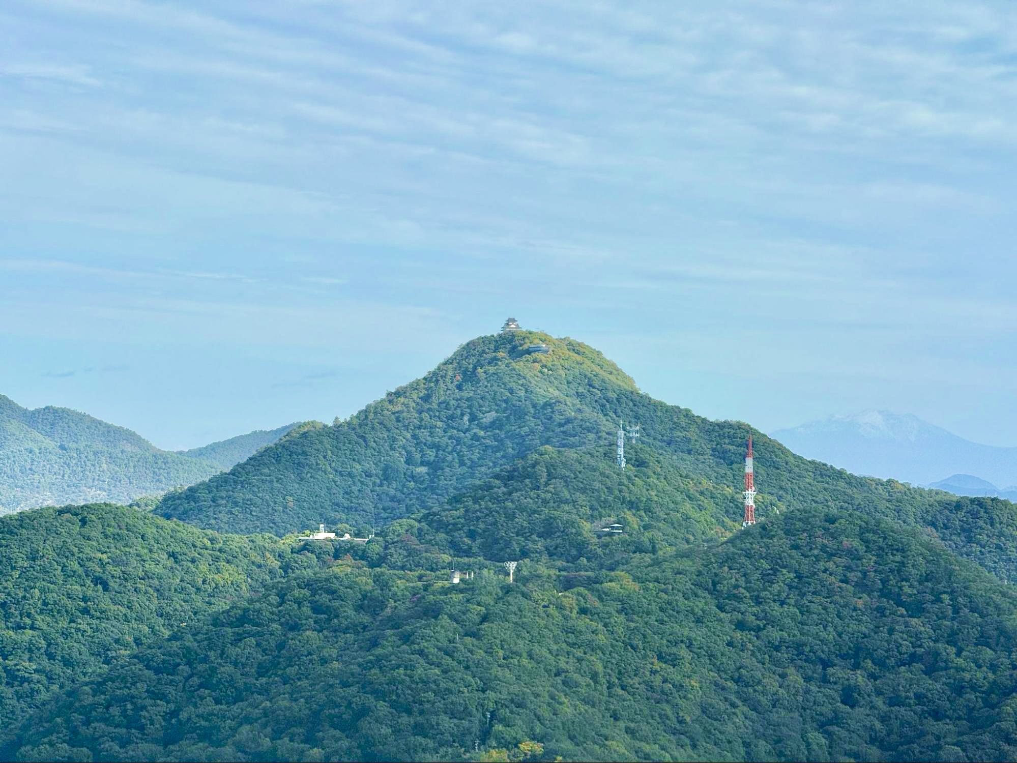 從這個高度望出去,城市與群山之間的光影層層疊疊,腳下則是整齊的市景與川流不息的車流,金華山與長良川在眼前延伸,山的稜線與河流的曲線同時構成岐阜的輪廓。望向名古屋方向,遠方高樓群的影子若隱若現,讓人意識到這座城市與周邊地區的連結。