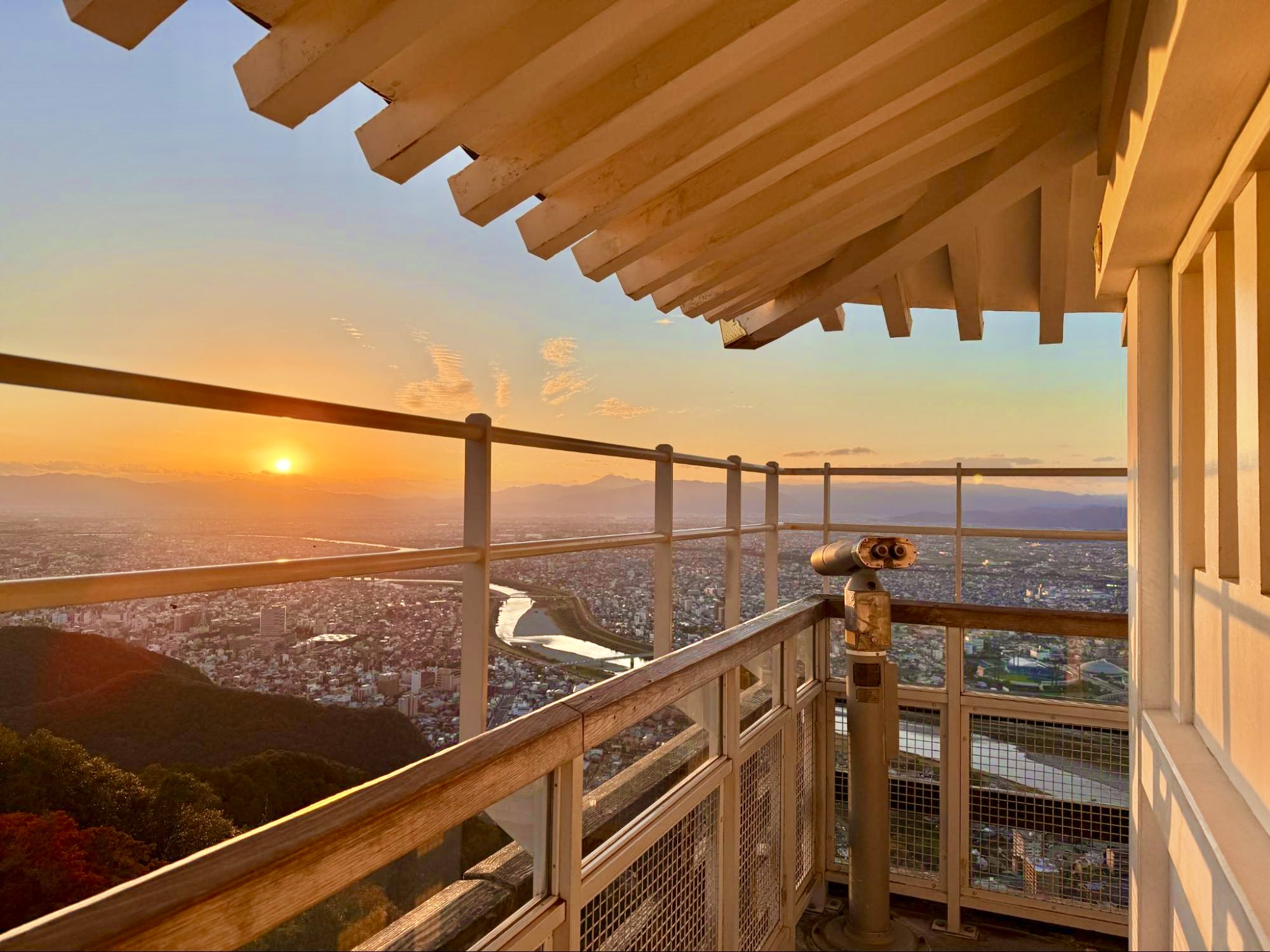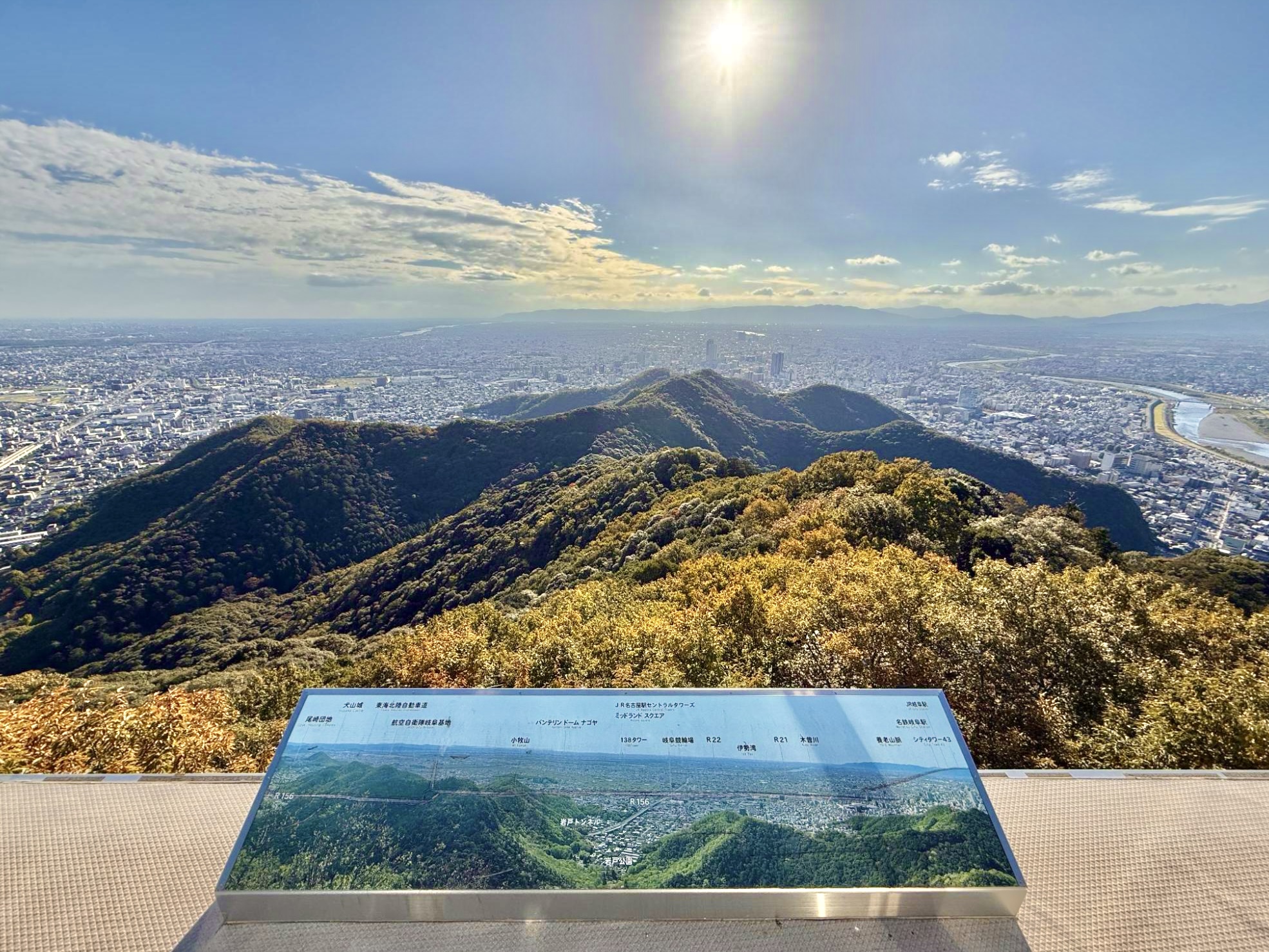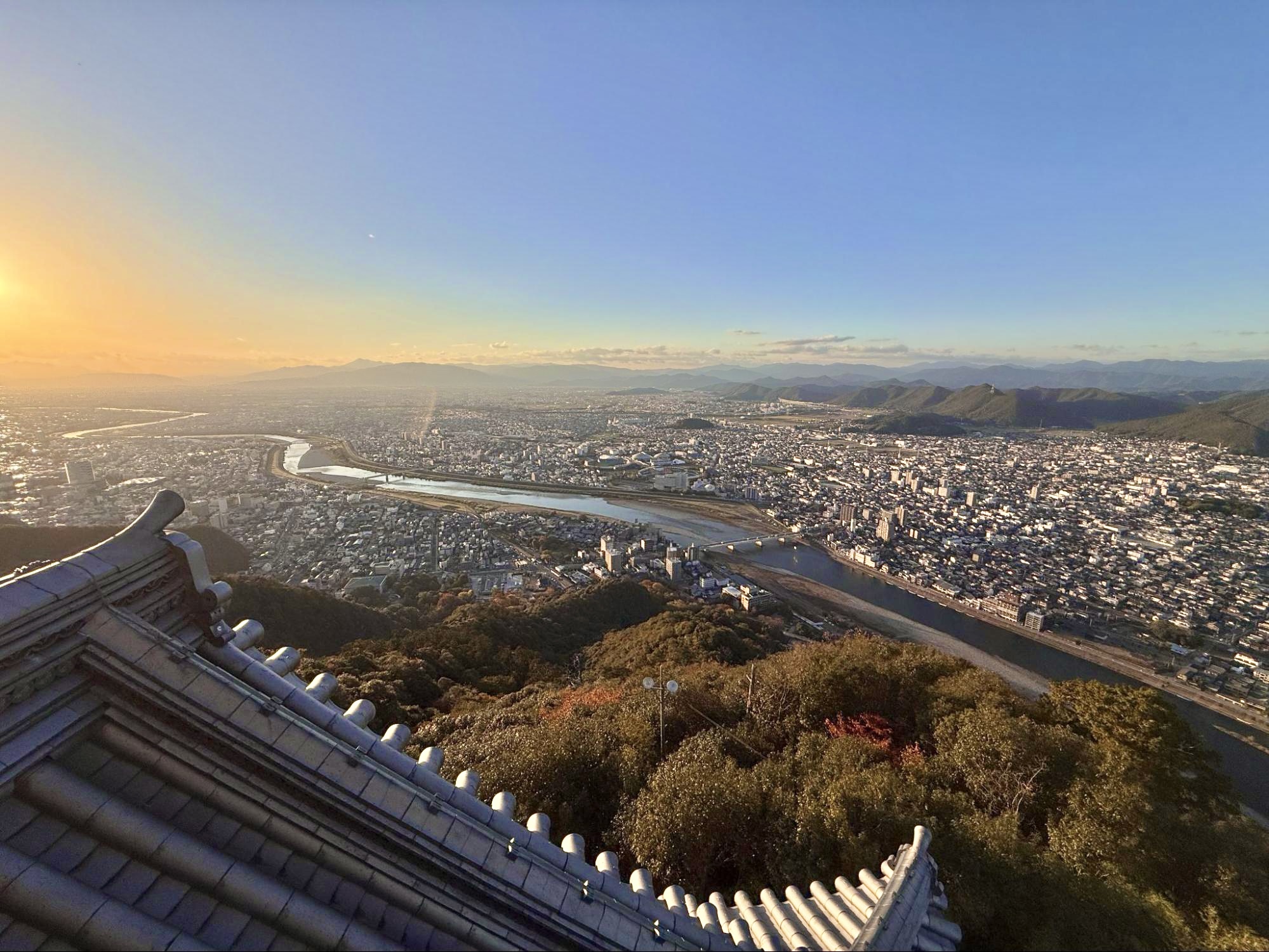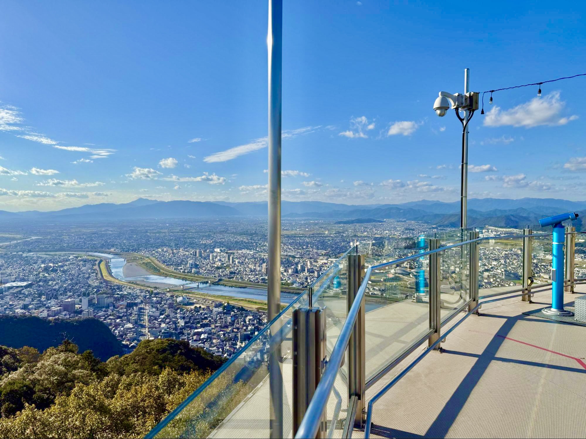 從這個高度望出去,城市與群山之間的光影層層疊疊,腳下則是整齊的市景與川流不息的車流,金華山與長良川在眼前延伸,山的稜線與河流的曲線同時構成岐阜的輪廓。望向名古屋方向,遠方高樓群的影子若隱若現,讓人意識到這座城市與周邊地區的連結。