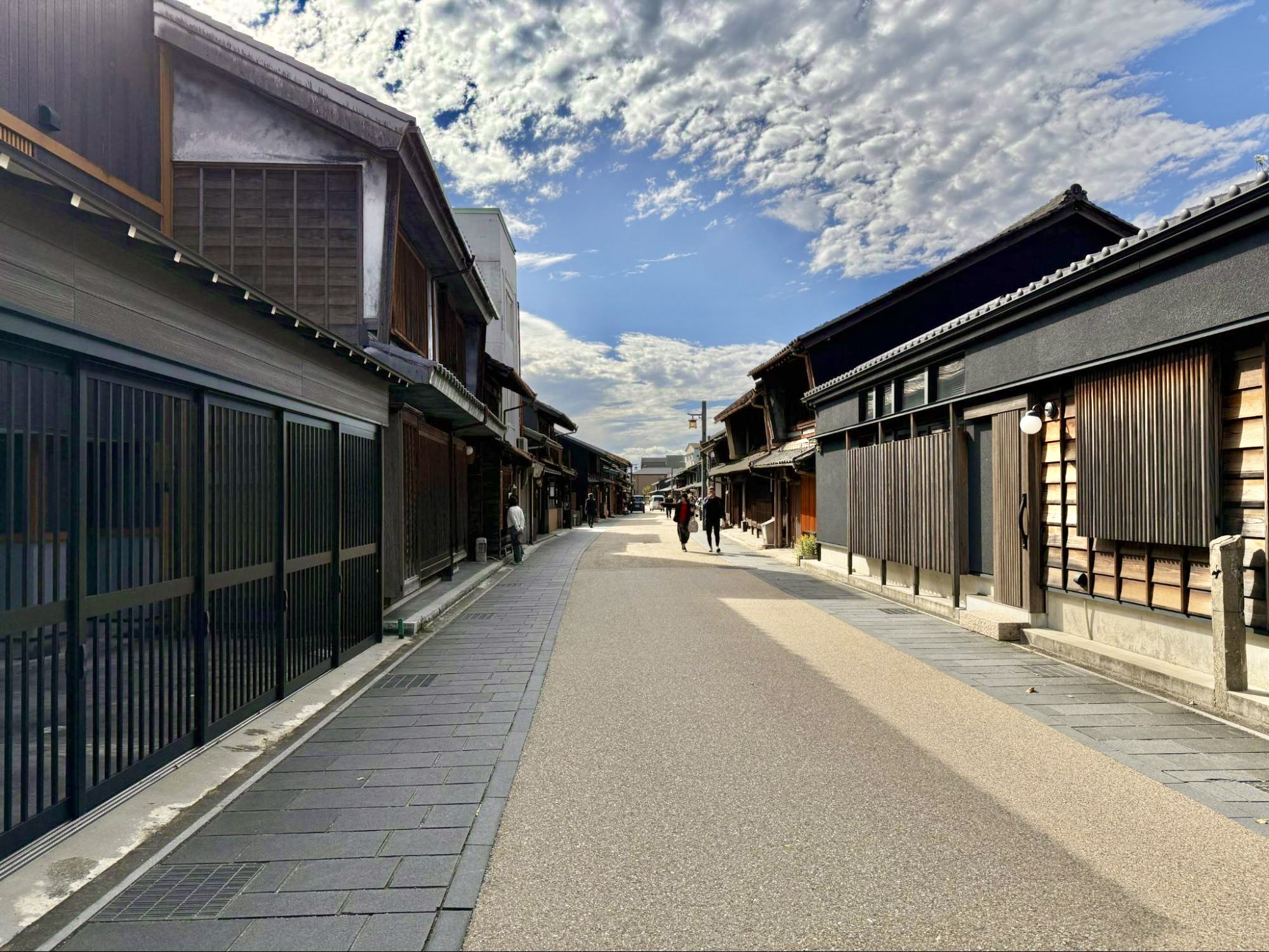 驅車沿著長良川前行,不久便能抵達保留舊時風貌的「川原町」。街道筆直而靜謐,兩旁排列著町家建築,木格子窗與土牆在陽光下泛著柔亮的色澤。一整排保存良好的屋舍,靜靜地訴說著舊時岐阜的風情。