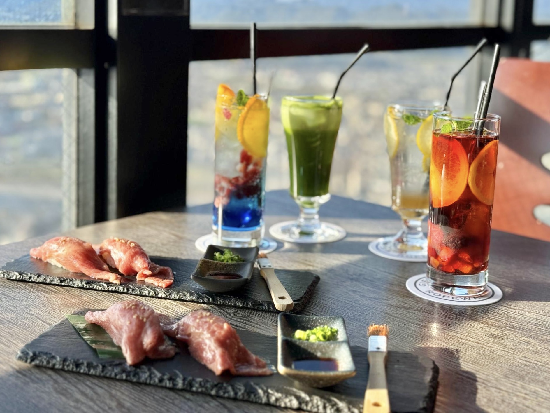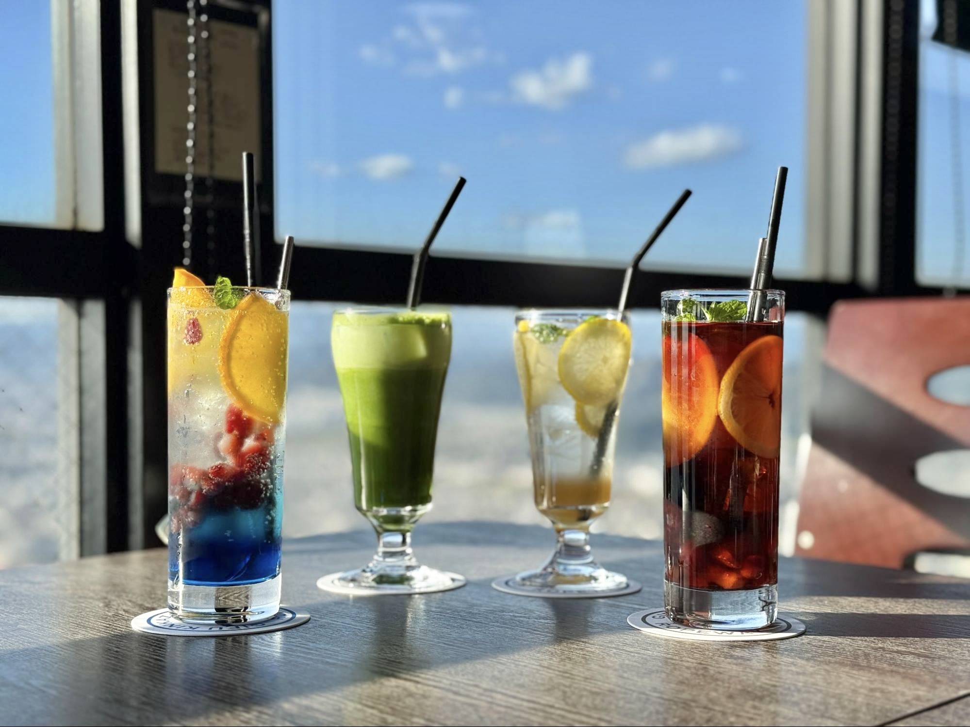 展望台旁,是能眺望整座城市美景的餐廳「Le Pont de Ciel(ル・ポン・ドゥ・シェル)」。大片玻璃窗將山風與陽光引入室內,坐在窗邊就像置身空中,岐阜市、長良川、飛驒山脈全部呈現在眼前。當地人推薦我一定要試試「信長抹茶拿鐵」與「薑汁汽水」,果然都超乎預期地好喝。