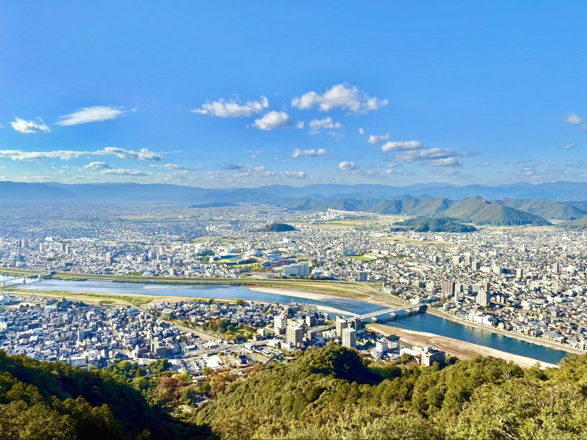 天空藍得乾淨透亮,陽光落在層層起伏的山巒與長良川上,河面閃爍著光點,像是流動的銀河。站在這裡,真的有種時間被靜止、心被抓住的感覺。