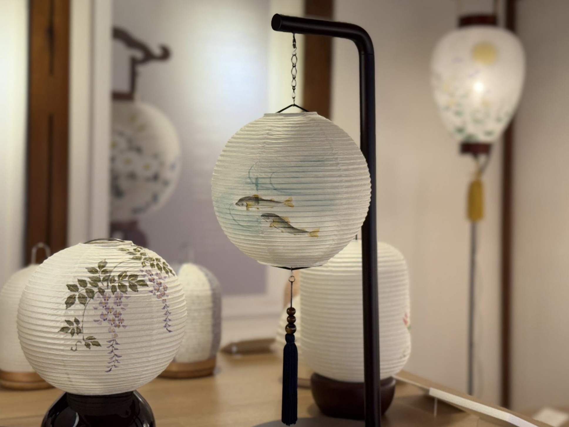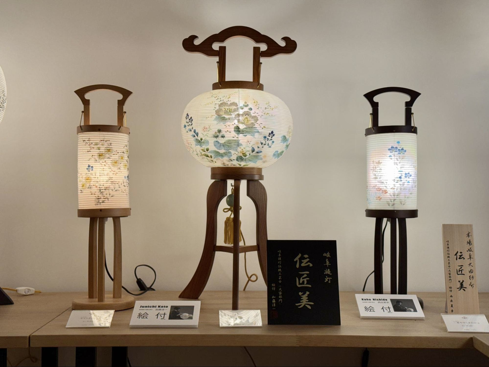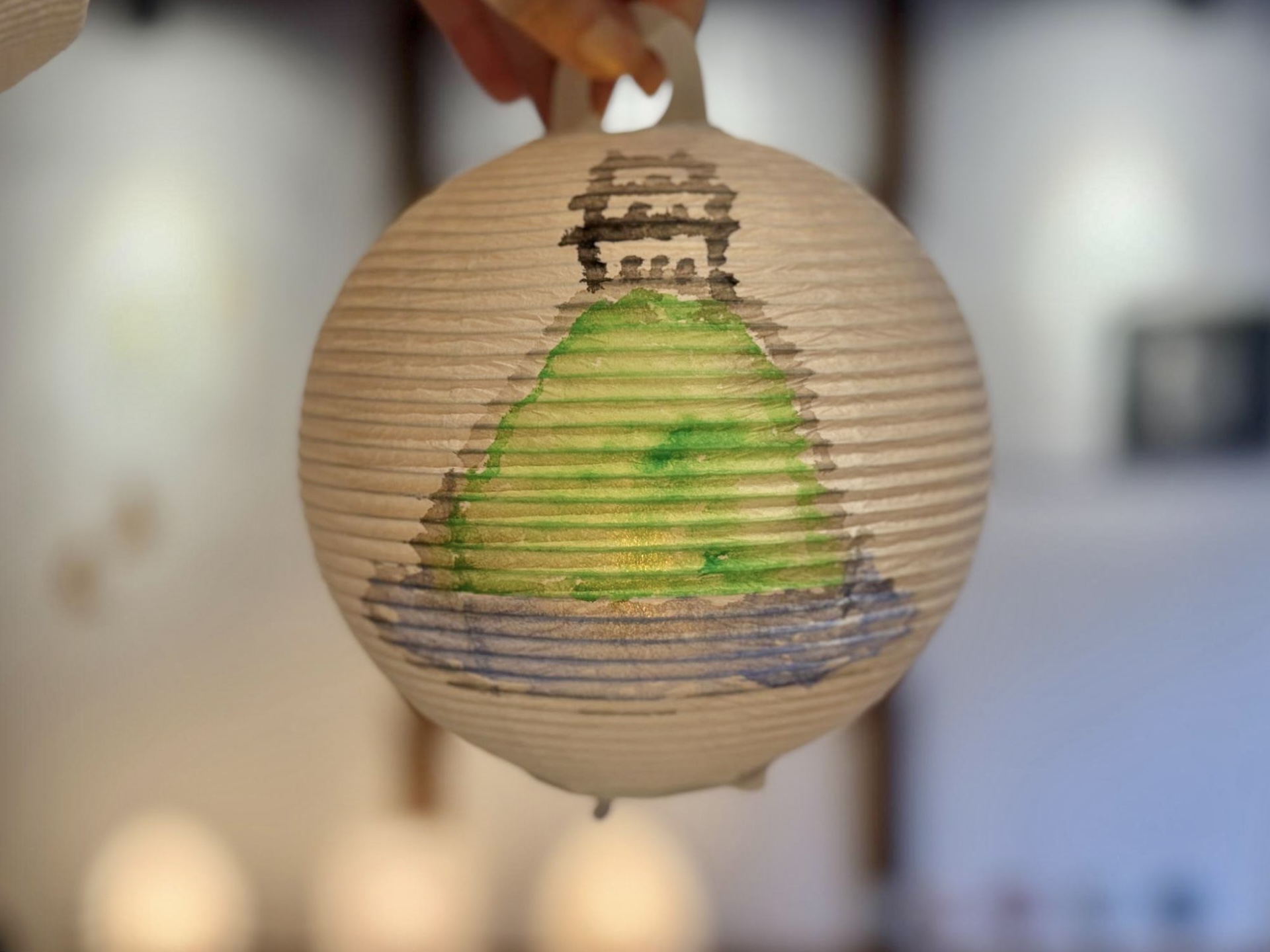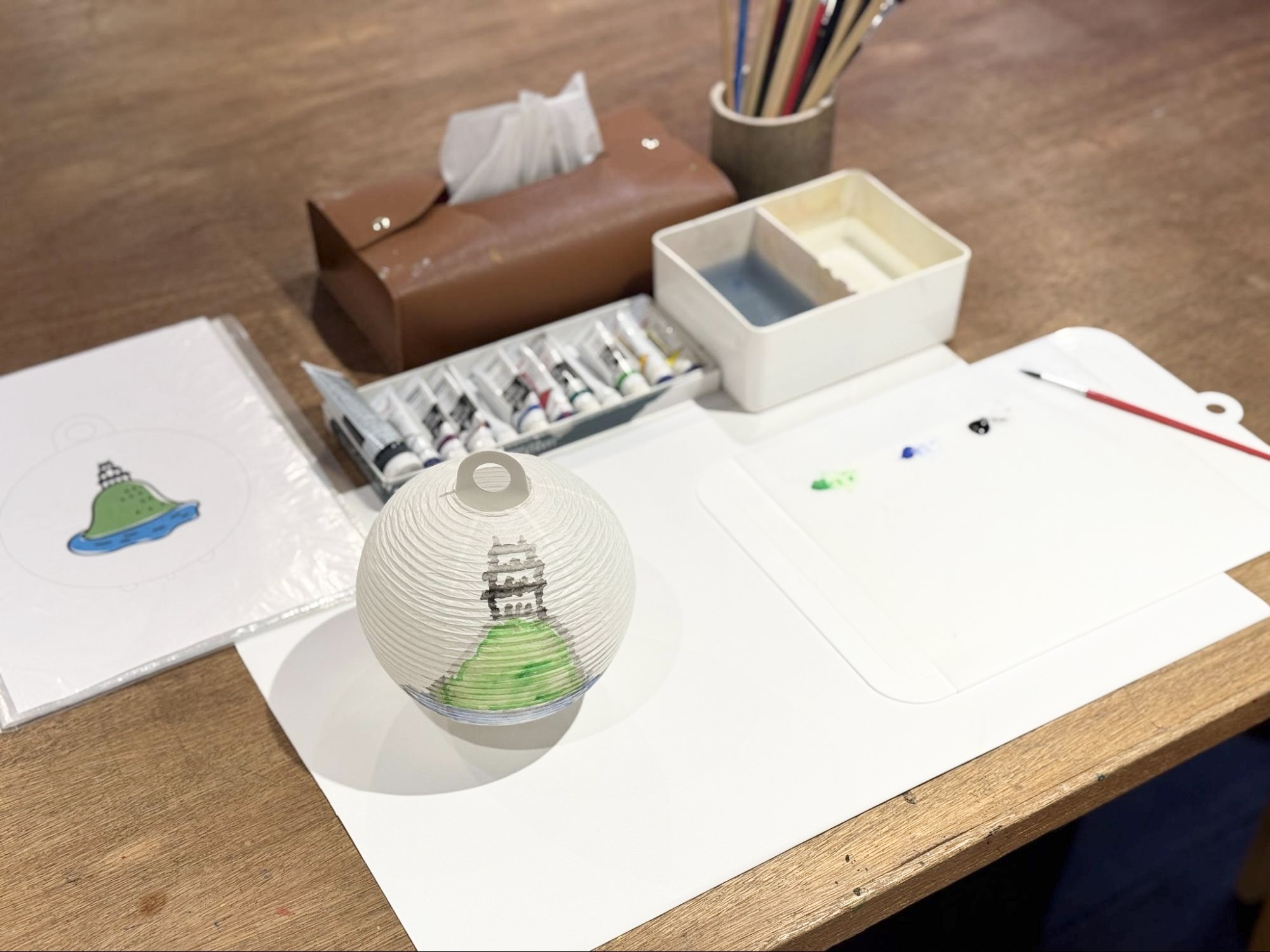 店員細心指導,顏料沾一點水,輕輕點到提燈上。於是我小心翼翼地握著筆,一筆一畫慢慢描繪。手作的溫度在指頭流動,筆尖落在和紙上,專注的感覺比想像中更療癒。隨著色彩逐漸呈現在燈面上,金華山的曲線與岐阜城的輪廓浮現,旅途的記憶也有了實際的形狀。