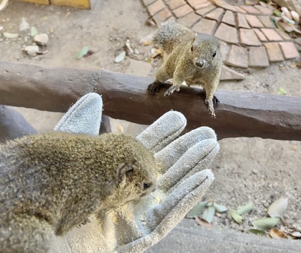 入口處先消毒雙手、戴上手套,工作人員把少量的飼料放在我的掌心。才剛準備好,一隻小松鼠就輕巧地跳到我手上,接著一隻又一隻往我身上跳,直接爬滿我全身,我已經很興奮,想不到松鼠比我還興奮!