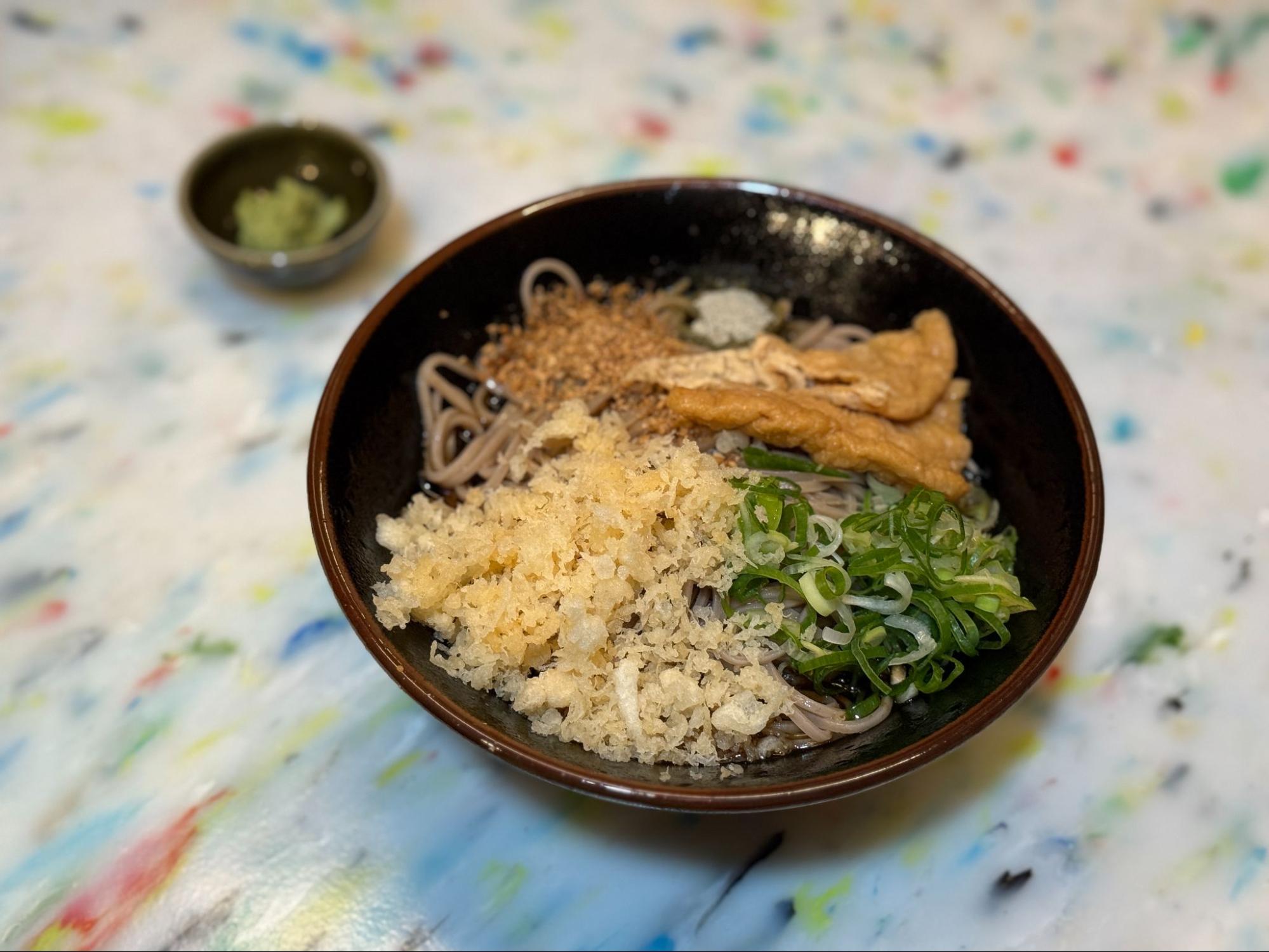 點了店裡的招牌料理「たぬき蕎麥麵(tanuki soba)」,冰涼的蕎麥麵上鋪滿香脆的天婦羅碎與青蔥,與微甜的醬汁攪拌均勻後即可享用。這是我第一次品嚐冷的蕎麥麵,加上芥末的清爽辛味,意外地非常合我胃口,一吃就喜歡上了。