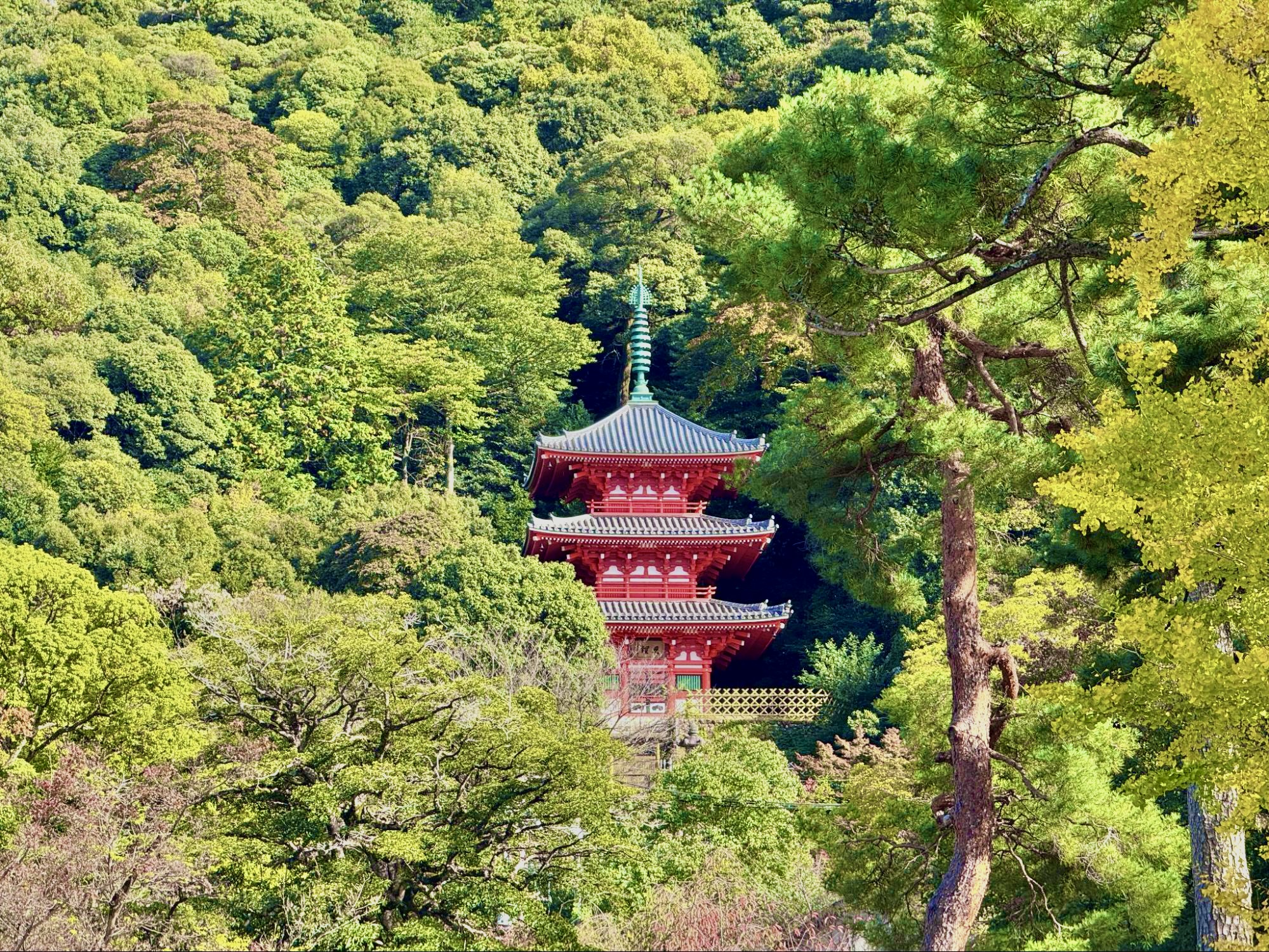 從岐阜城樂市望去,「三重塔」矗立在綠意之間。