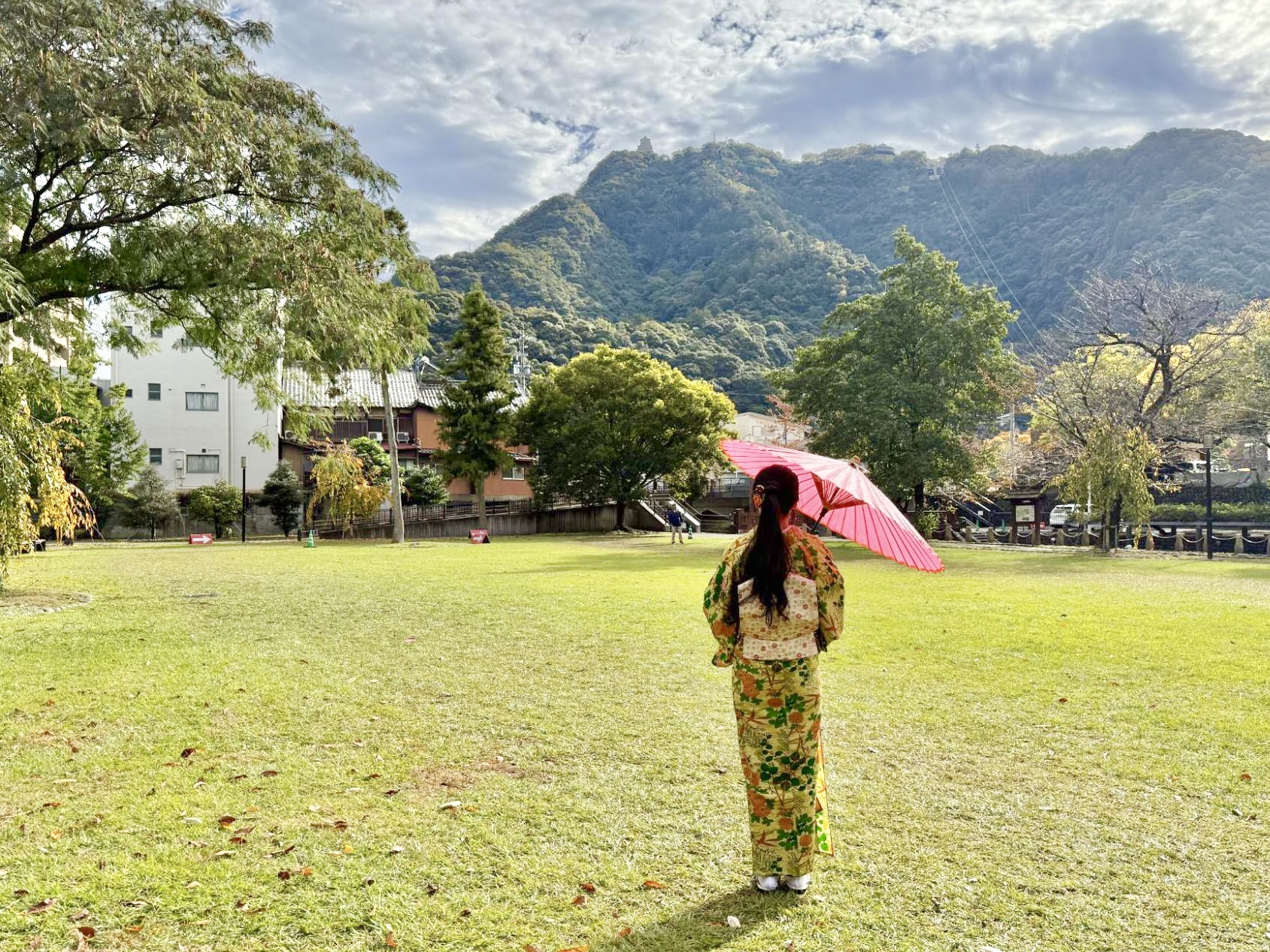 穿著和服、撐著和傘,我在川原町的老街漫步。陽光灑落,光影在傘面上流轉,衣袖也隨風微動。不遠處有座小公園,順著石板路走進去,從公園抬頭望,金華山的山頂清楚地映入眼簾,岐阜城在蔚藍天空下更顯雄偉。