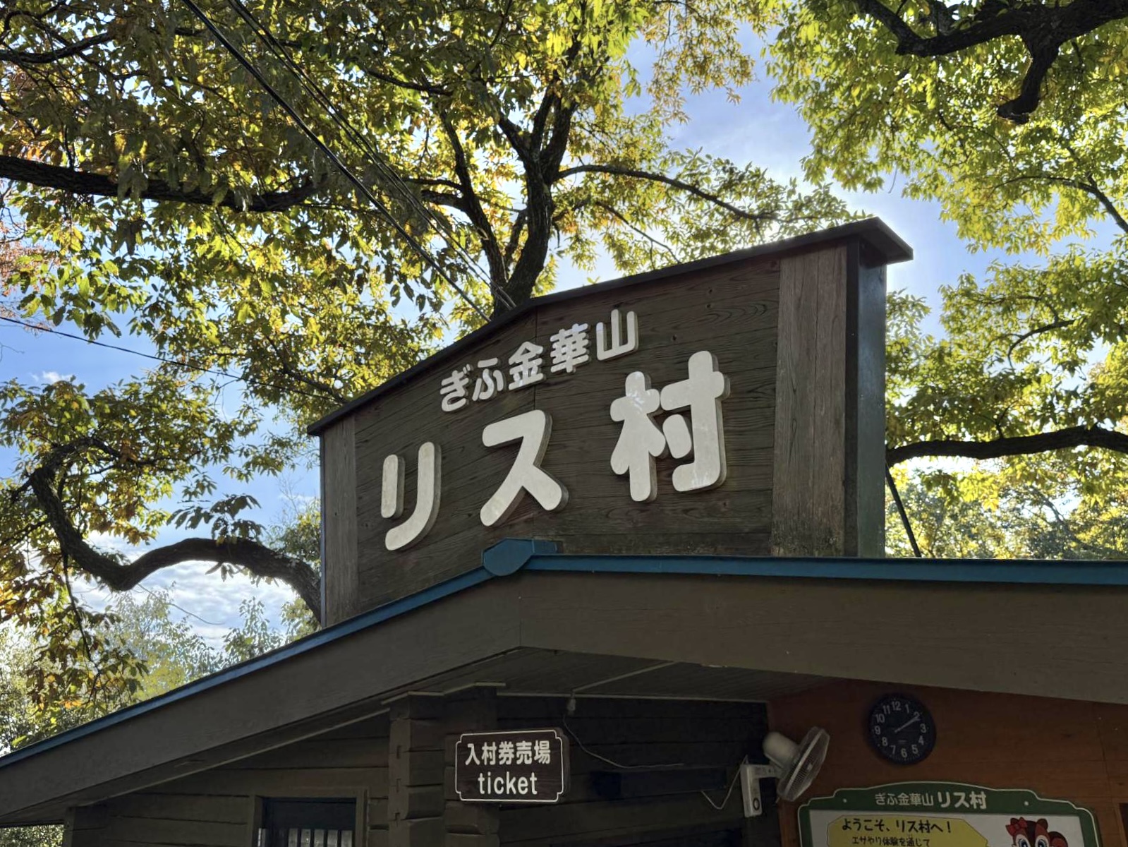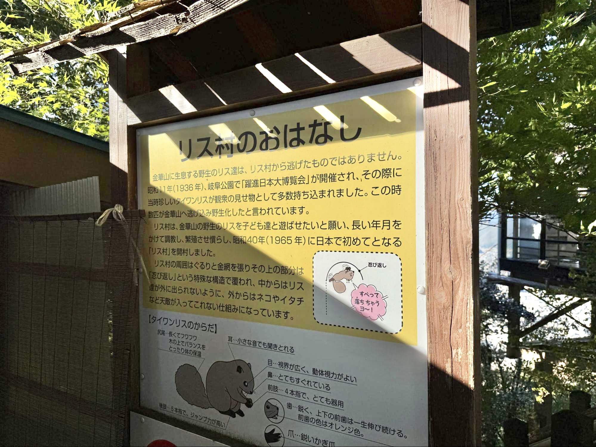 抵達金華山山頂後,小招牌吸引了我的注意,寫著「金華山松鼠村(ぎふ金華山リス村)」。原本並沒有把這裡列入行程,沒想到山頂上竟然有這樣的設施,於是我帶著興奮的心情走了進去。