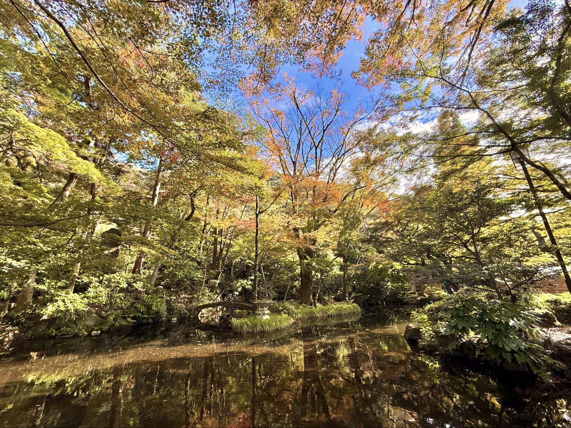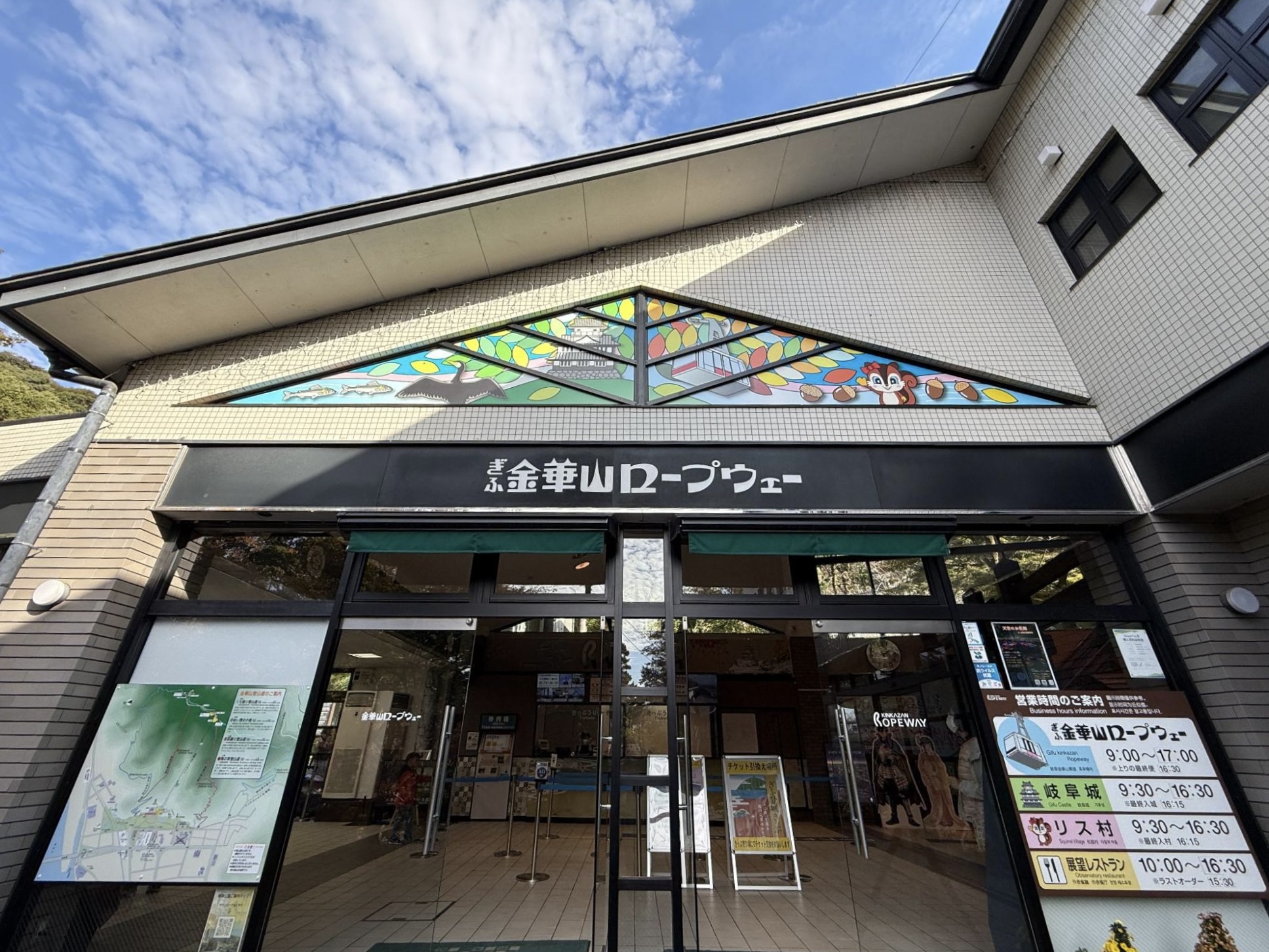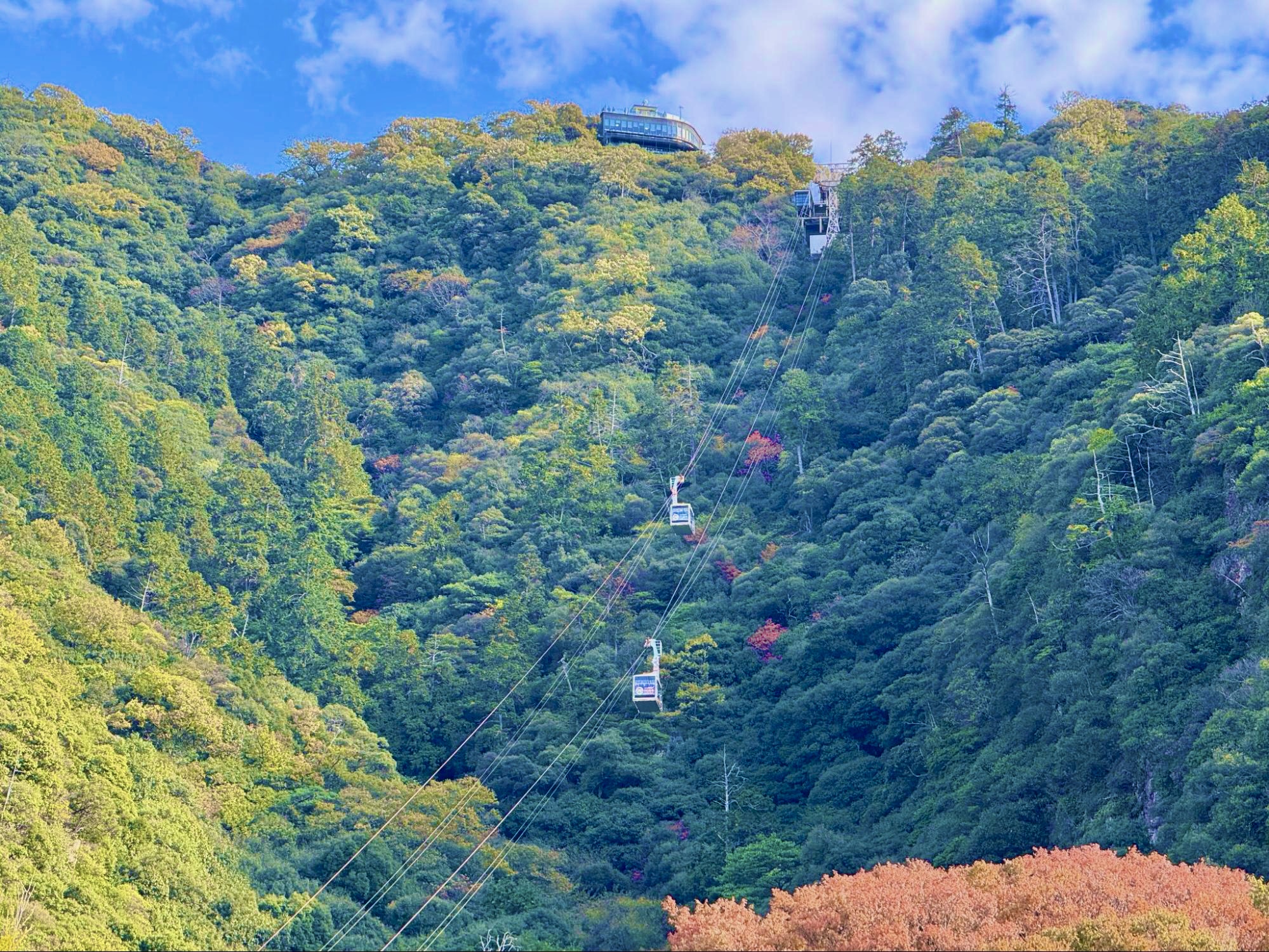 纜車緩緩升起,視野開始一點一點拉開。這時的紅葉還沒滿開,但山林間零星的色塊已讓人心醉。我忍不住想像,若滿開時,整座金華山會是怎樣的壯觀?冬日飄雪時,纜車穿梭在白色樹海又會是什麼模樣?春天是否也能看見櫻花在山谷間綻放?