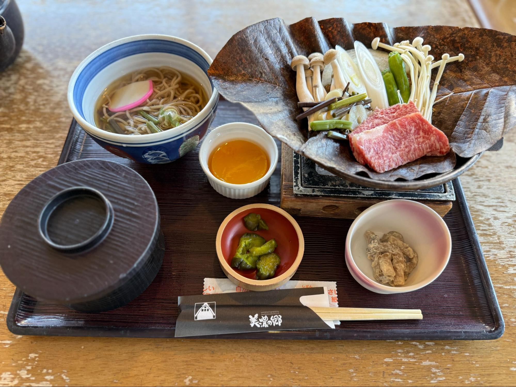 如果喜歡牛肉,也很推薦「朴葉味噌定食」。主食換成朴葉上烤得香氣四溢的牛肉,烏龍麵變成蕎麥麵,其他配菜同樣紮實,是讓人想再訪的理由。
