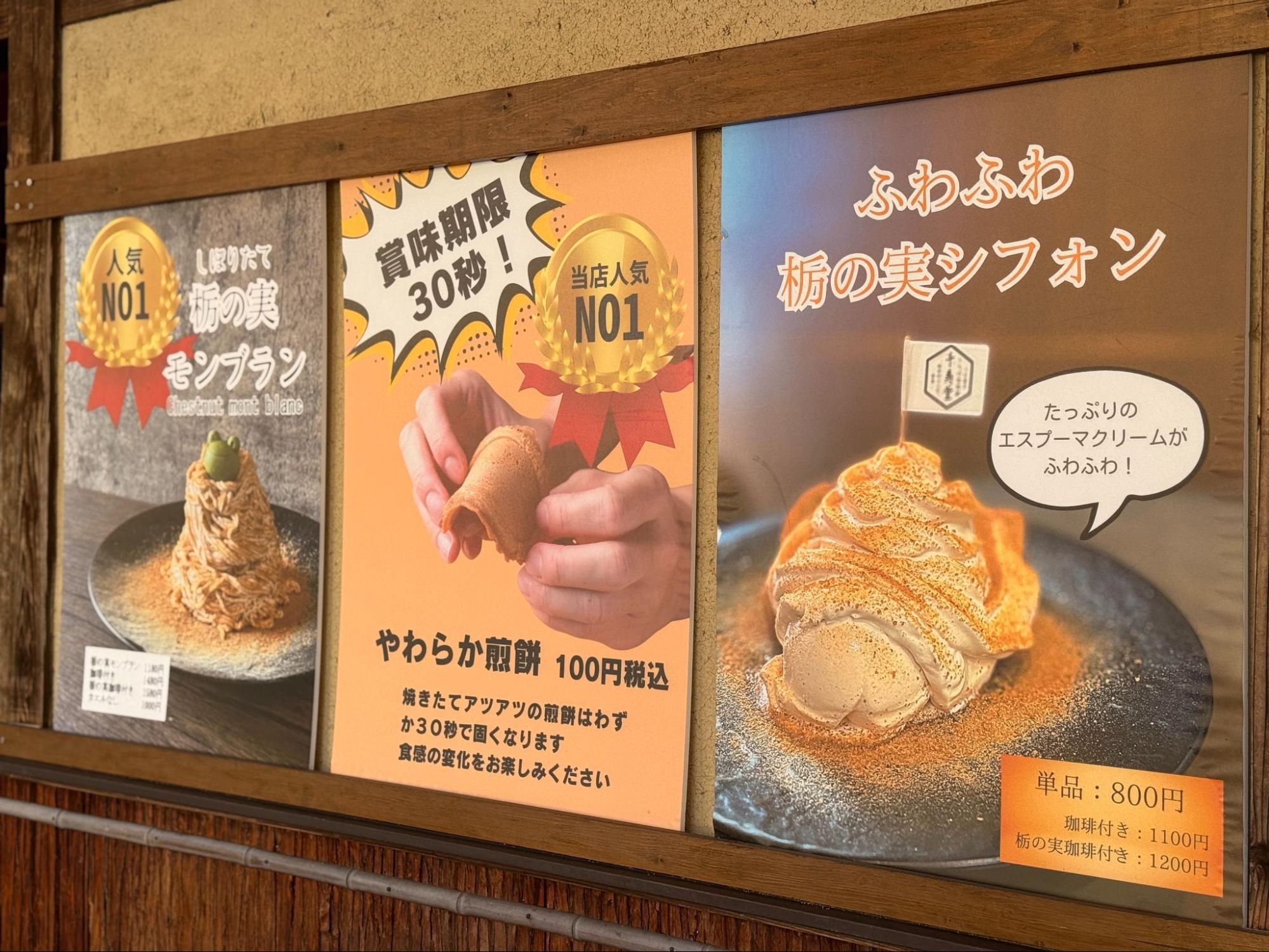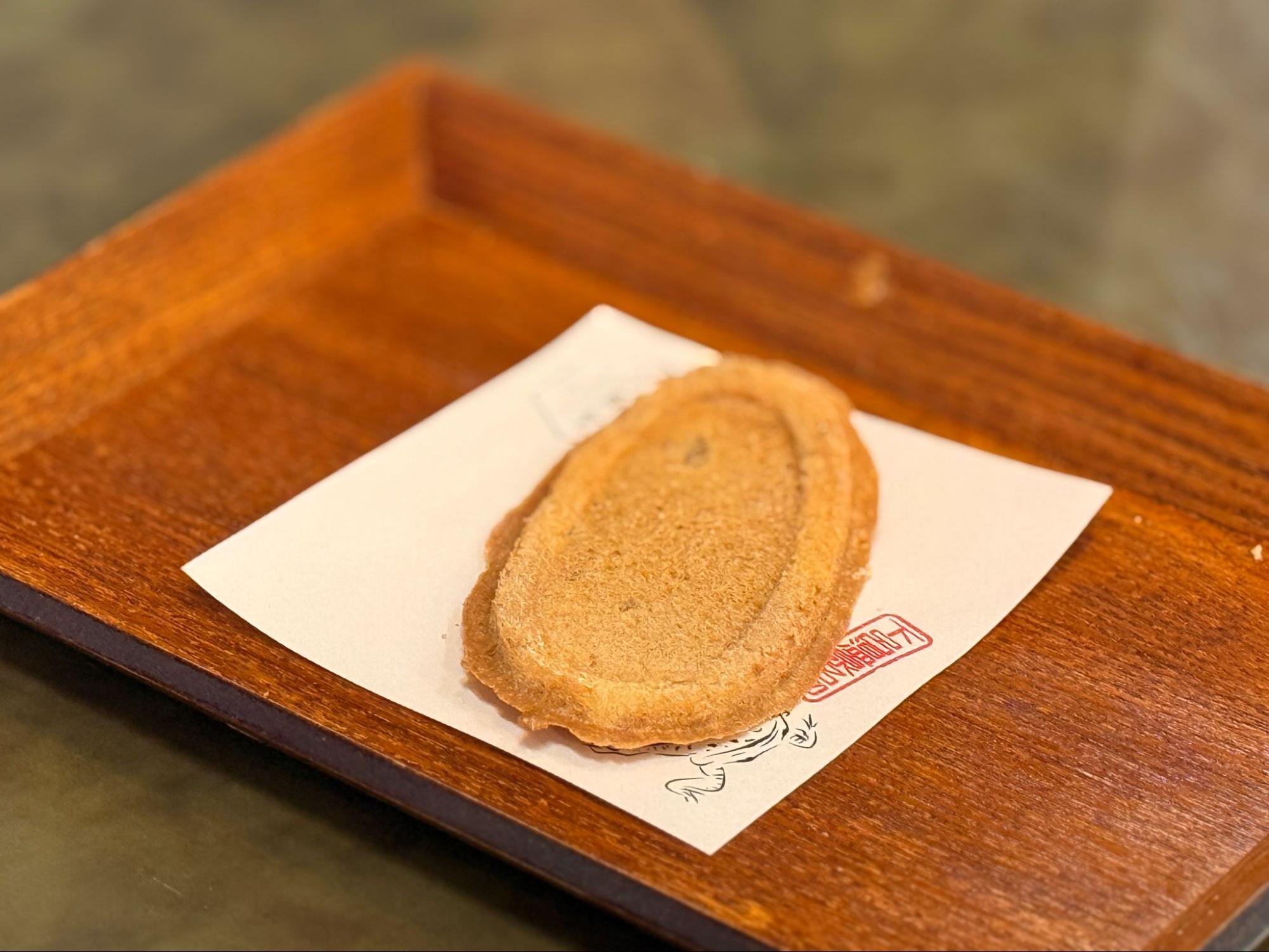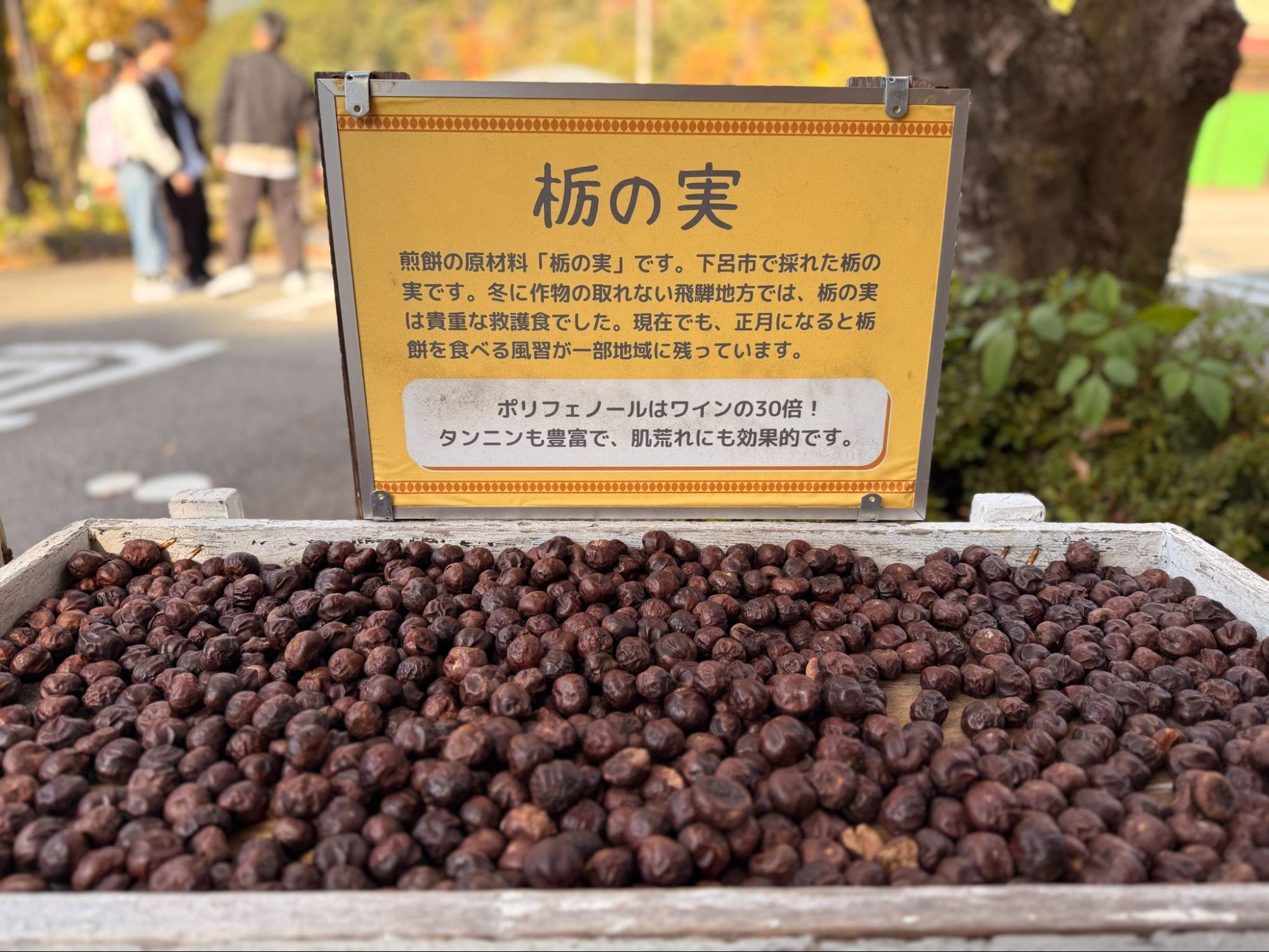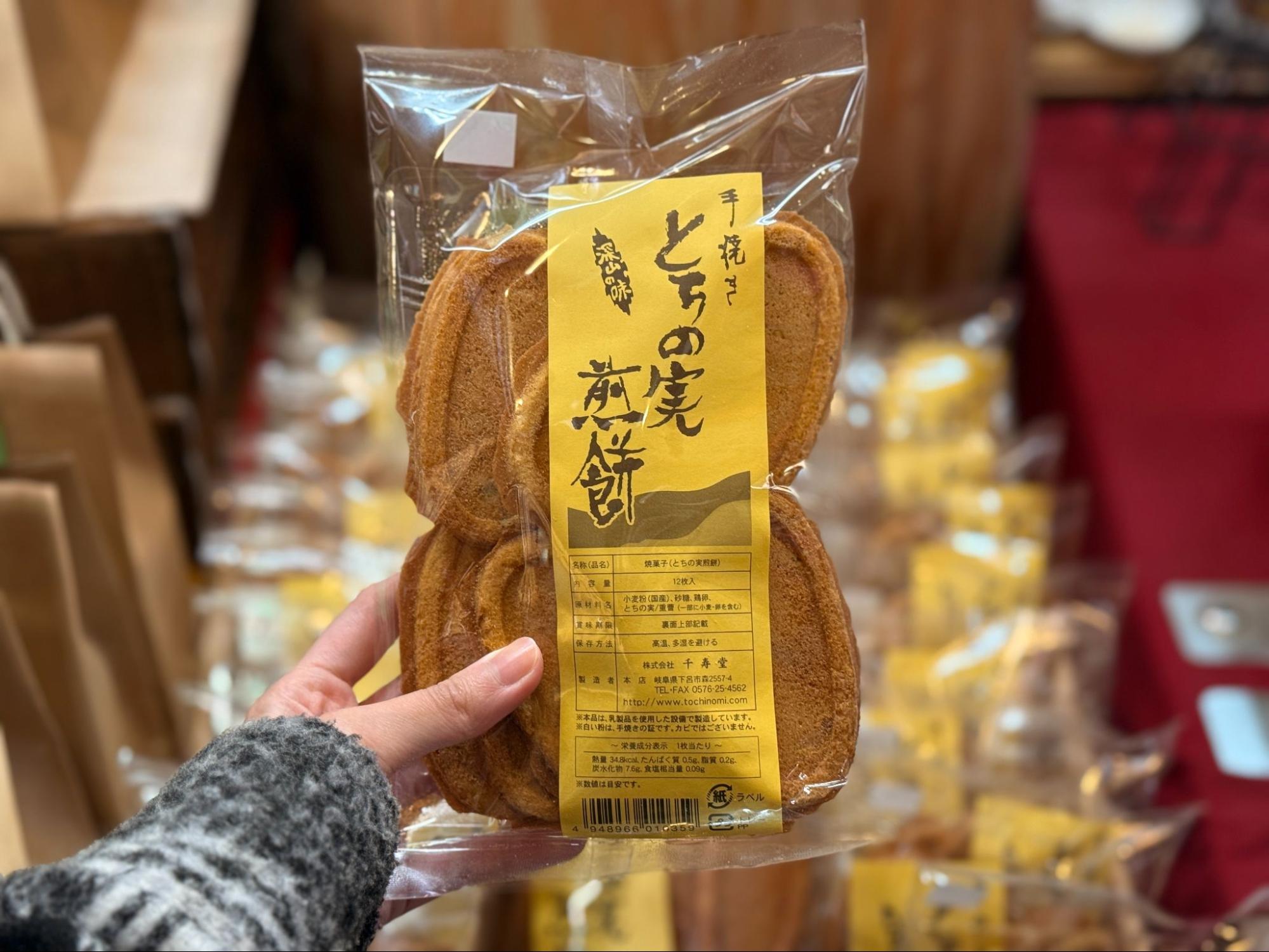 逛完朝市後,推薦可以到旁邊的小店,是在地人超級推薦的「七葉樹果實煎餅 千壽堂(とちの実煎餅 千寿堂)」。使用下呂產七葉樹果實製作的煎餅,賞味期限 30 秒!