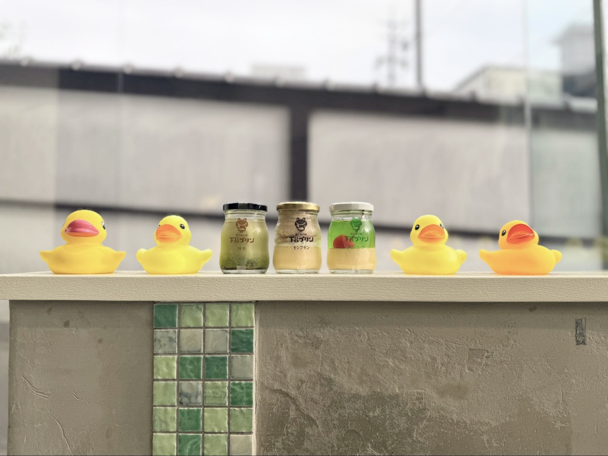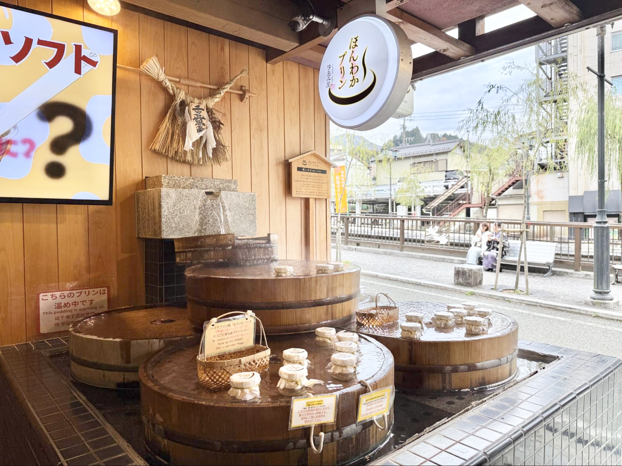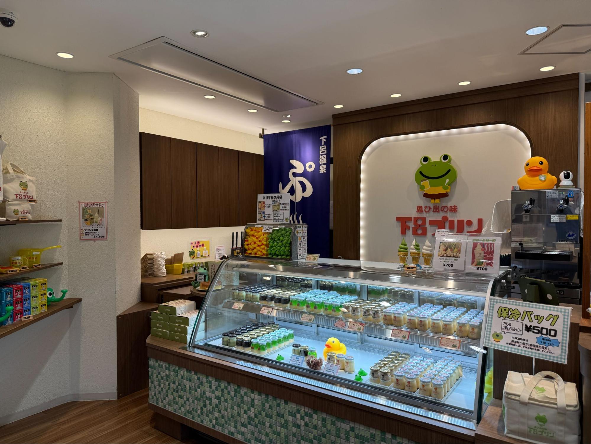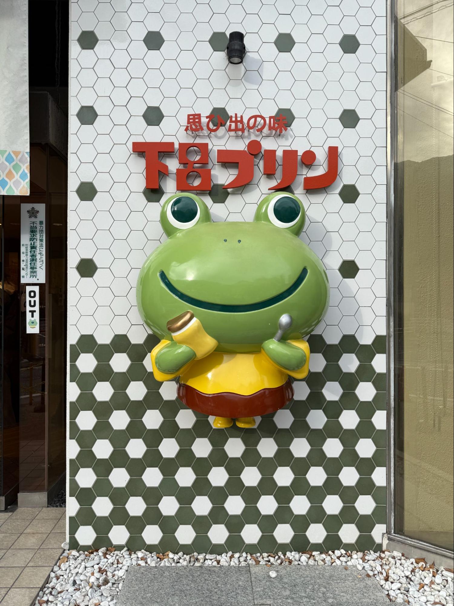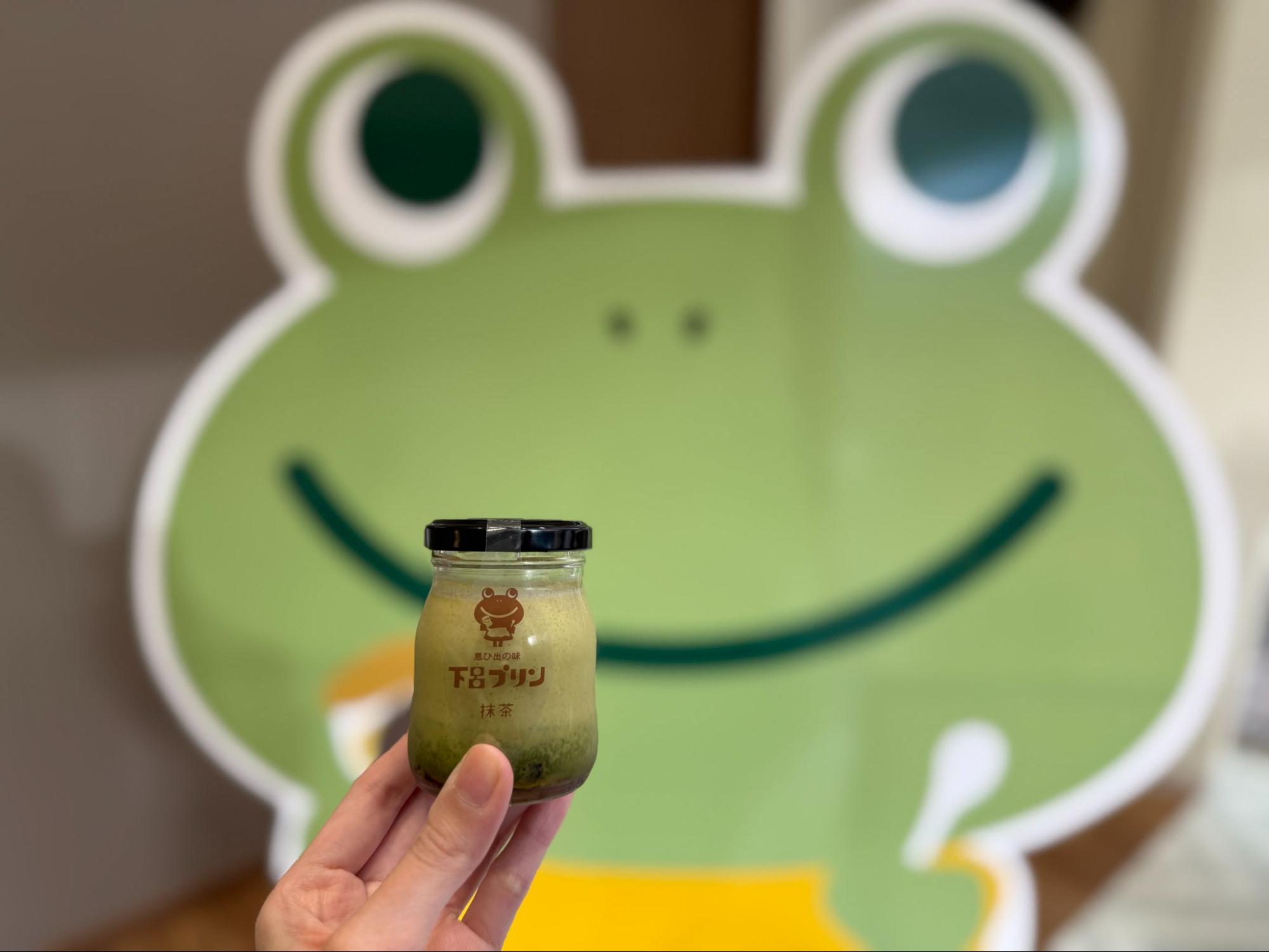 繼續漫遊,抵達「下呂布丁(下呂プリン)」的瞬間,會直接被店外那隻圓滾滾大眼睛的綠色青蛙療癒。