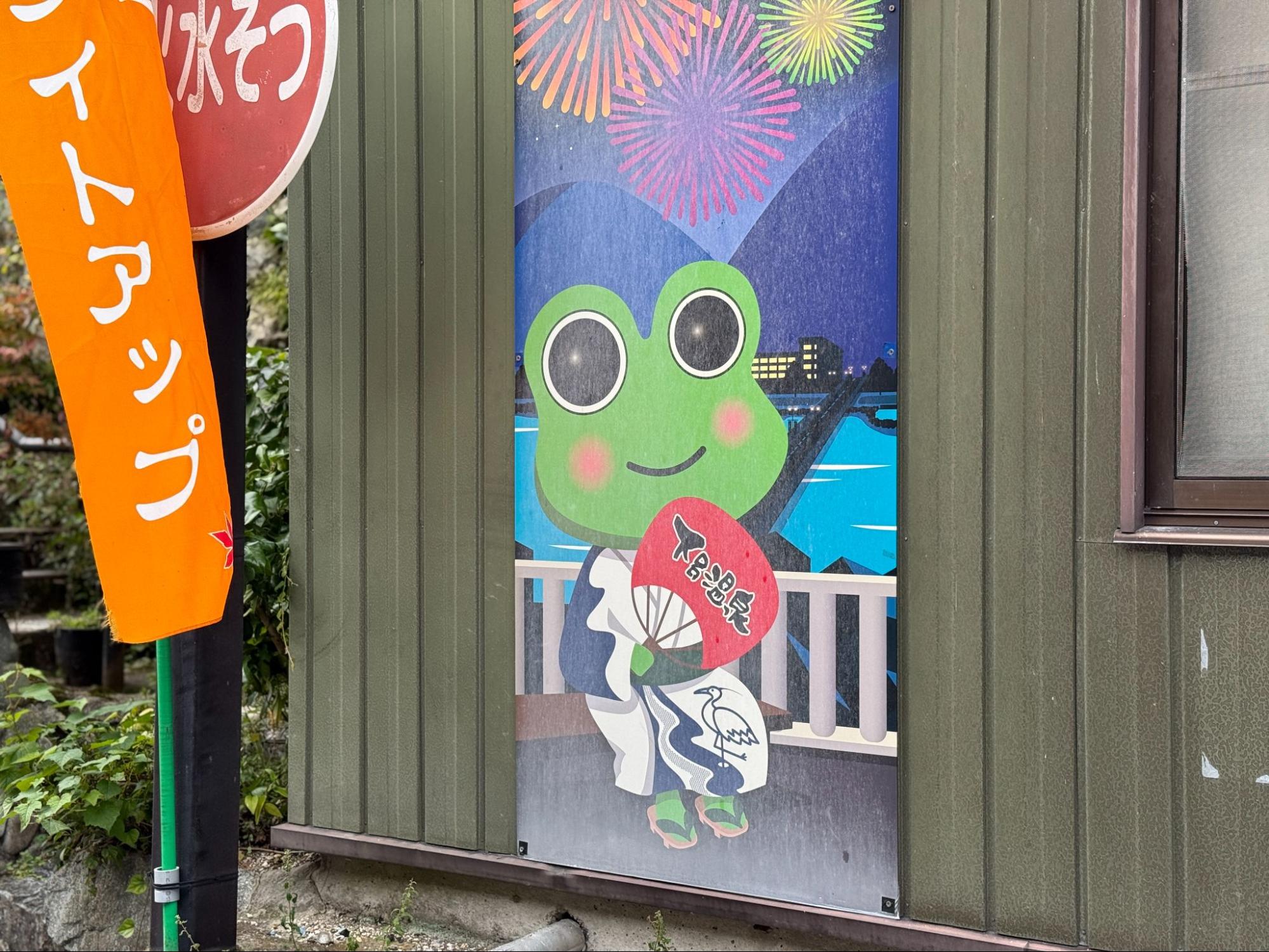 地面上的彩色圖案、商店的小招牌、牆上的插畫。可愛青蛙其實是下呂溫泉的官方吉祥物「青蛙君(げろぐるくん)」。亮綠的身體、圓滾滾的大眼睛,親切又療癒。