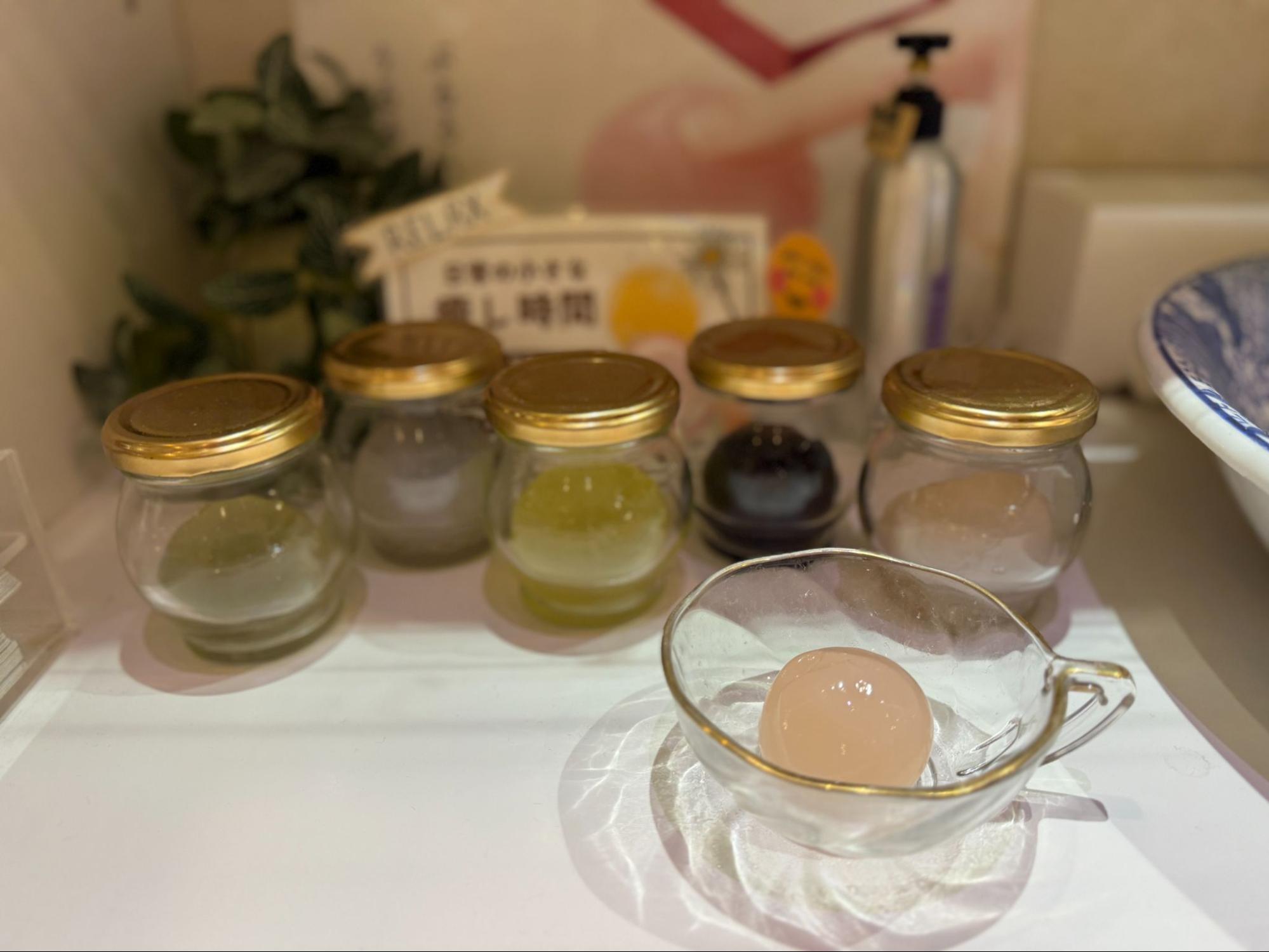 雖然我這次沒有品嚐甜點,不過伴手禮非常值得一逛。架上陳列著各式以溫泉為主題的商品,包括使用下呂溫泉水製作的「溫玉肥皂」、洗起來超綿密的「蒟蒻洗顏海綿」,都是人氣王。