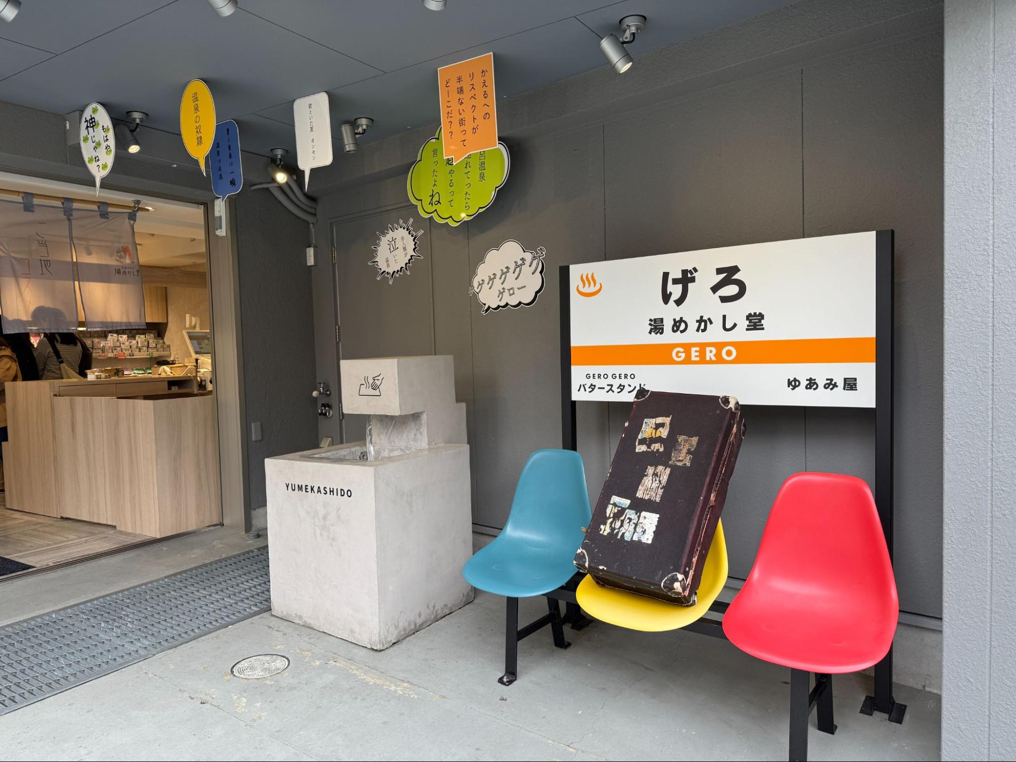 店門口排放著車站風格「下呂」站名的標示,還有可愛的行李箱,像是在對著旅人說:「歡迎光臨下呂!」經過時忍不住停下腳步,旅行魂瞬間被喚醒!
