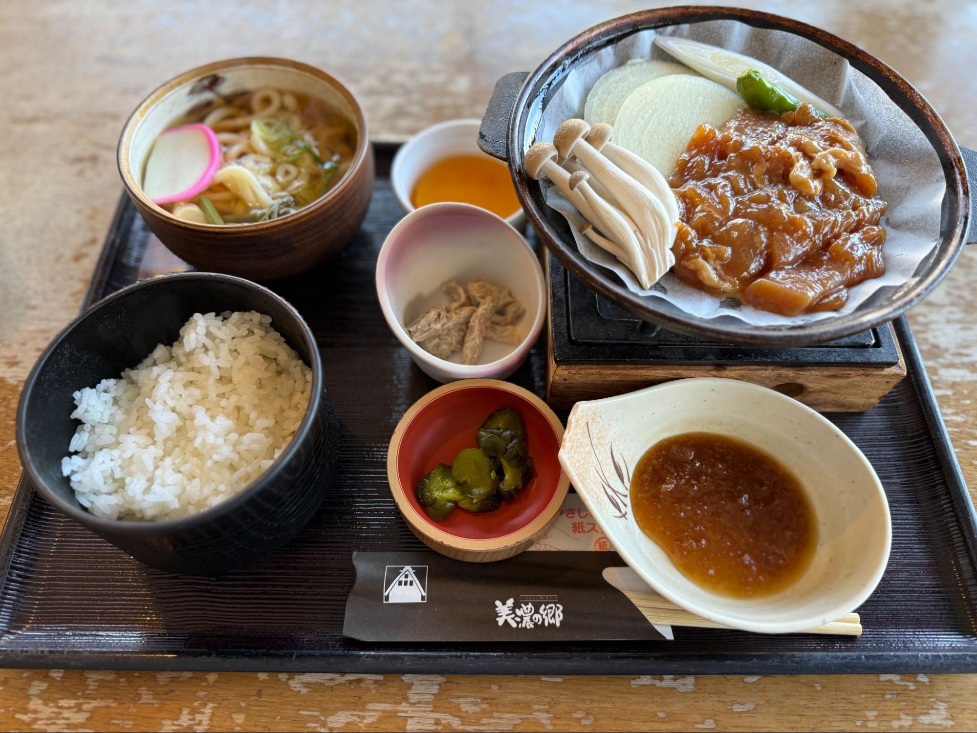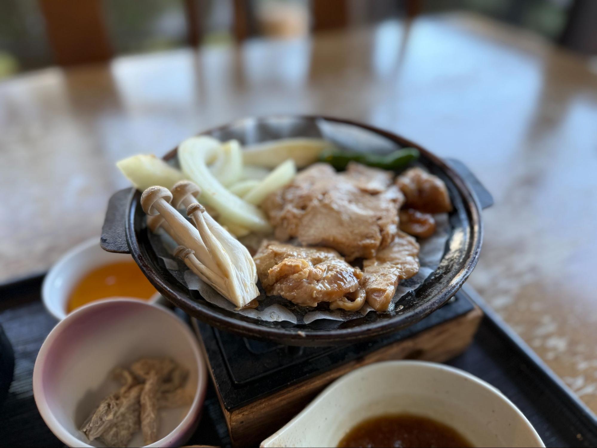 我想起多年前,曾在電視劇《孤獨的美食家》裡看到,五郎坐在下呂溫泉的小食堂裡,品嚐「雞醬(鶏ちゃん焼き)」跟「豚醬(とんちゃん)」的畫面,那是以雞肉或豬肉佐以味噌與蔬菜,在熱氣騰騰的鐵板上拌炒的家常料理,象徵著下呂人樸實又溫熱的生活風景。